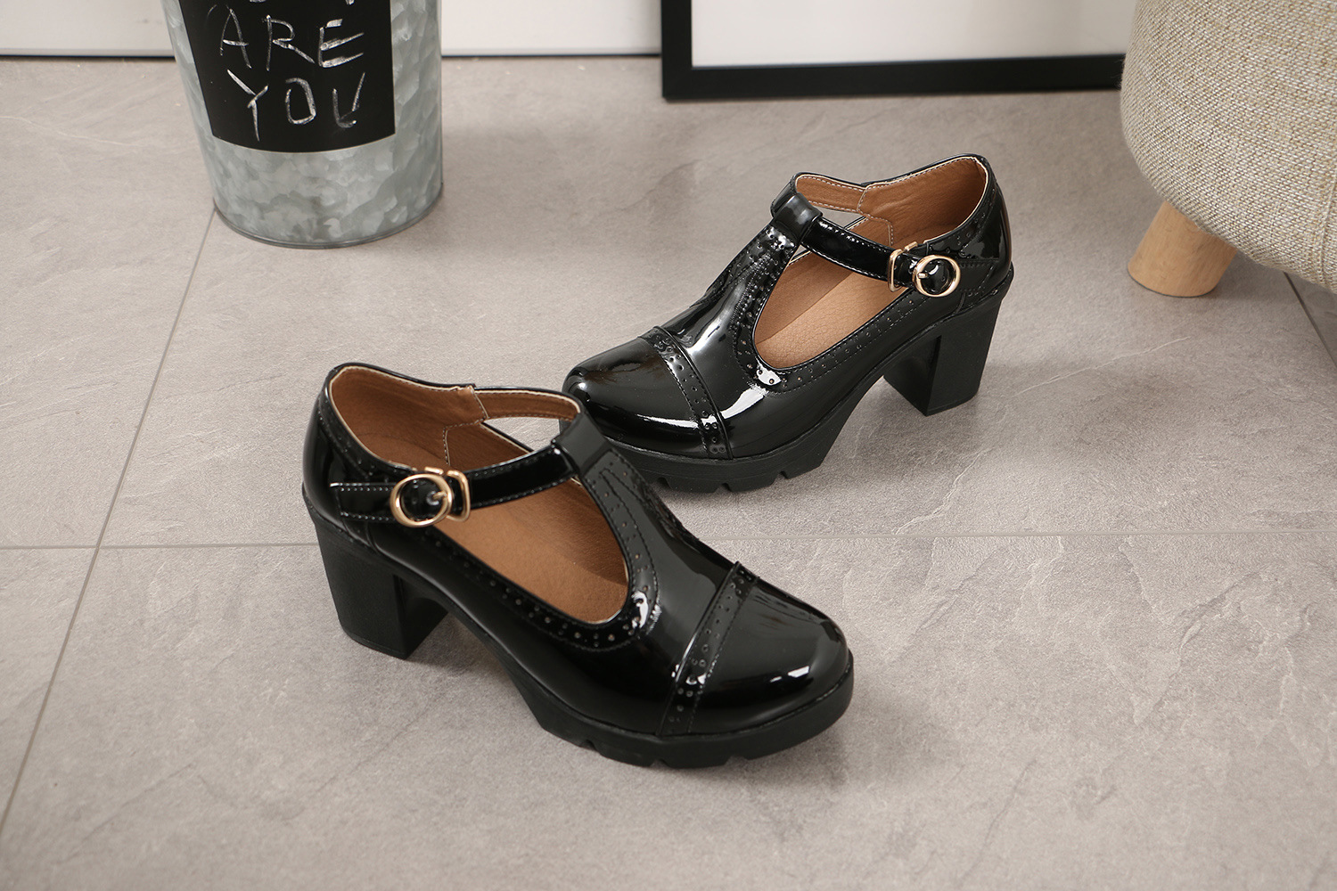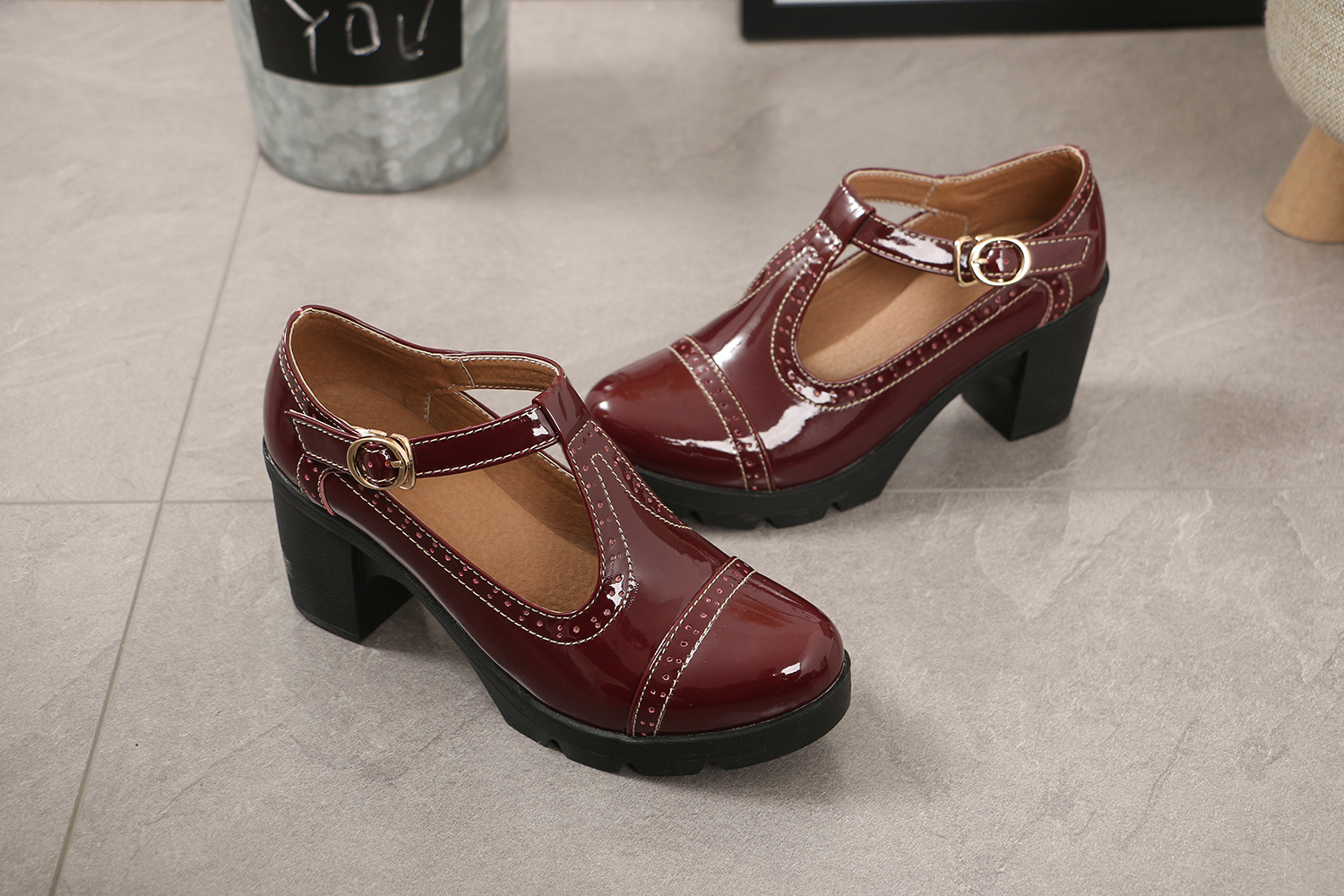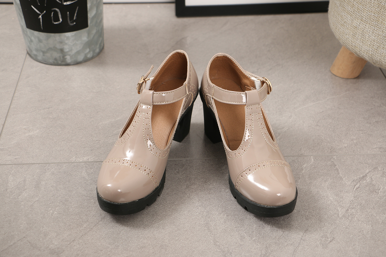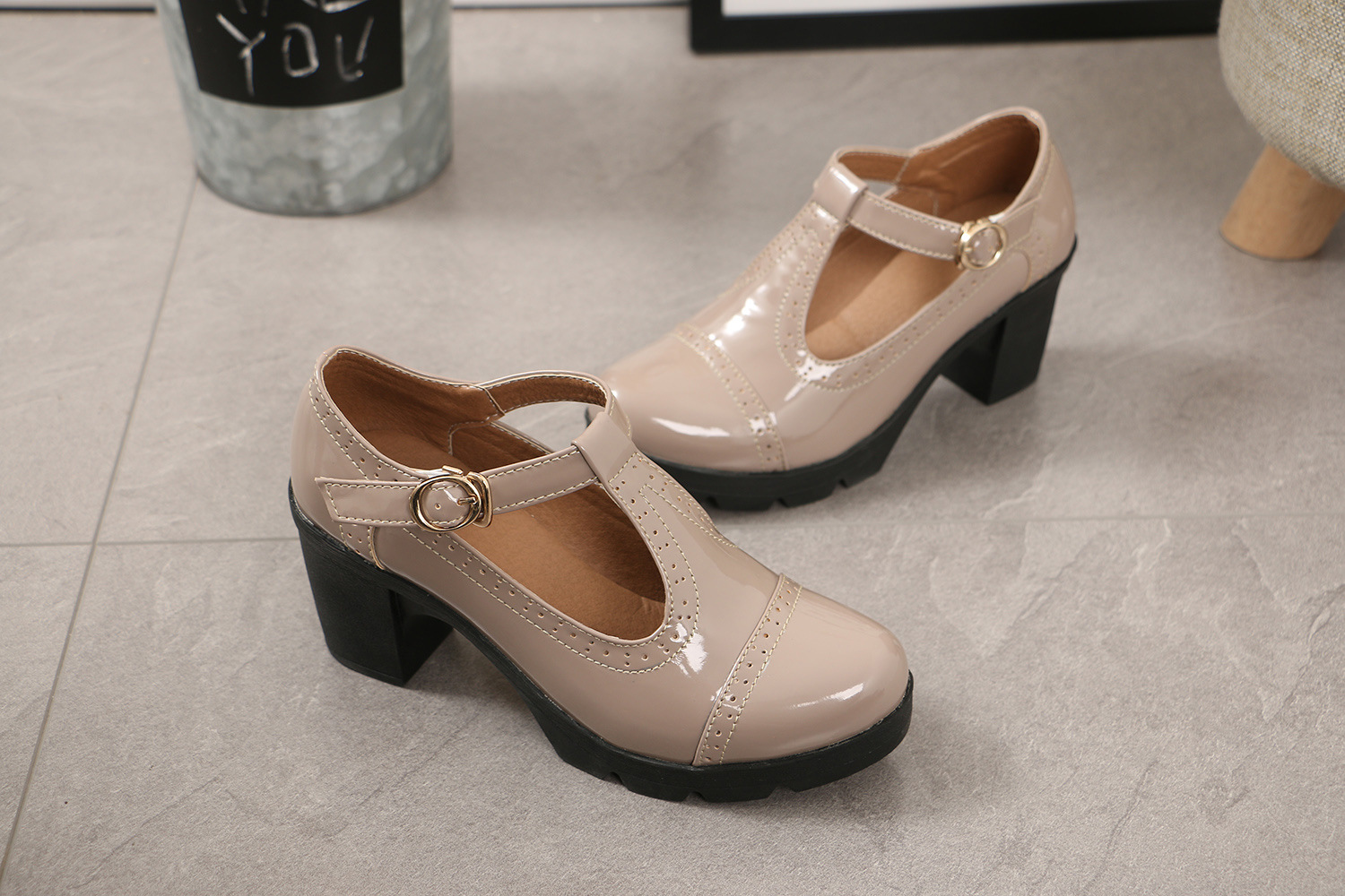 크로스보더 대형 봄, 가을 하이힐 두꺼운 굽 여성 가죽 신발 라운드 발가락 싱글 신발 T자형 신발 34-43 대형 신발 대외 무역 신발스토어 가기