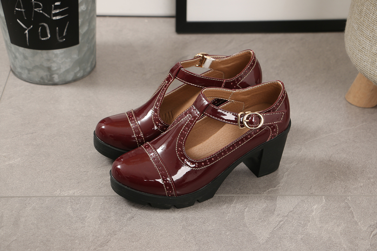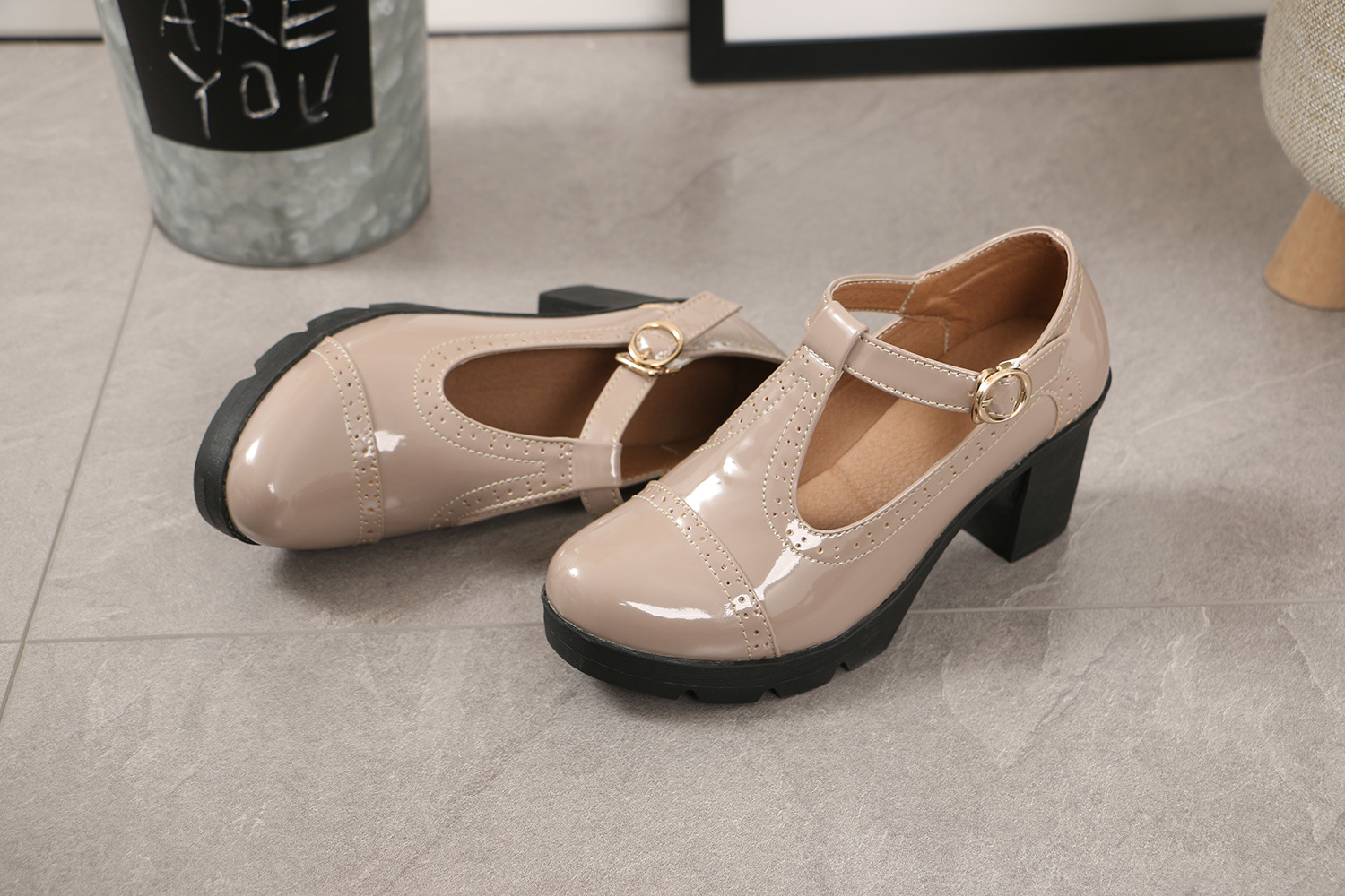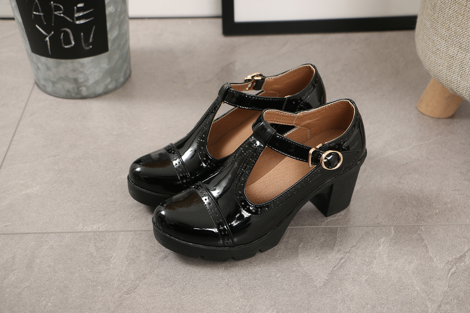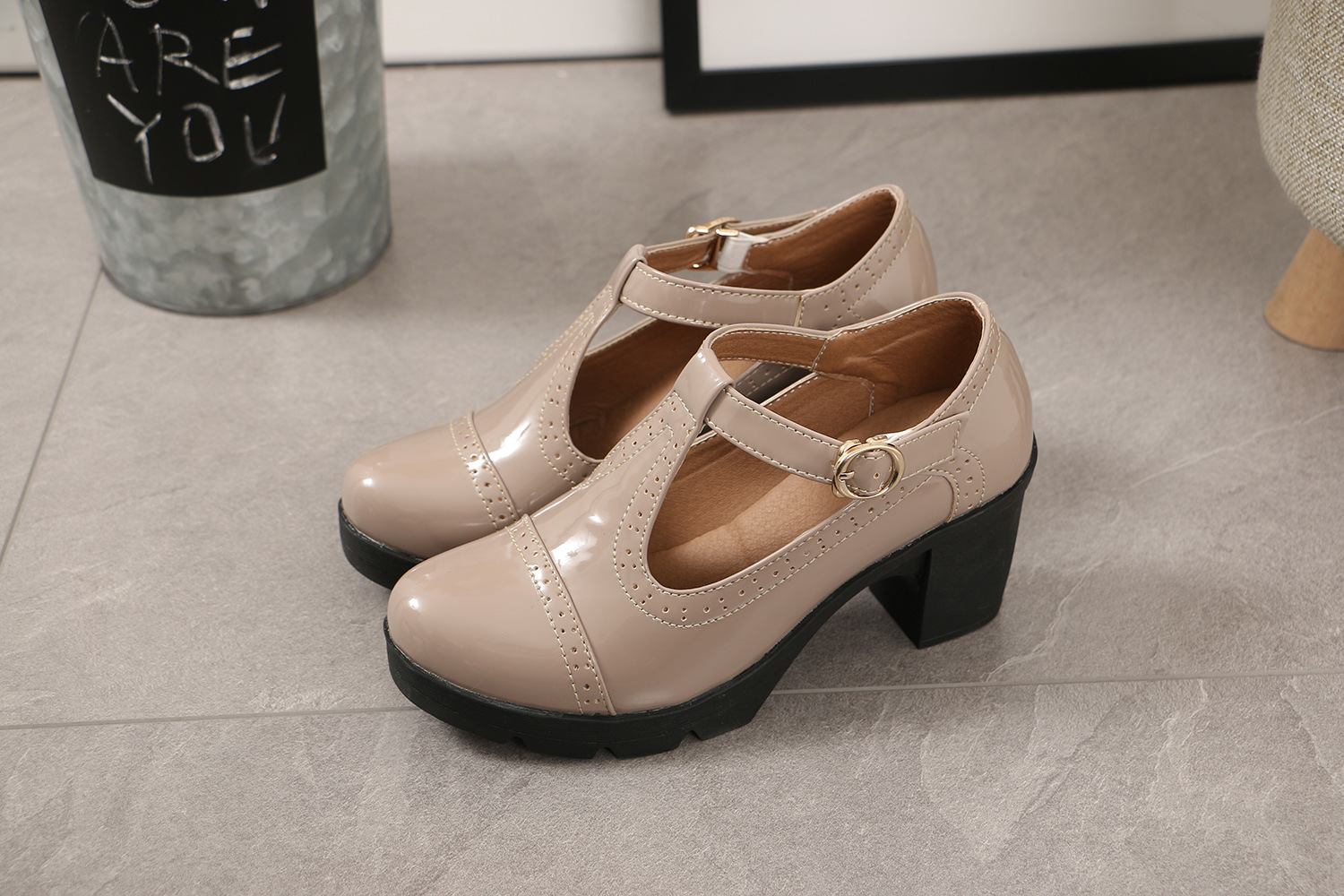 크로스보더 대형 봄, 가을 하이힐 두꺼운 굽 여성 가죽 신발 라운드 발가락 싱글 신발 T자형 신발 34-43 대형 신발 대외 무역 신발스토어 가기