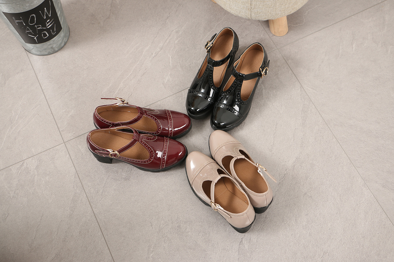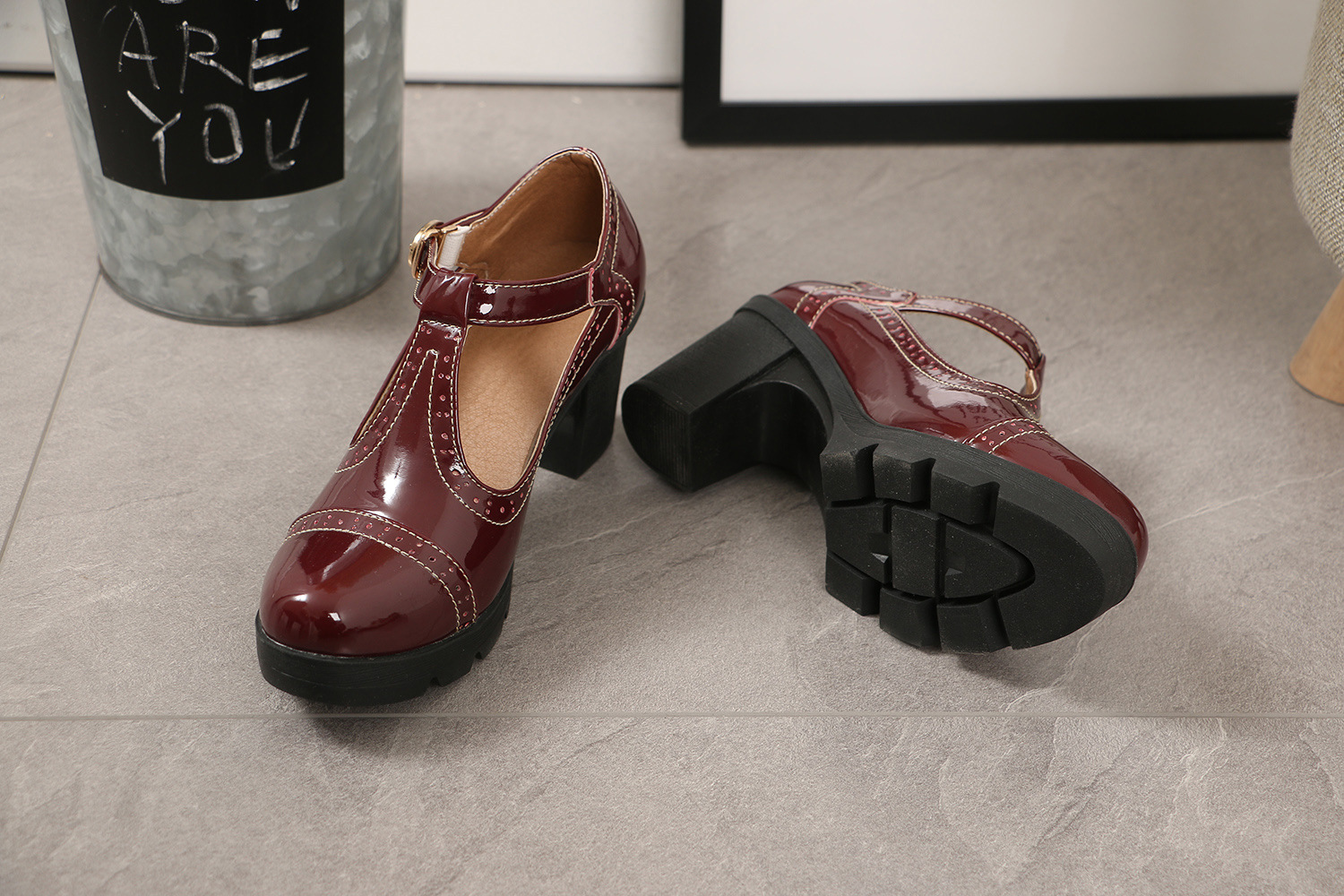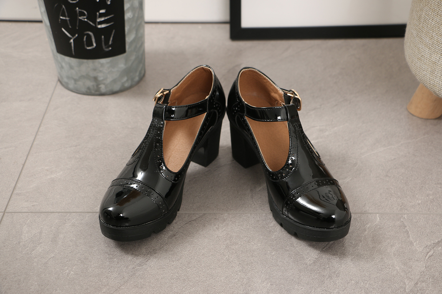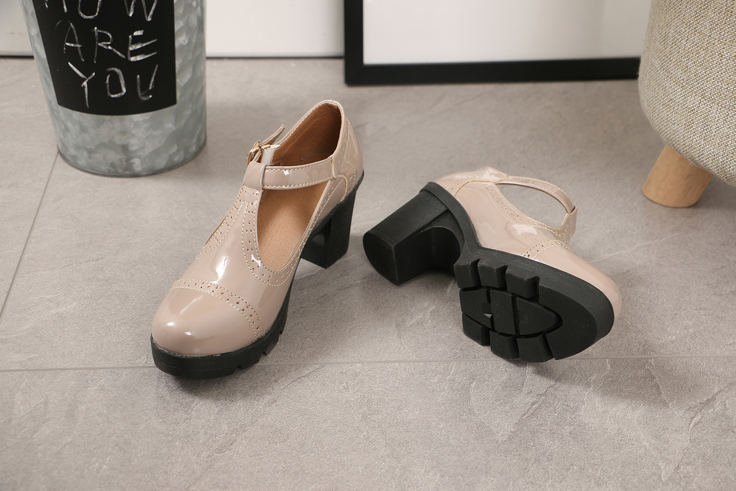 크로스보더 대형 봄, 가을 하이힐 두꺼운 굽 여성 가죽 신발 라운드 발가락 싱글 신발 T자형 신발 34-43 대형 신발 대외 무역 신발스토어 가기
