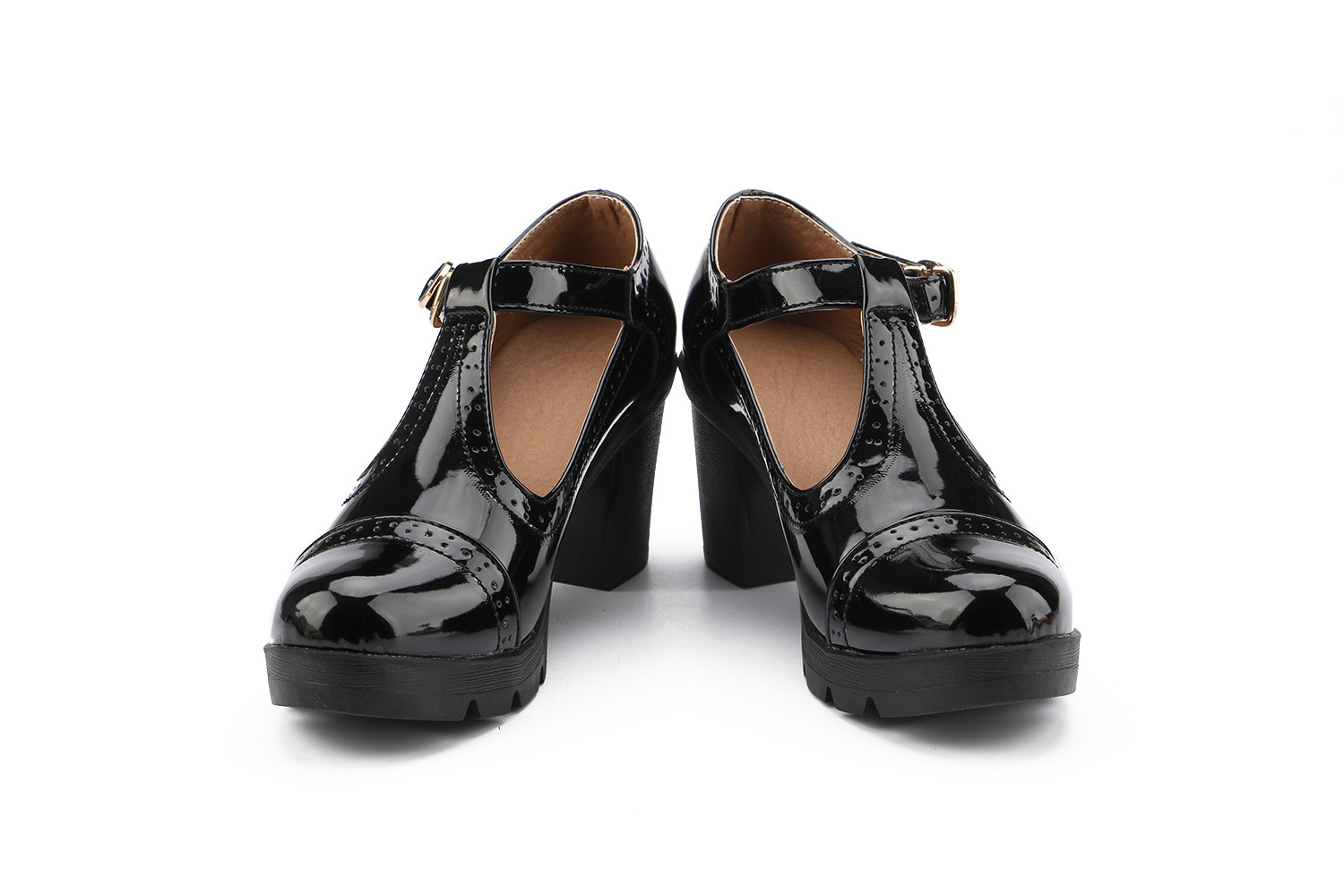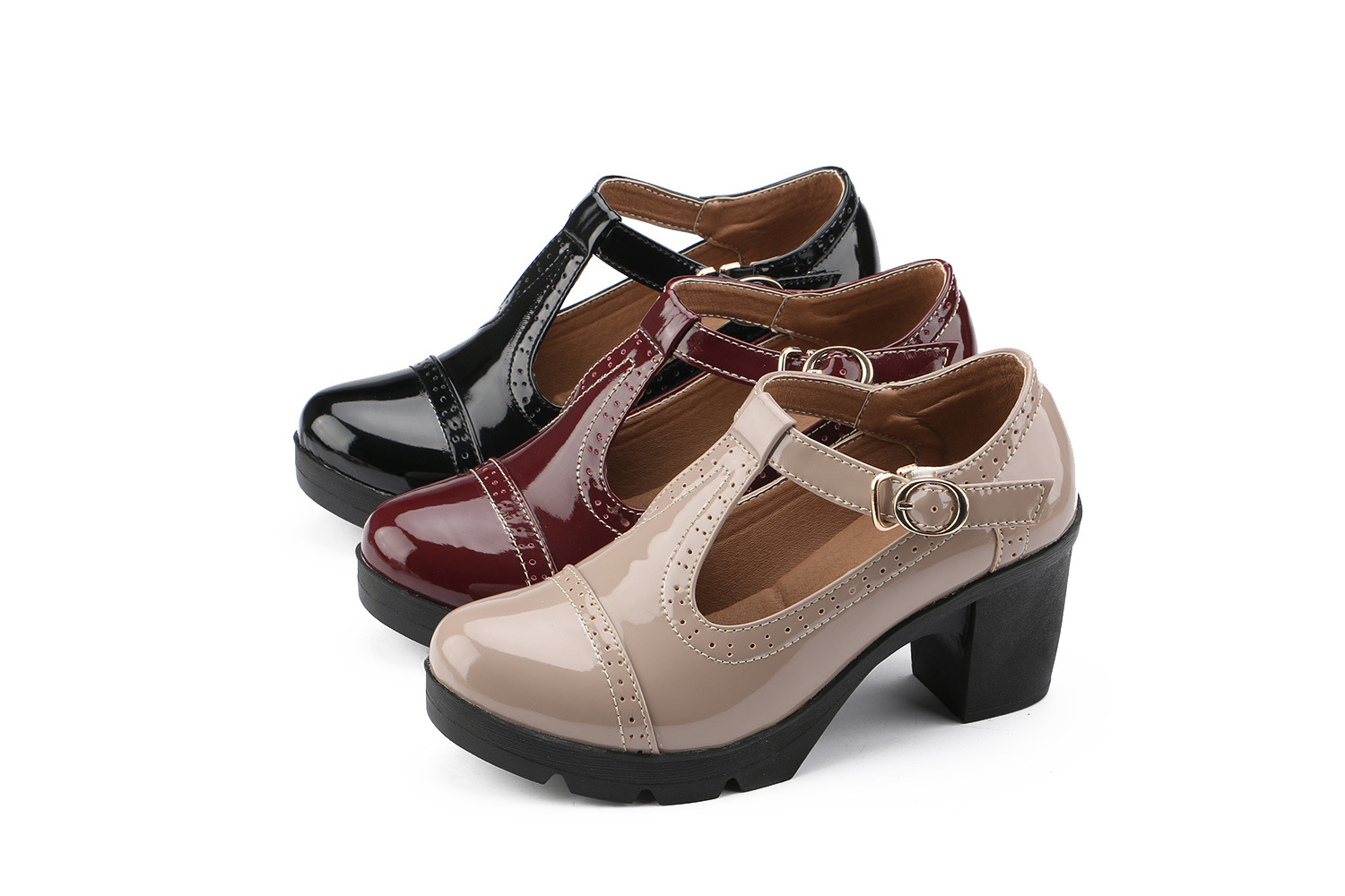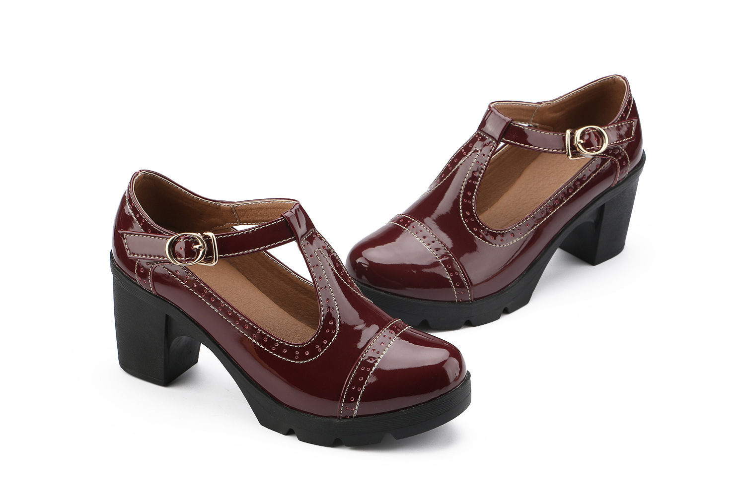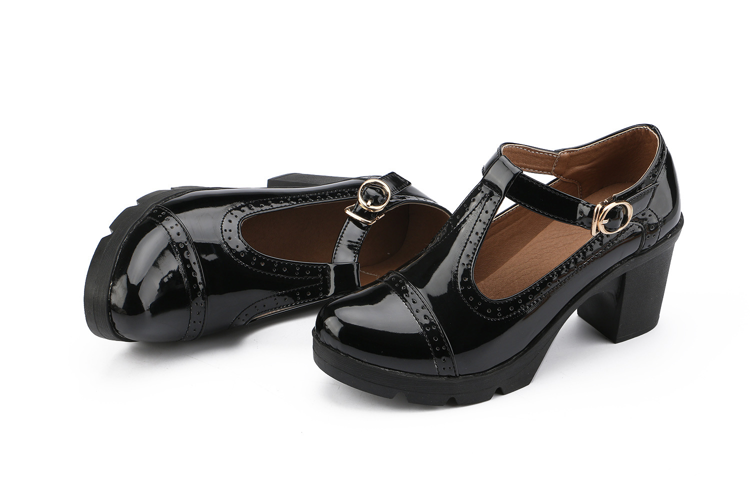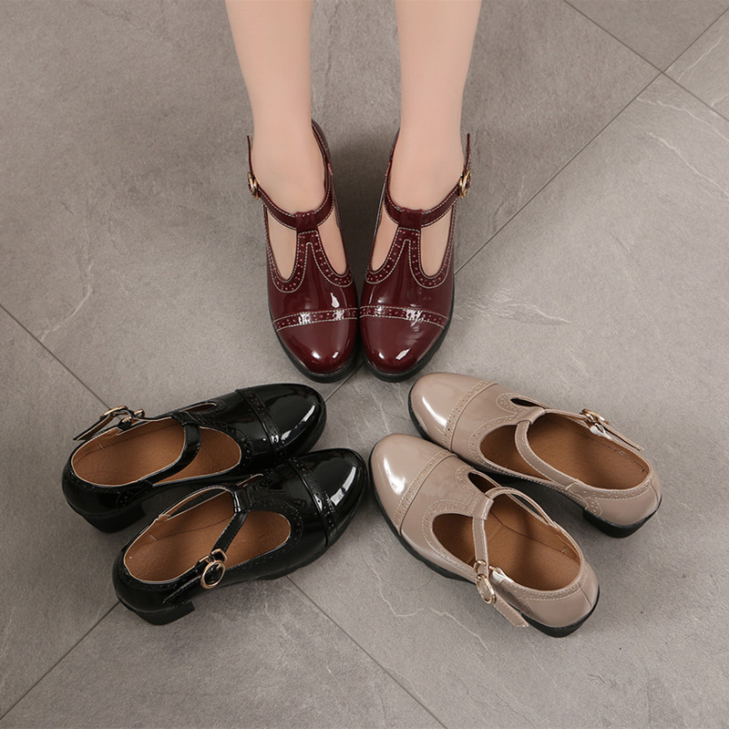 크로스보더 대형 봄, 가을 하이힐 두꺼운 굽 여성 가죽 신발 라운드 발가락 싱글 신발 T자형 신발 34-43 대형 신발 대외 무역 신발