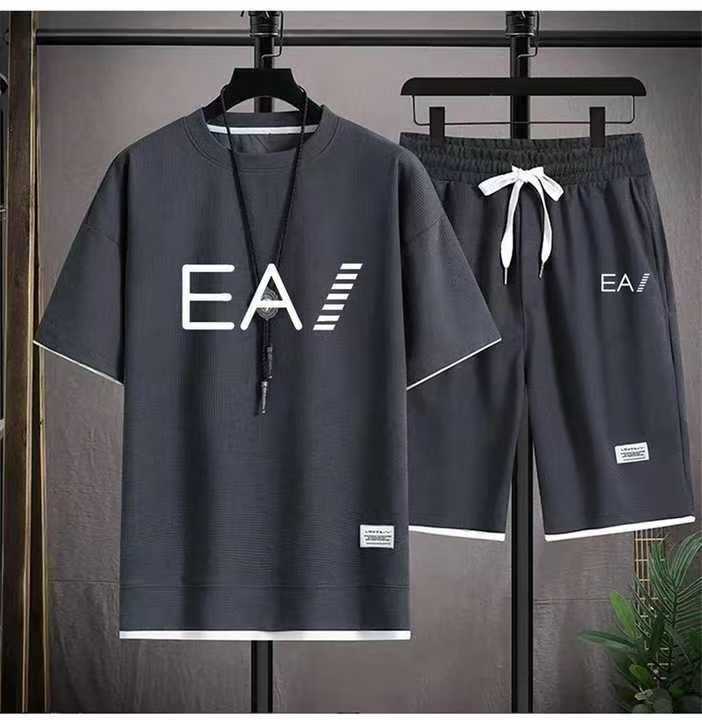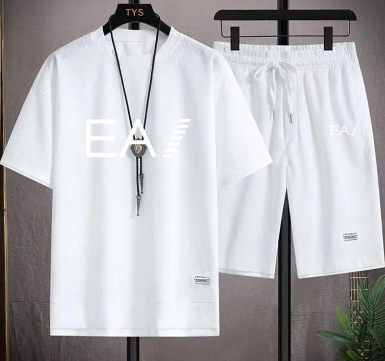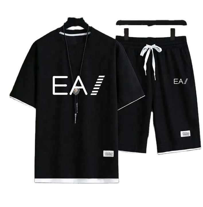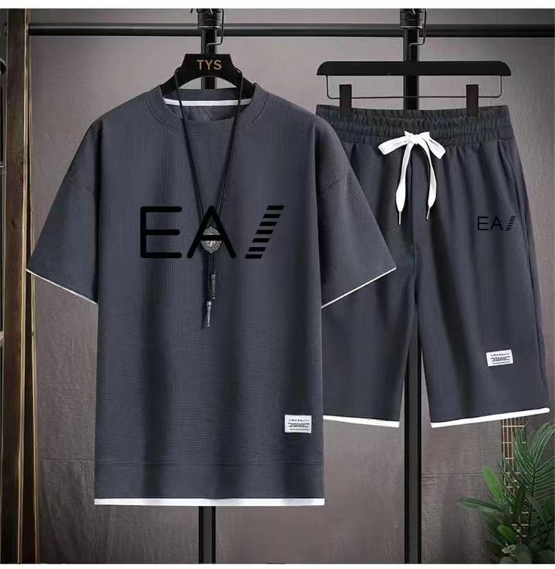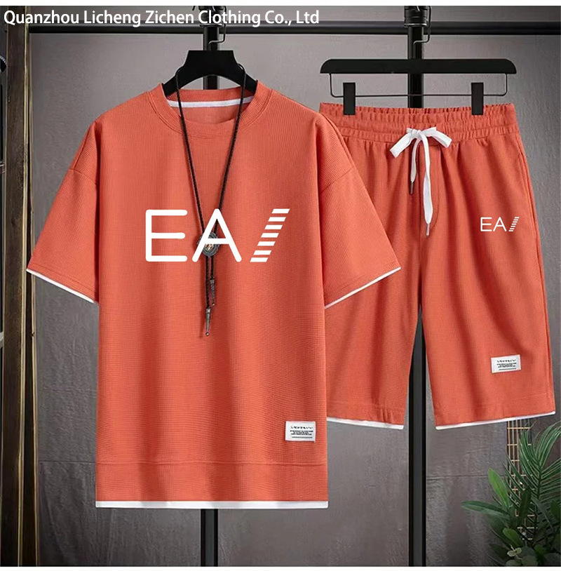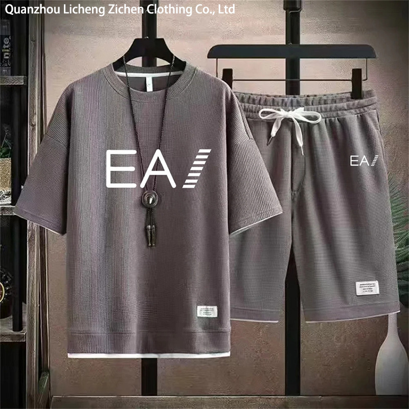 와플 반팔 여름 티셔츠 남성 레저 스포츠 세트 도매 느슨한 가짜 투피스 반팔 티셔츠 투피스 세트스토어 가기