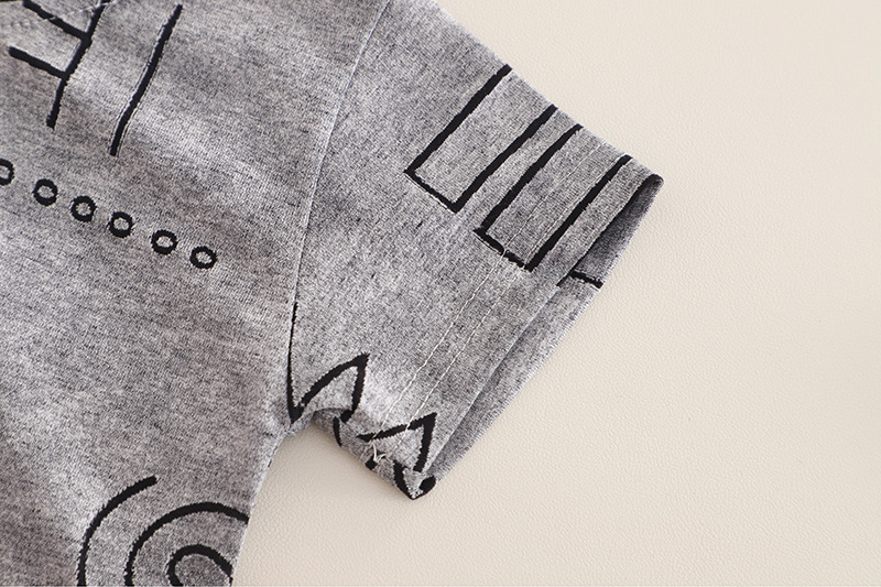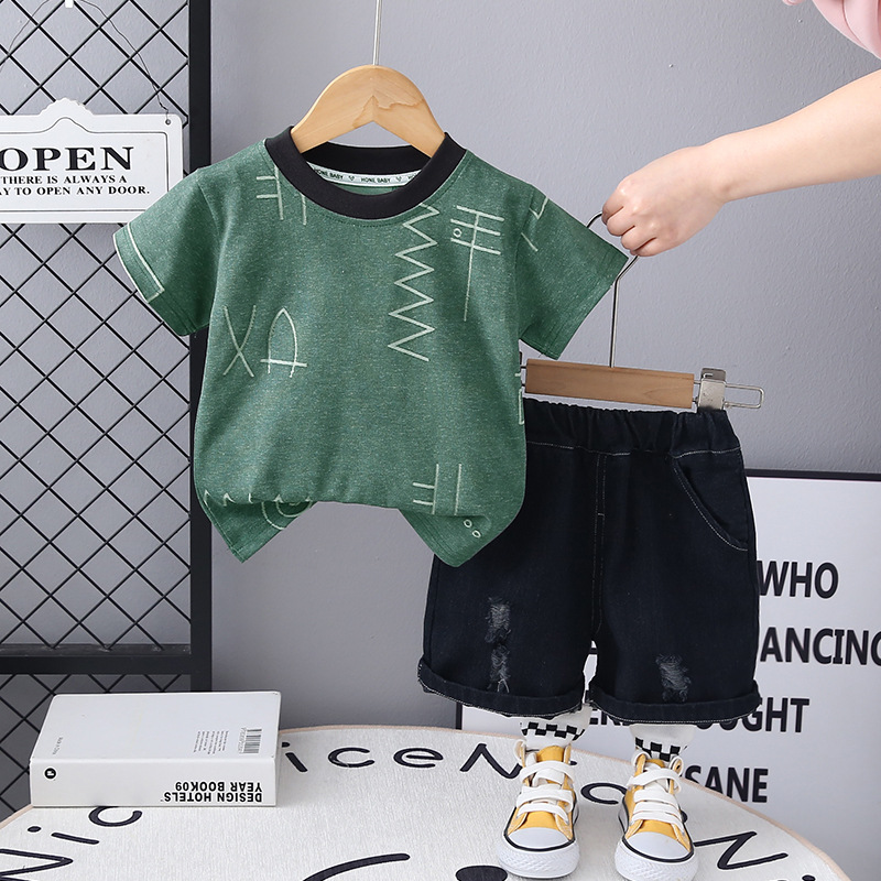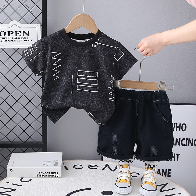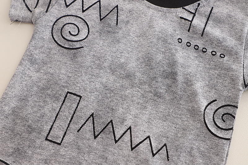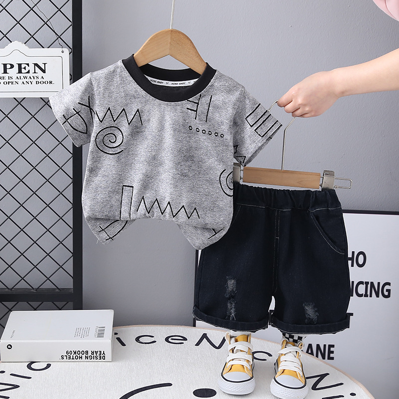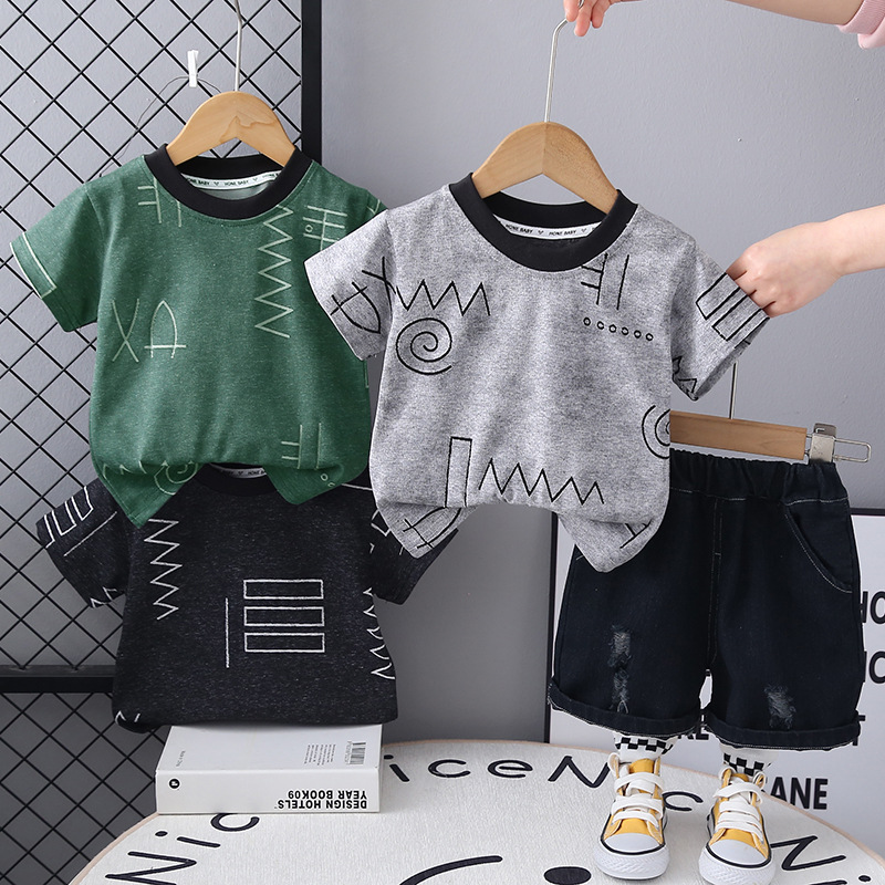 국경 간 소년 여름 반팔 양복 2025 새로운 아기 패션 기하학 라운드 넥 티셔츠 투피스 세트 도매스토어 가기