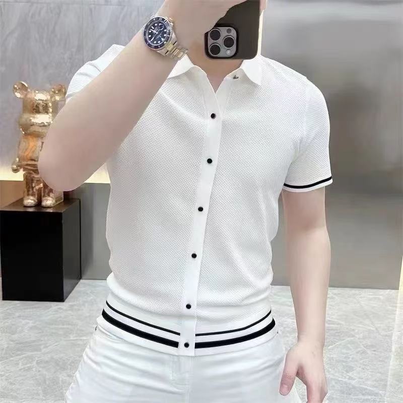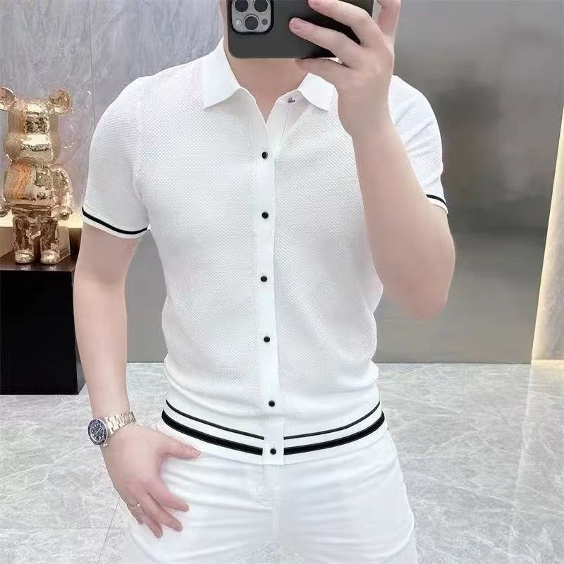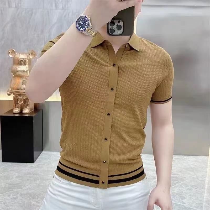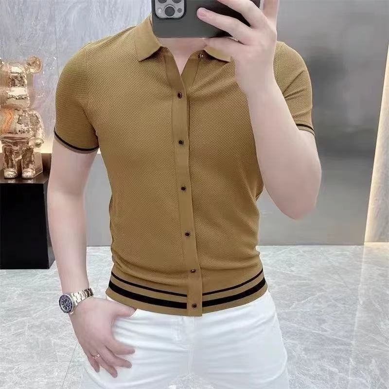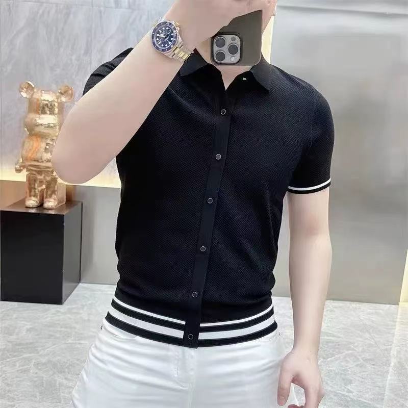 라이트 럭셔리 패션 유럽 여름 새로운 반팔 카디건 탑 컬러 블록 스트라이프 남성 라펠 슬림 니트웨어