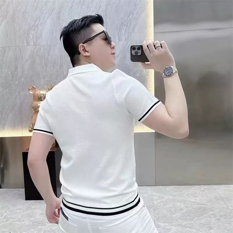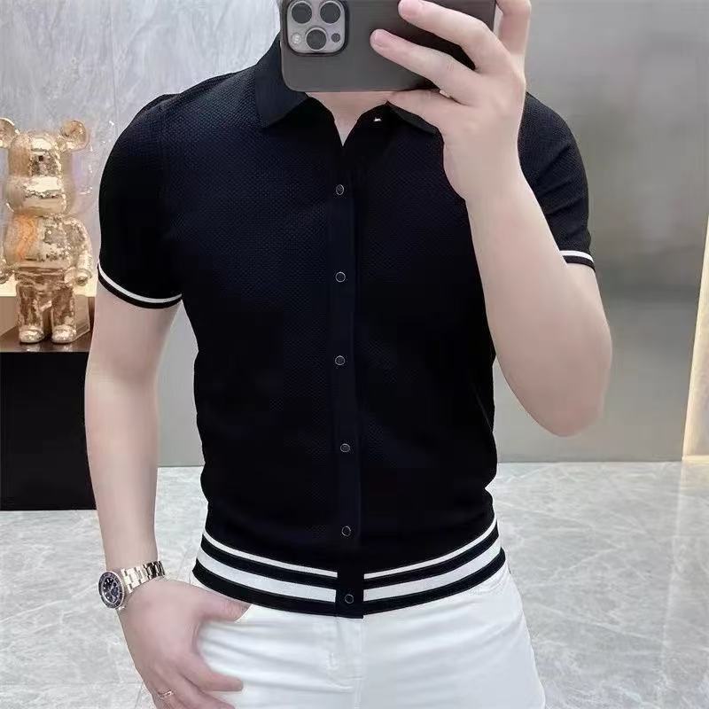 라이트 럭셔리 패션 유럽 여름 새로운 반팔 카디건 탑 컬러 블록 스트라이프 남성 라펠 슬림 니트웨어스토어 가기