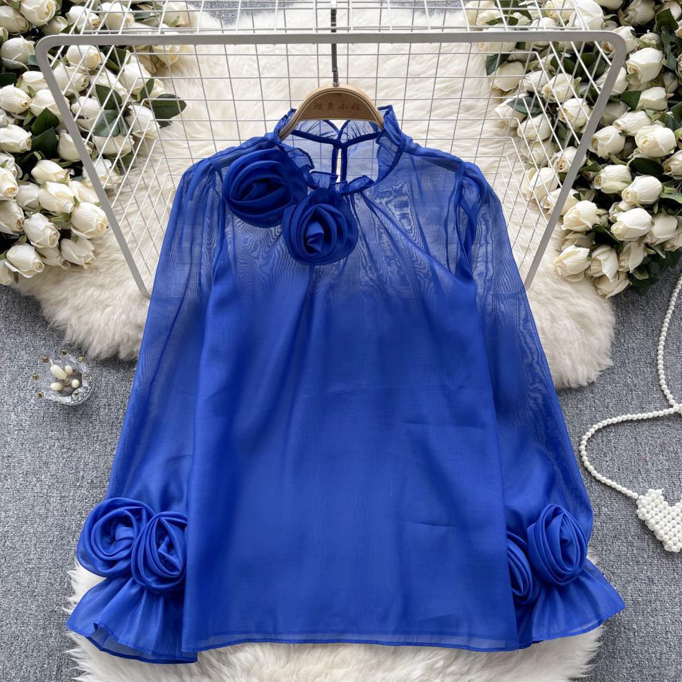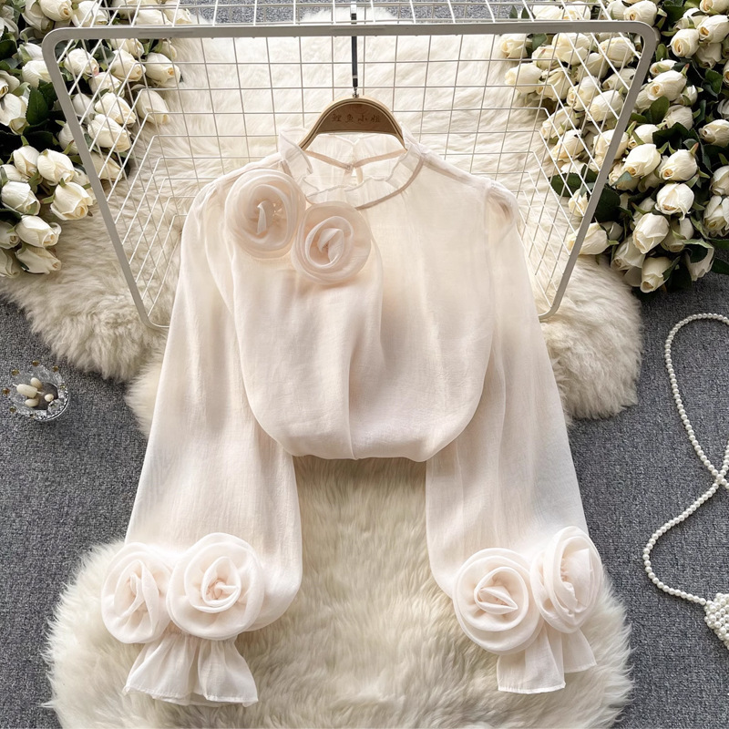 퍼프 슬리브 여성 틈새 꽃무늬 쉬폰 셔츠 여성 긴팔 프렌치 셔츠 다용도 탑 솔리드 컬러 입체 연령 감소스토어 가기