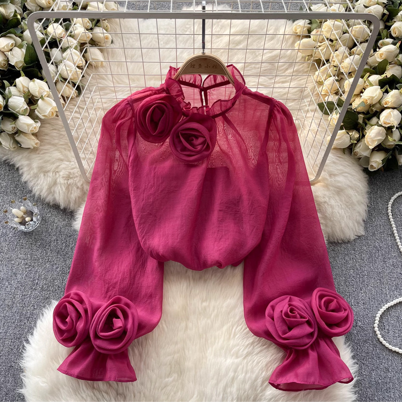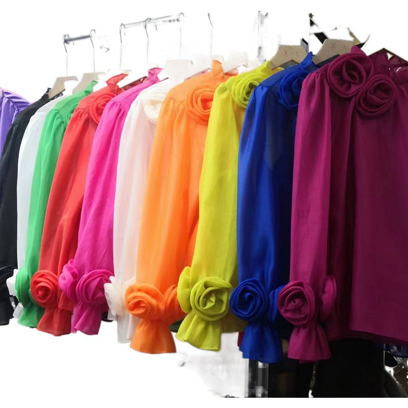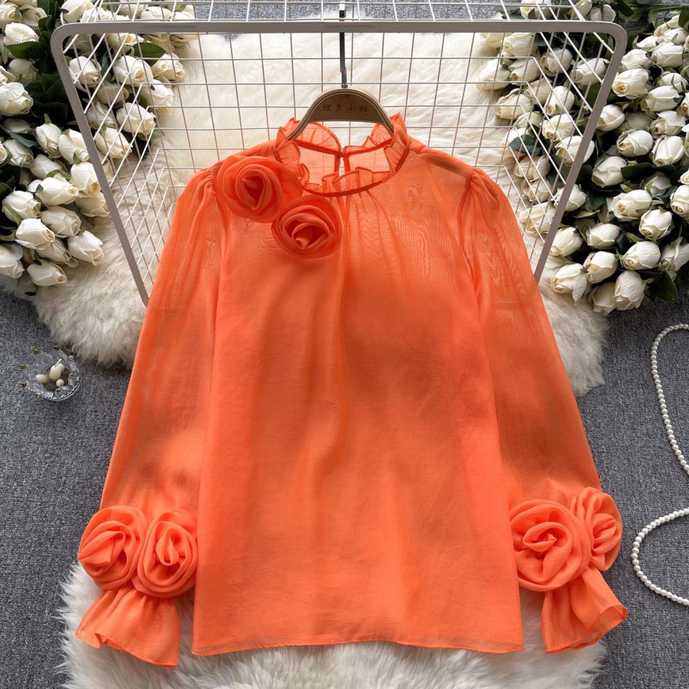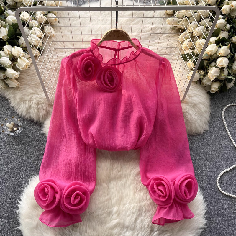 퍼프 슬리브 여성 틈새 꽃무늬 쉬폰 셔츠 여성 긴팔 프렌치 셔츠 다용도 탑 솔리드 컬러 입체 연령 감소