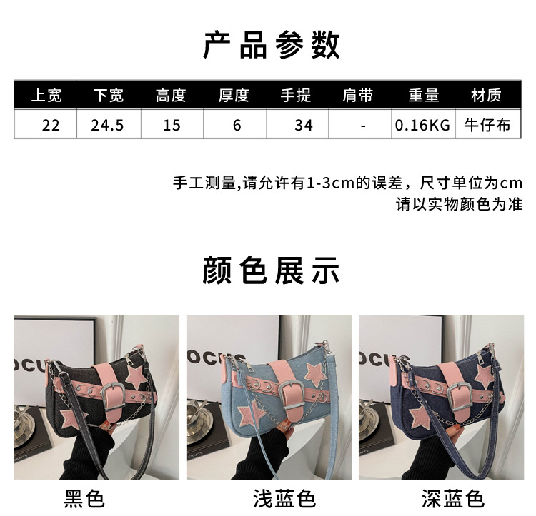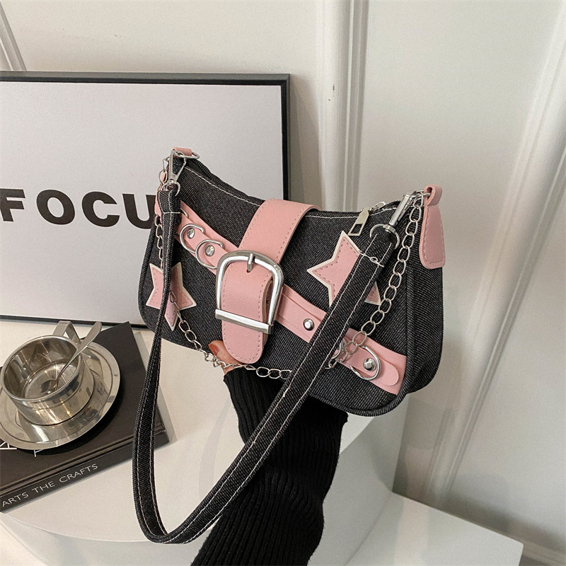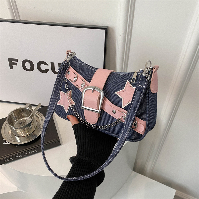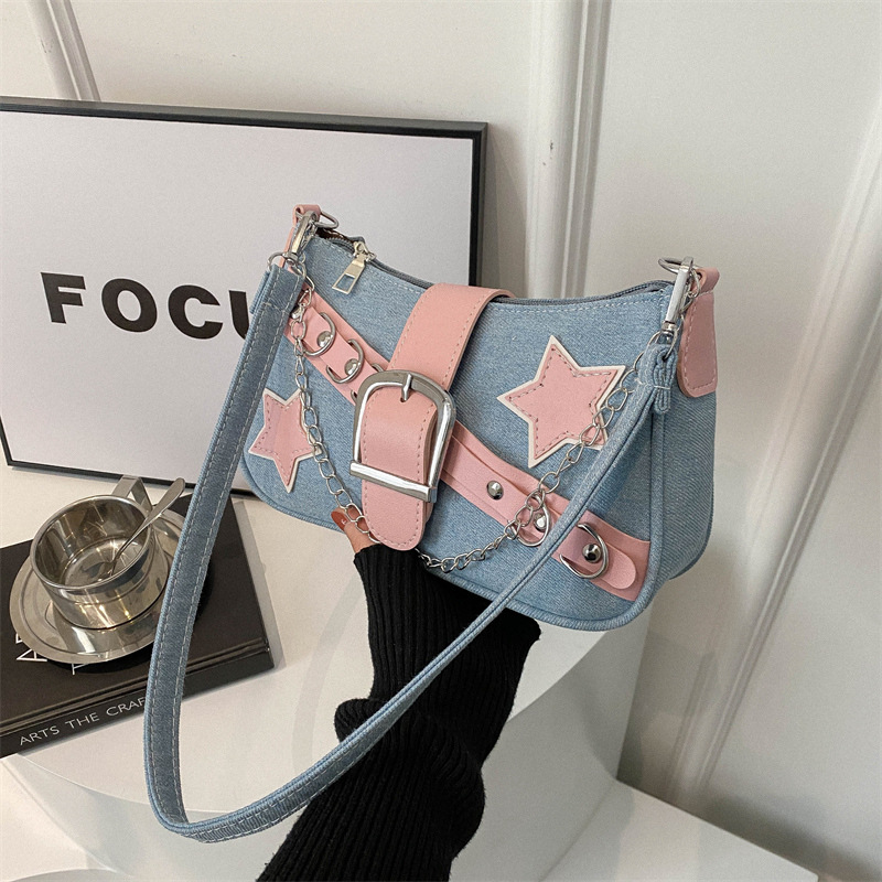 2025 새로운 한국 스타일 스타 숄더백 봄 스타일 대비 색상 캐주얼 맞춤형 체인 백 데님 겨드랑이 가방스토어 가기