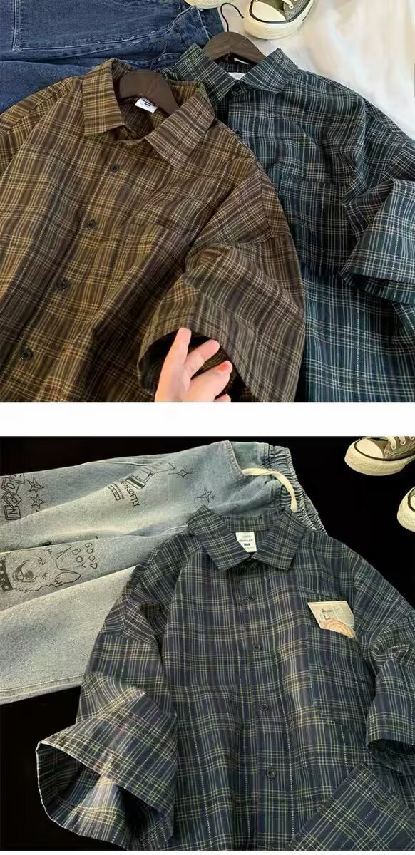 일본 복고풍 격자 무늬 반팔 셔츠 남성 streetwear 루즈 캐주얼 패션 다목적 반소매 셔츠 남성스토어 가기