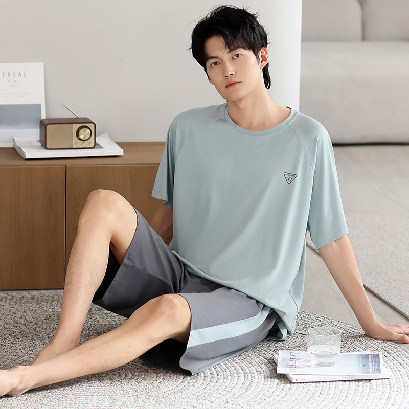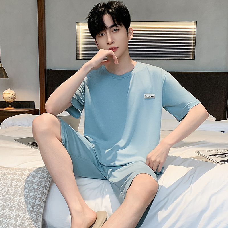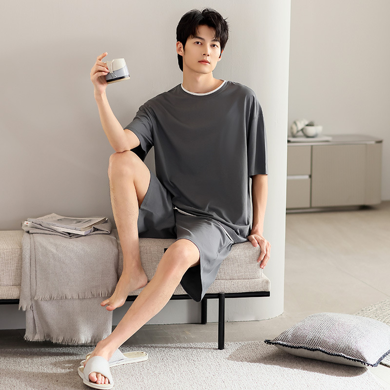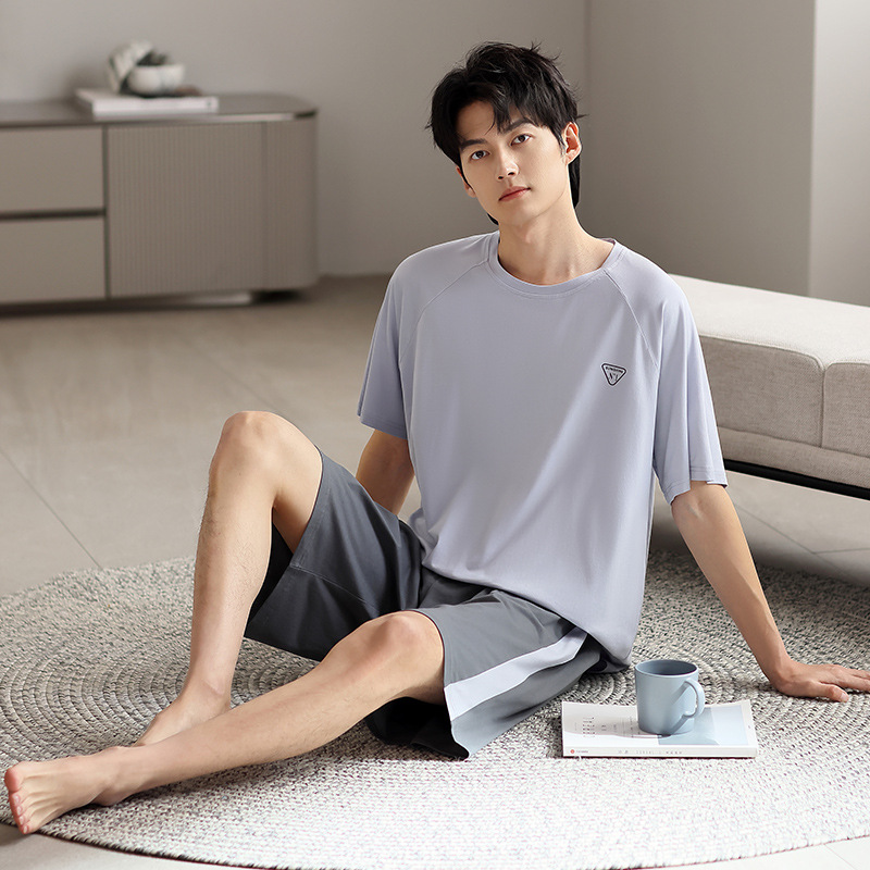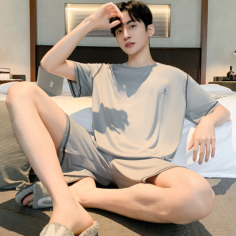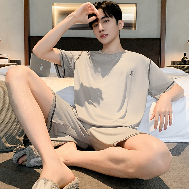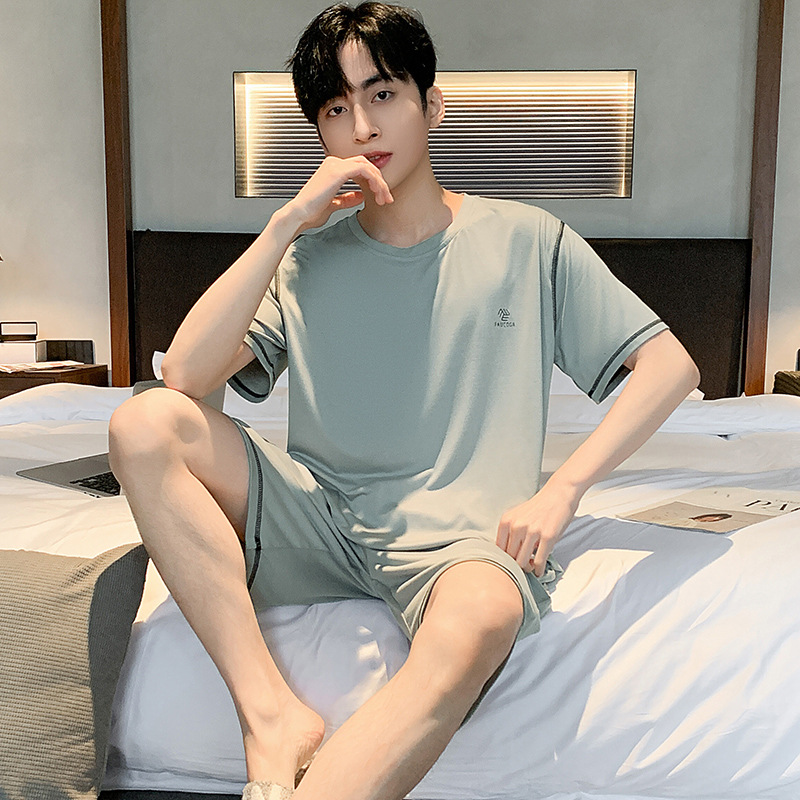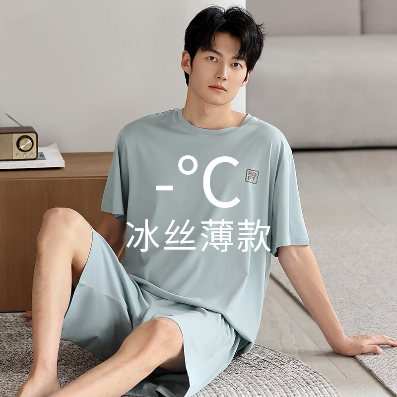 시원한 잠옷 남성 여름 얇은 얼음 실크 여름 라운드 넥 단순 솔리드 컬러 반팔 반바지 남성 홈웨어 세트