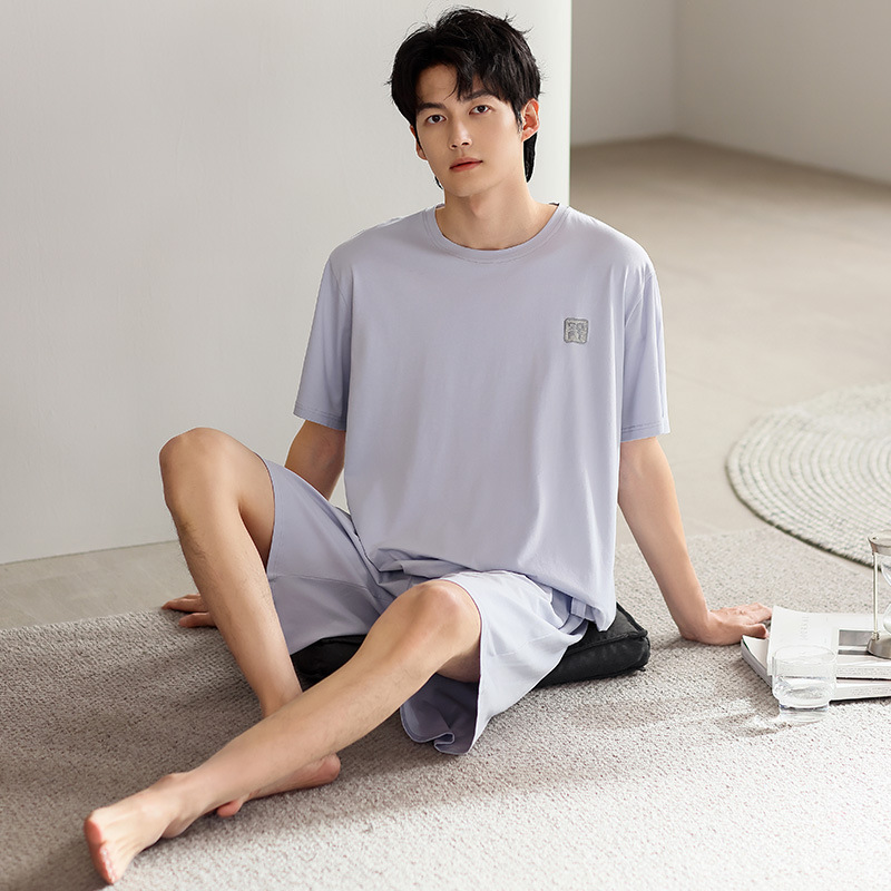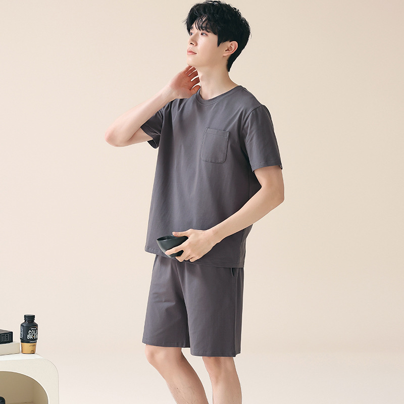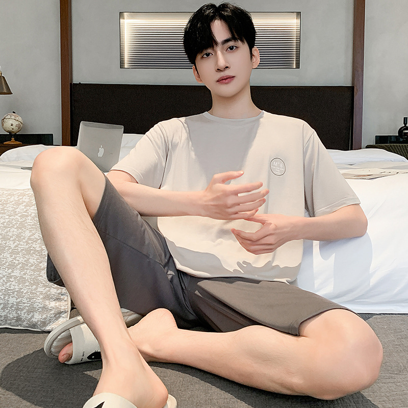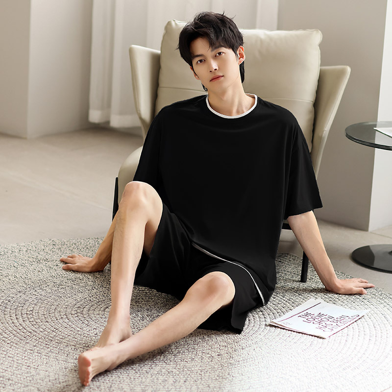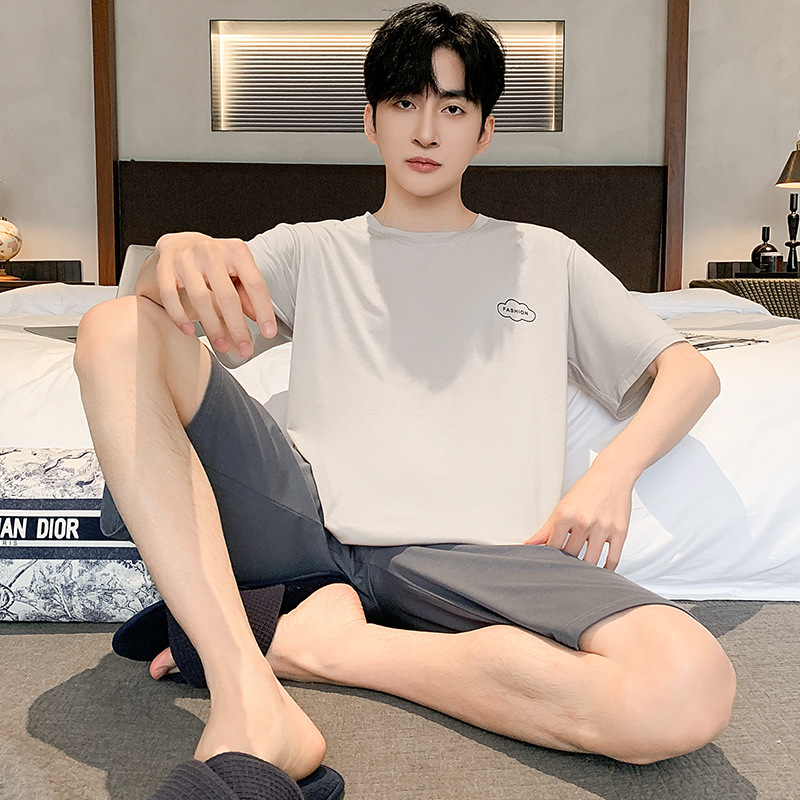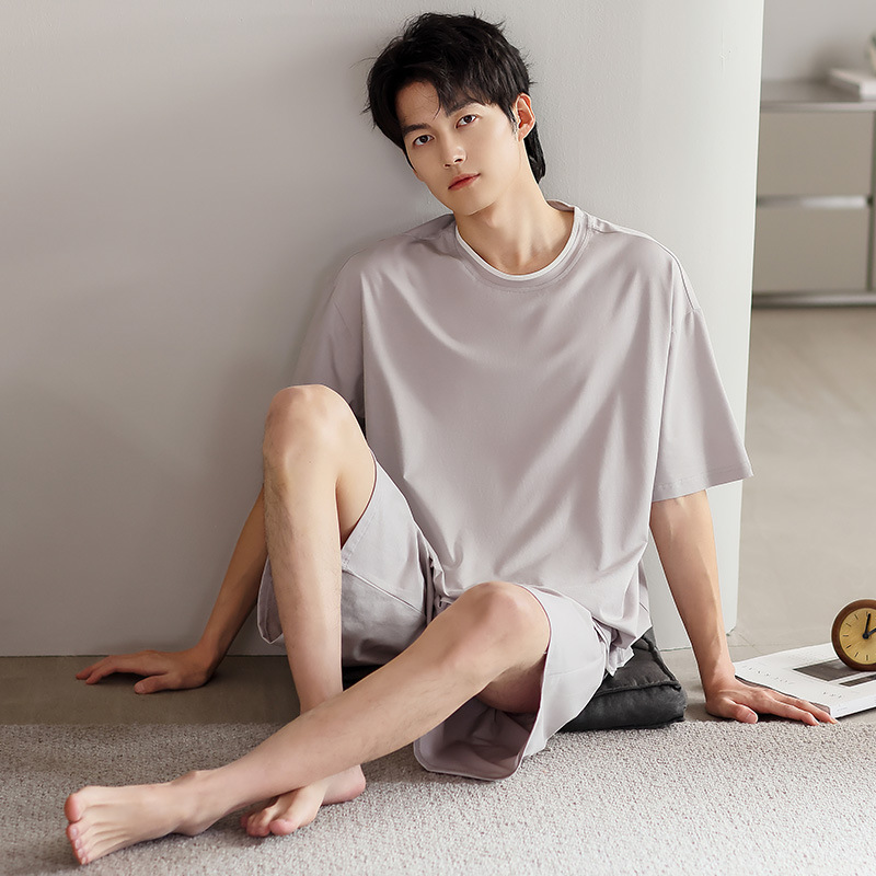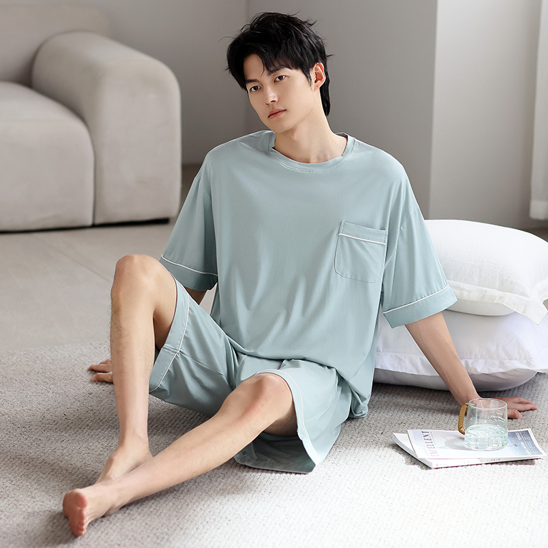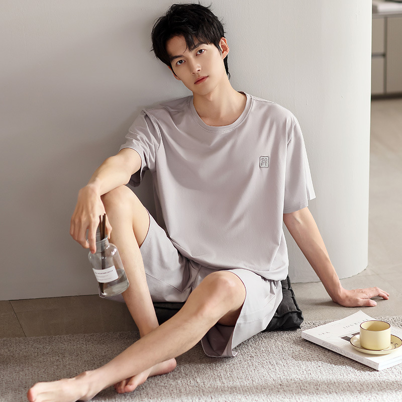 시원한 잠옷 남성 여름 얇은 얼음 실크 여름 라운드 넥 단순 솔리드 컬러 반팔 반바지 남성 홈웨어 세트