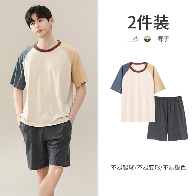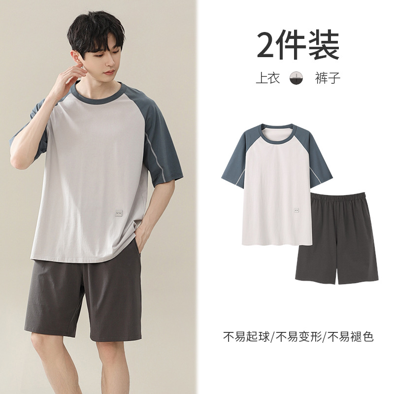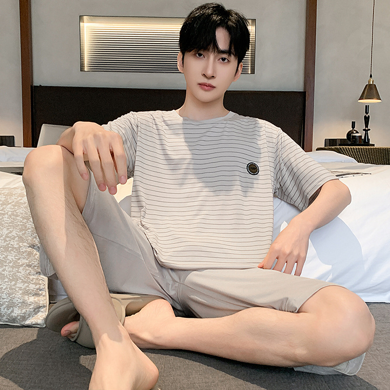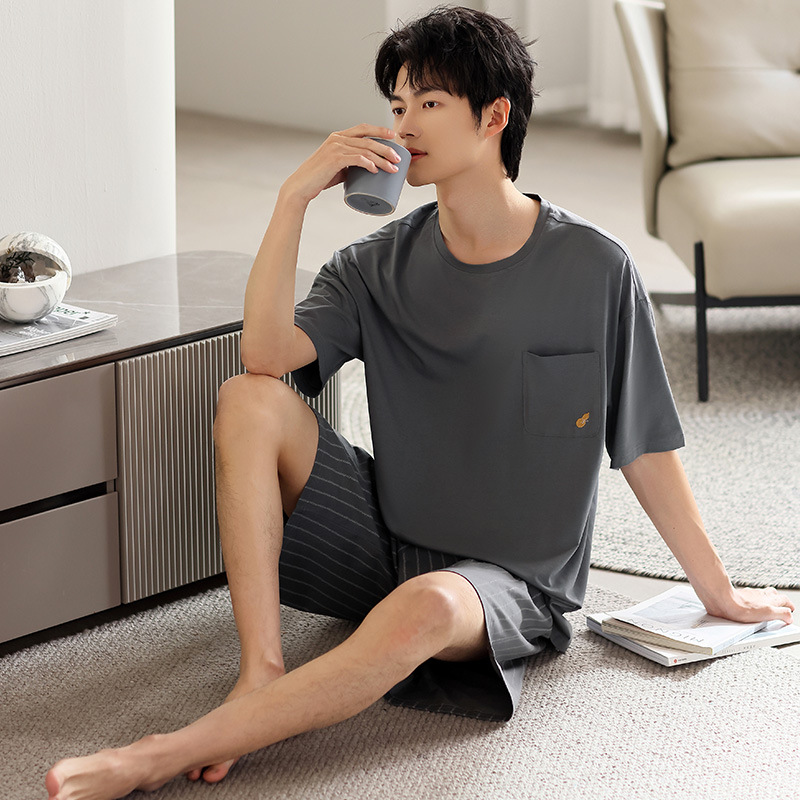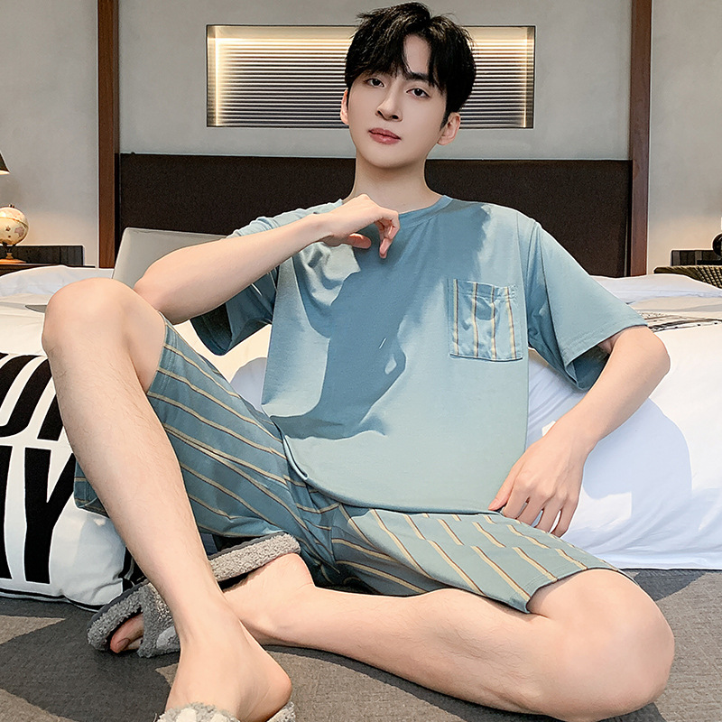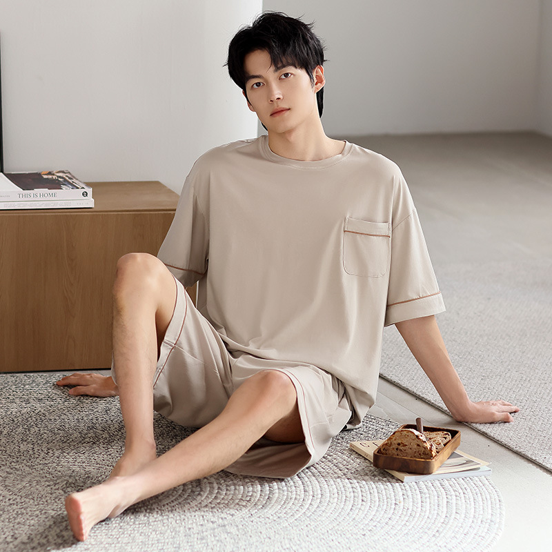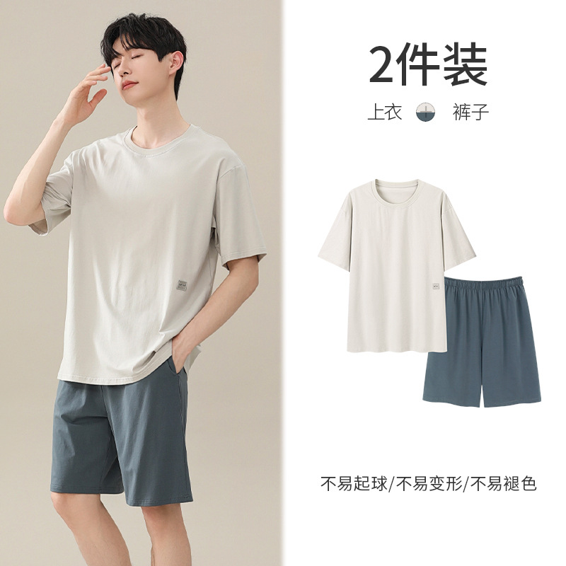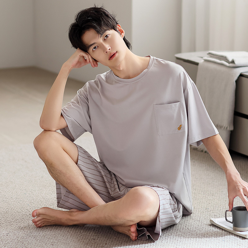 시원한 잠옷 남성 여름 얇은 얼음 실크 여름 라운드 넥 단순 솔리드 컬러 반팔 반바지 남성 홈웨어 세트