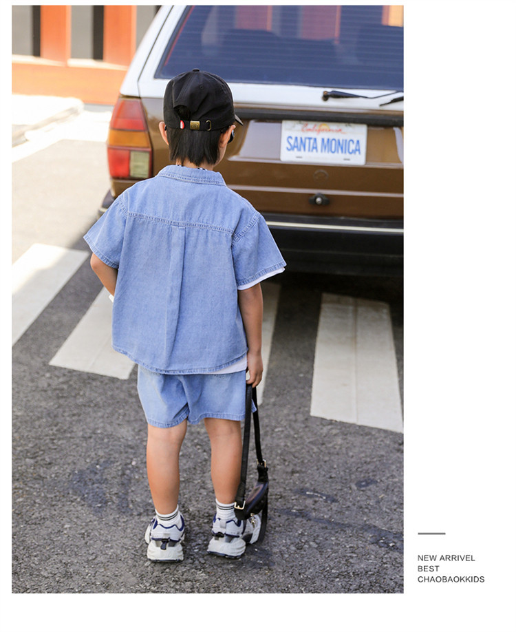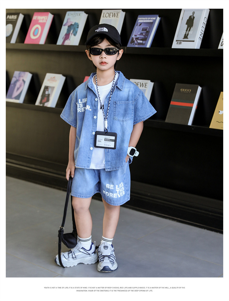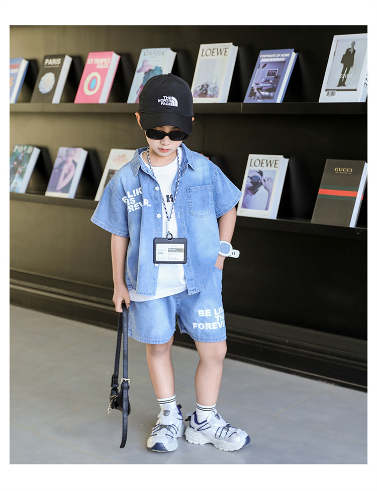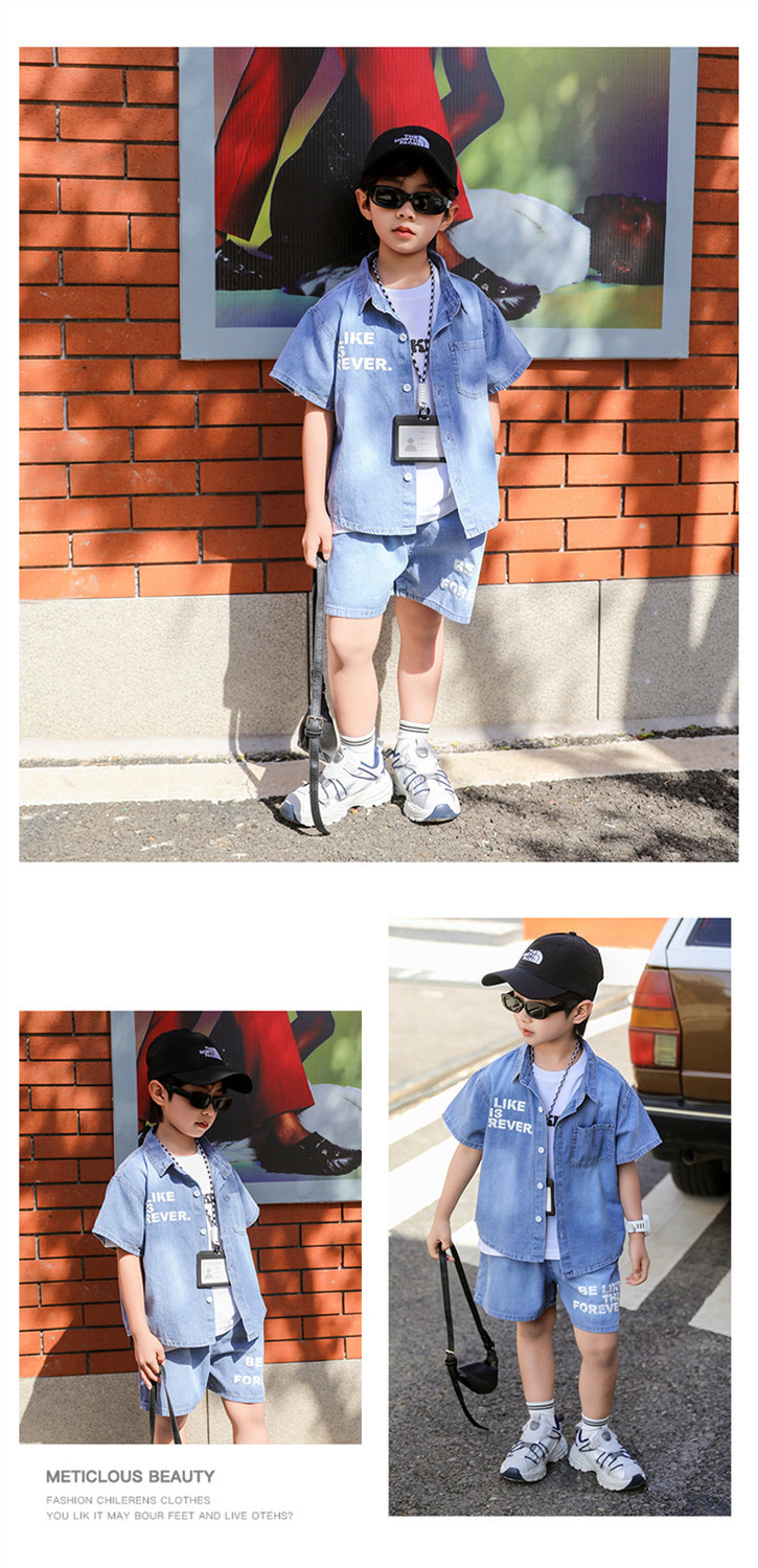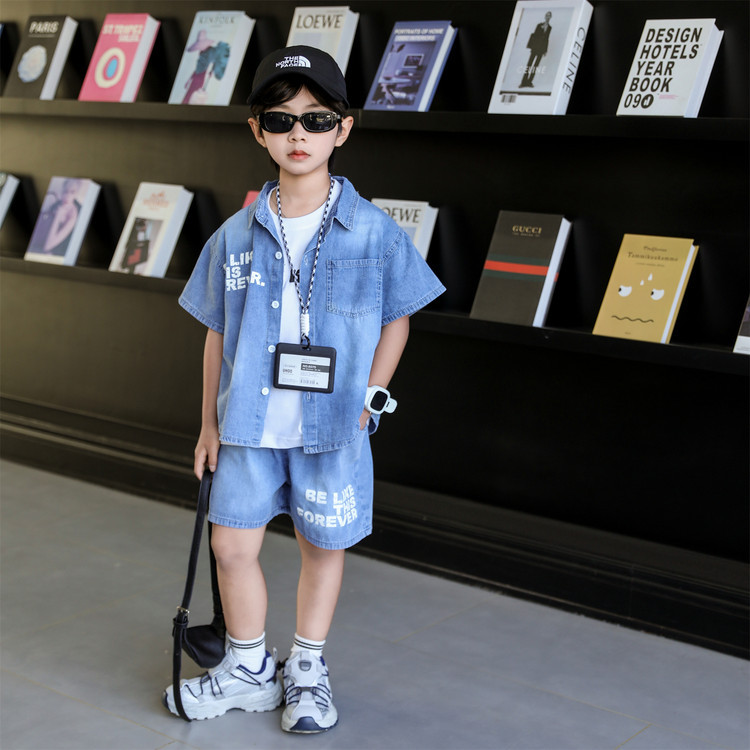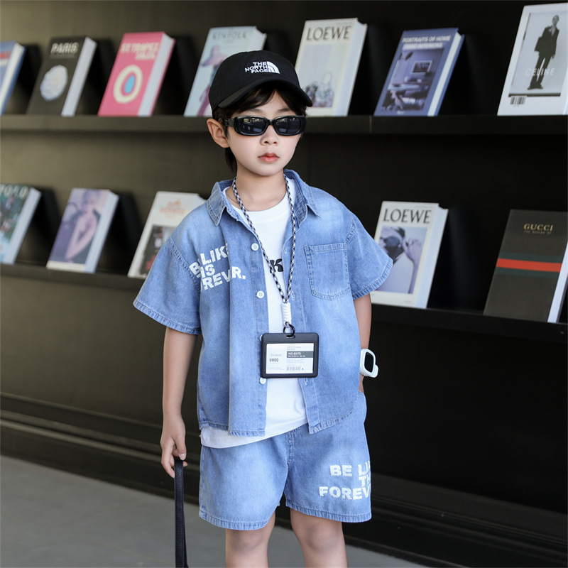 맞춤형 여름 데님 세트 남아용 신상 반팔 데님 셔츠 루즈핏 데님 반바지 스타일리쉬한 아동복 세트스토어 가기