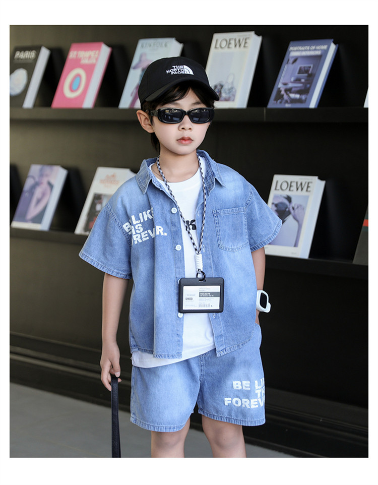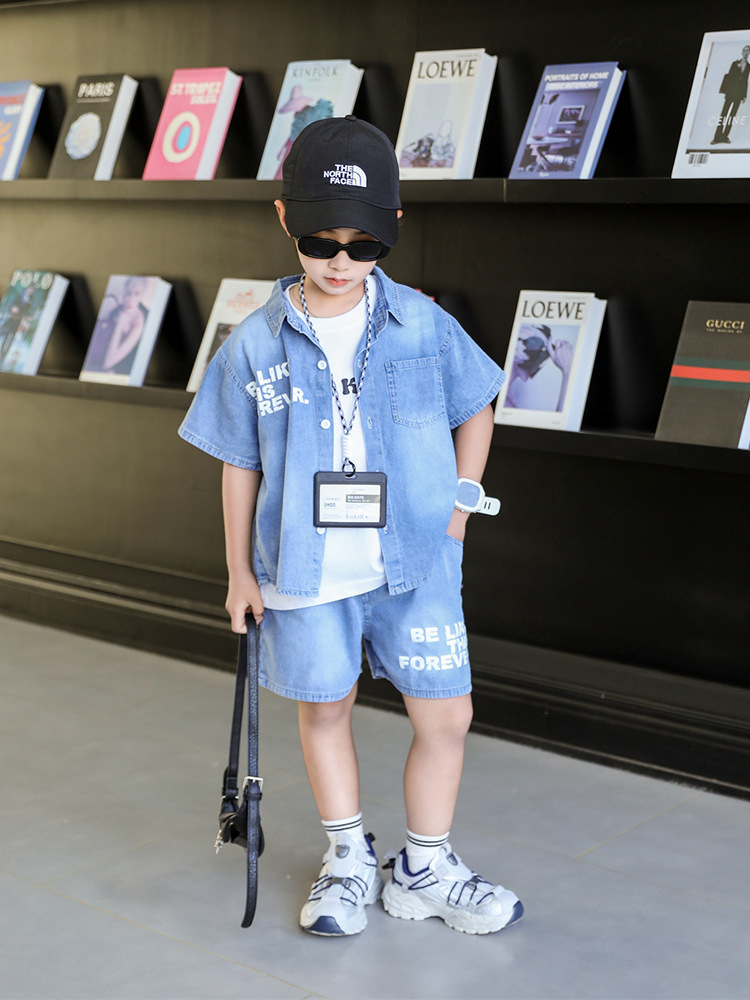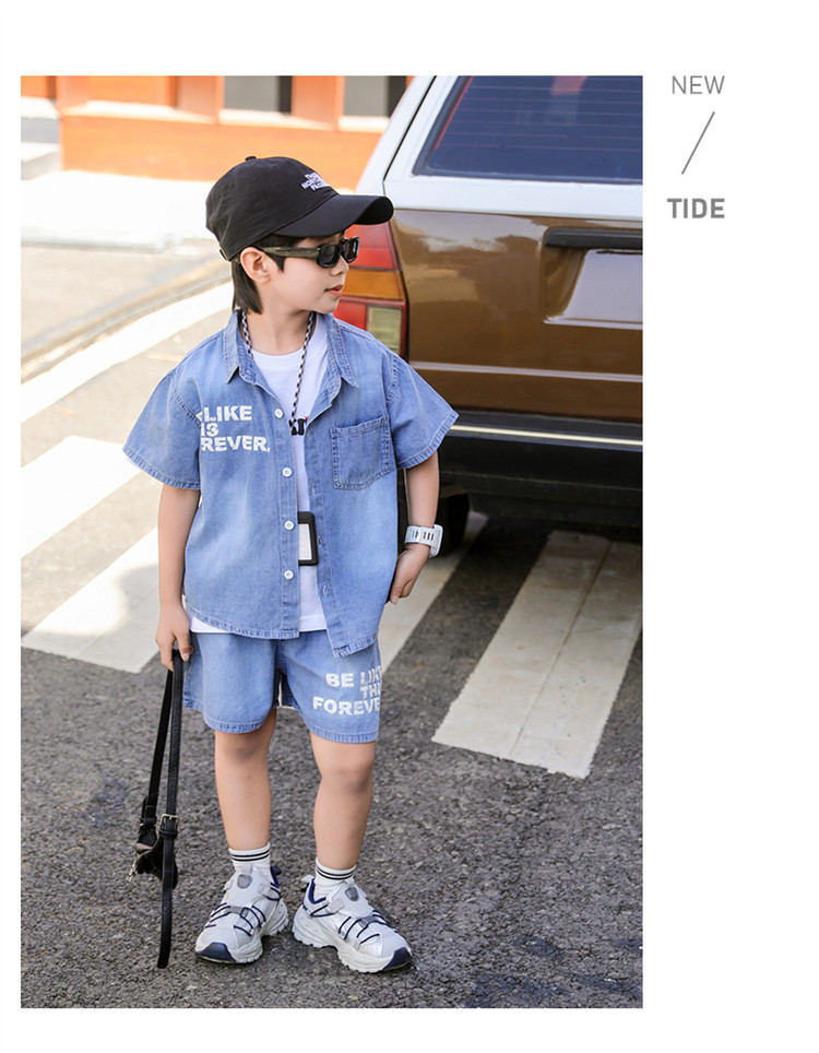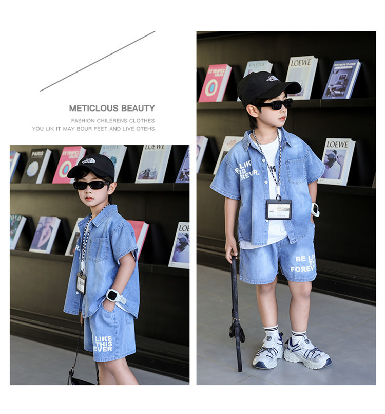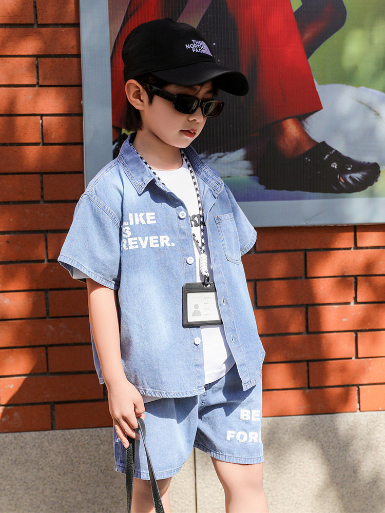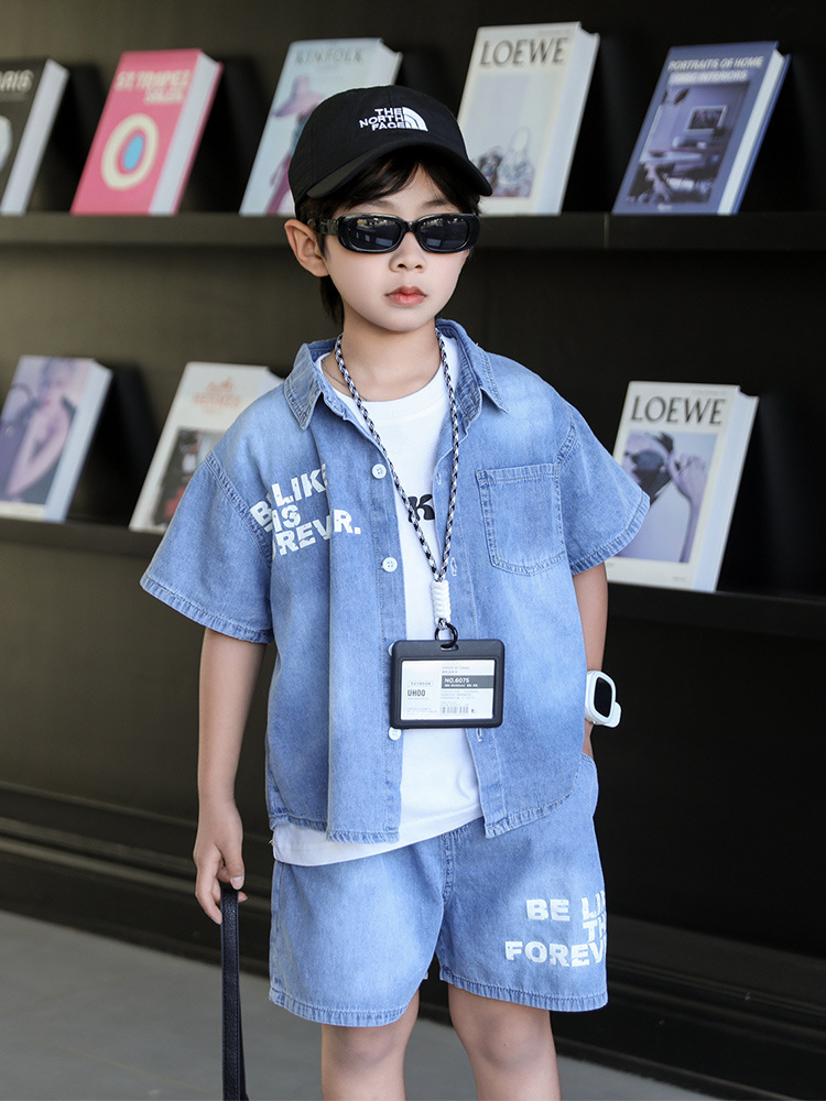 맞춤형 여름 데님 세트 남아용 신상 반팔 데님 셔츠 루즈핏 데님 반바지 스타일리쉬한 아동복 세트스토어 가기