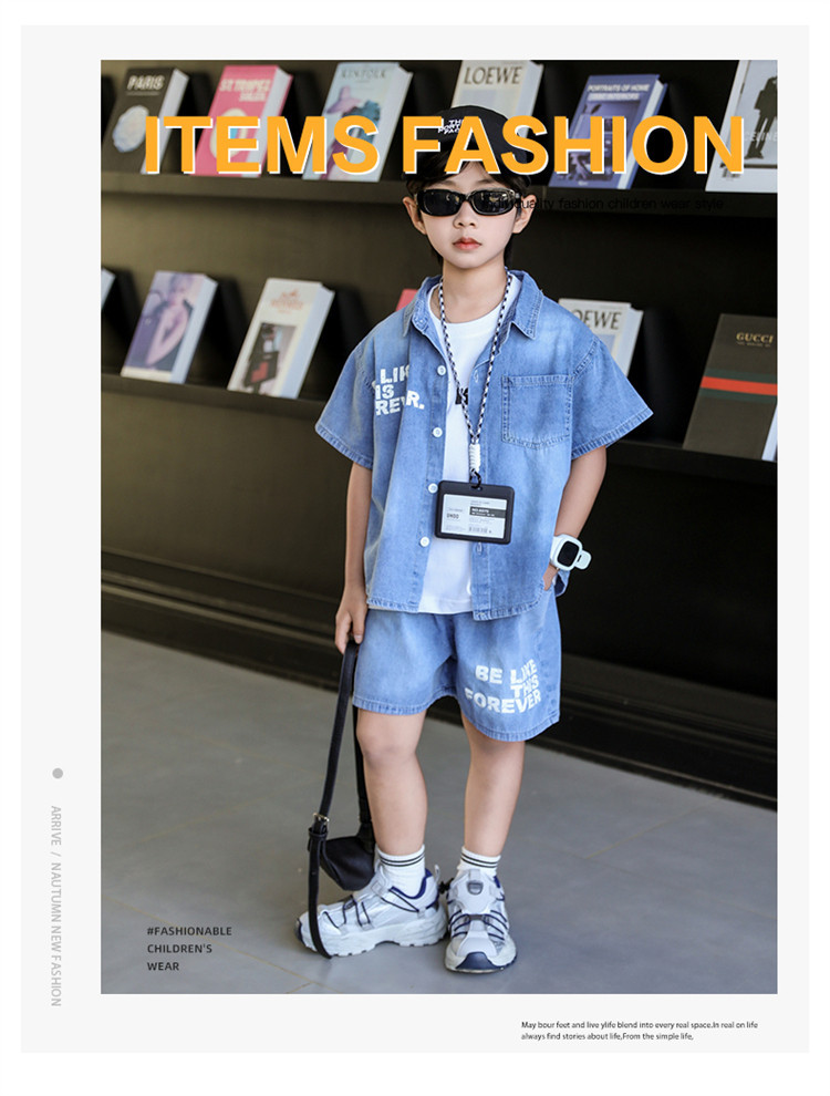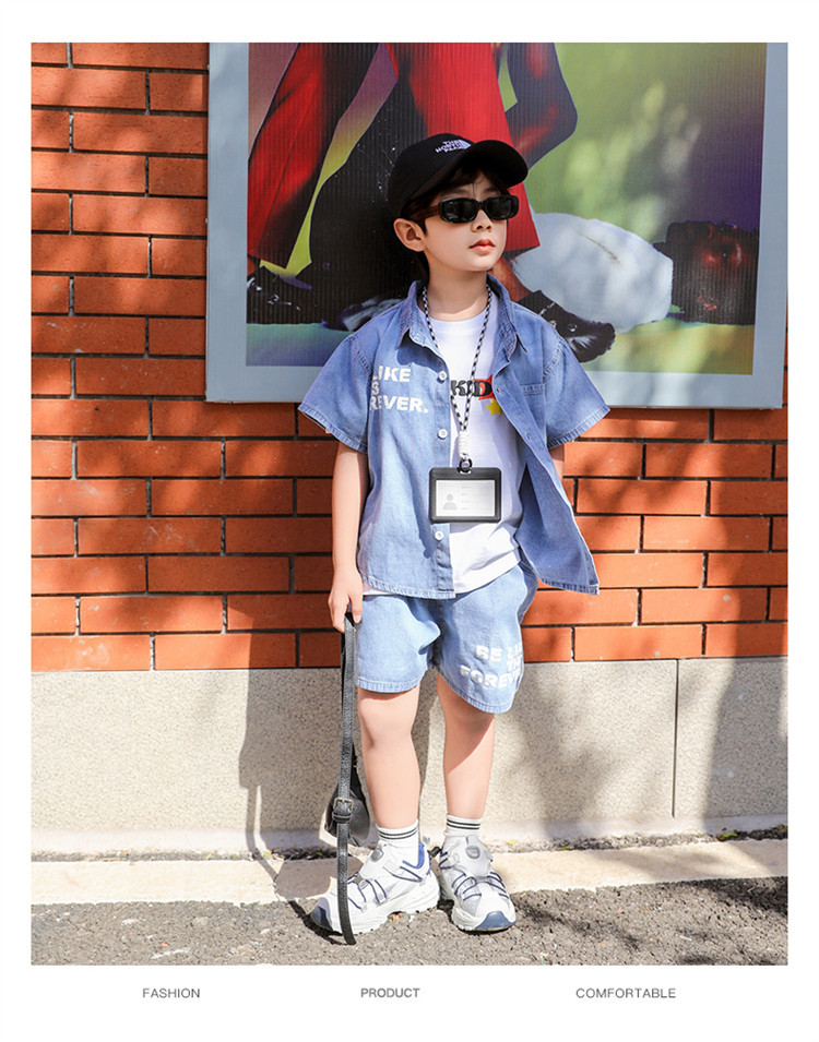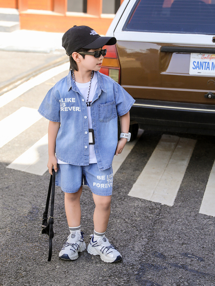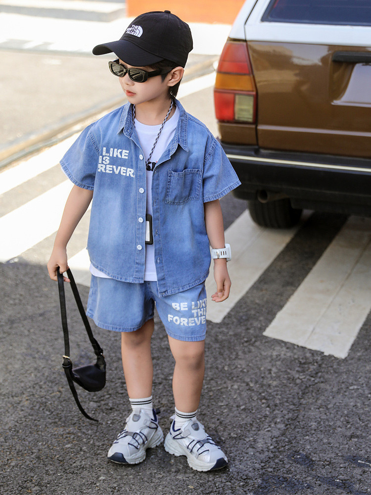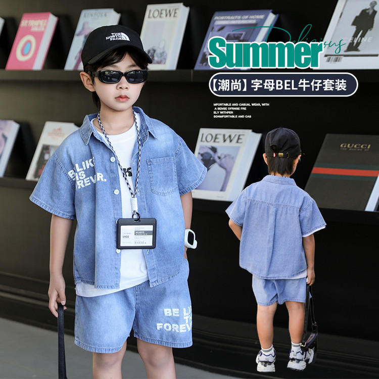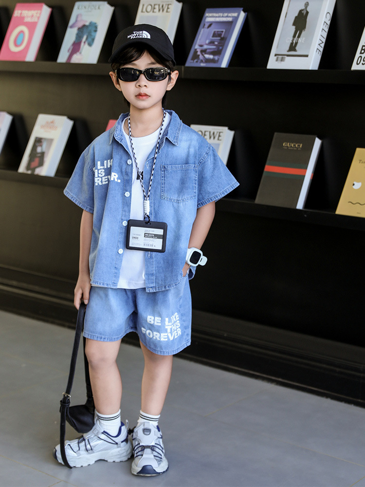 맞춤형 여름 데님 세트 남아용 신상 반팔 데님 셔츠 루즈핏 데님 반바지 스타일리쉬한 아동복 세트스토어 가기