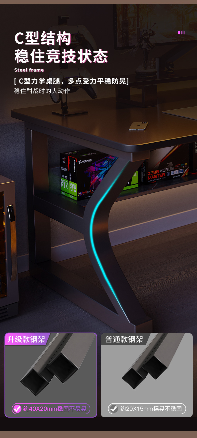 • [두꺼운 40*20mm C자형 강철다리] 블랙 120*60cm (테이블 하부선반으로 가로판 보강)