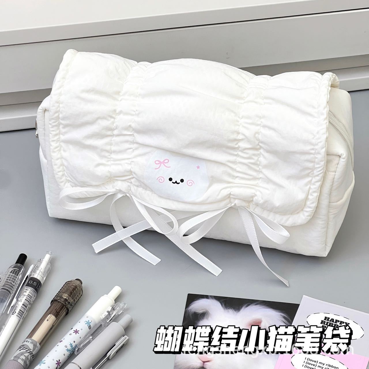 Ins 스타일 솔리드 컬러 부드러운 새끼 고양이 풀 아웃 보우 펜 가방 발레 스타일 대용량 학생 문구 보관 가방