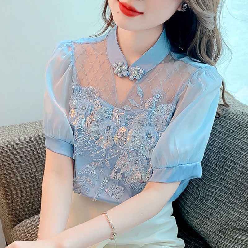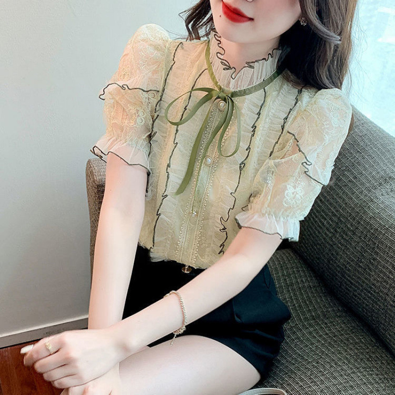 (예약판매) 여름 퍼프소매 쉬폰 셔츠 여성용 퍼프소매 2025 신상 궁궐풍 레이스 블라우스스토어 가기