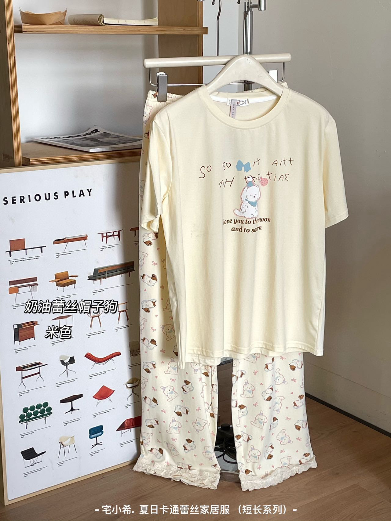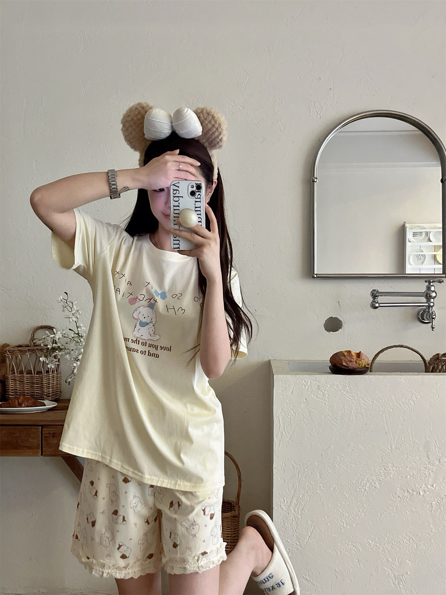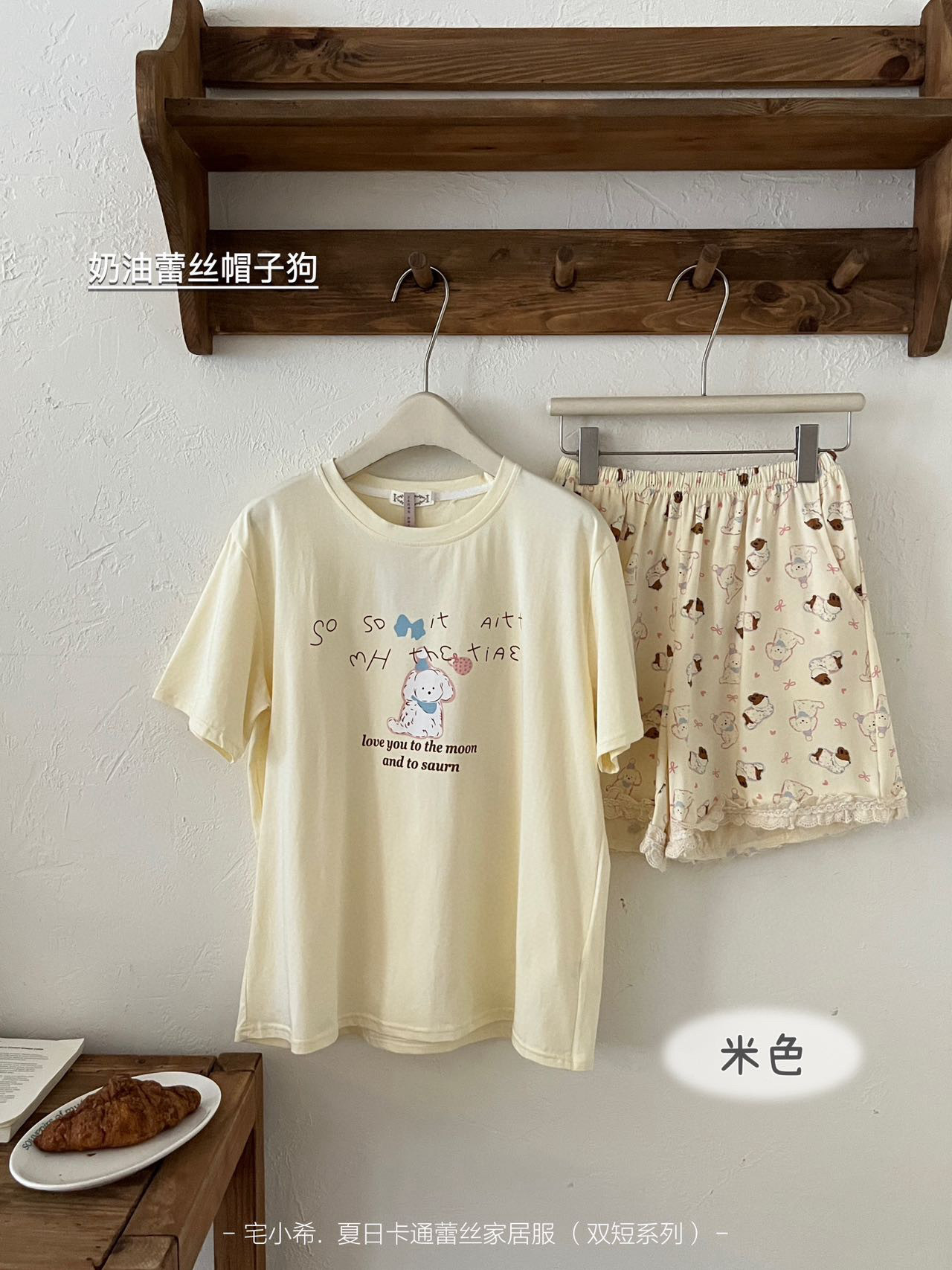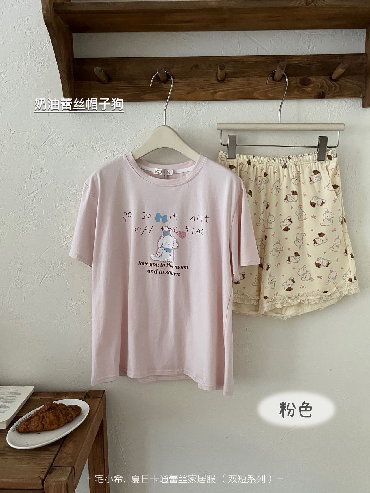 Zaoshixi 여름 만화 레이스 홈웨어 마이크로 비즈니스 인기 얼음 도자기 면 반팔 라운드 넥 느슨한 소녀 잠옷