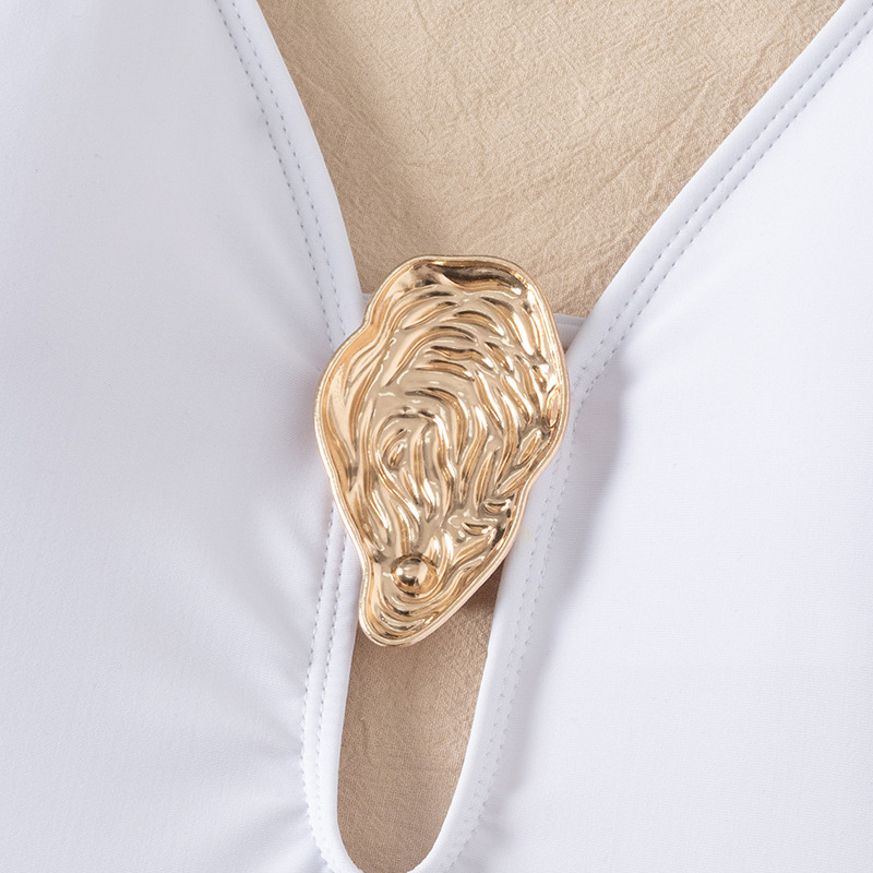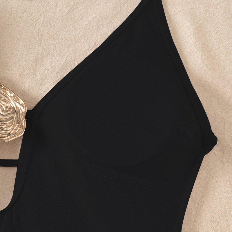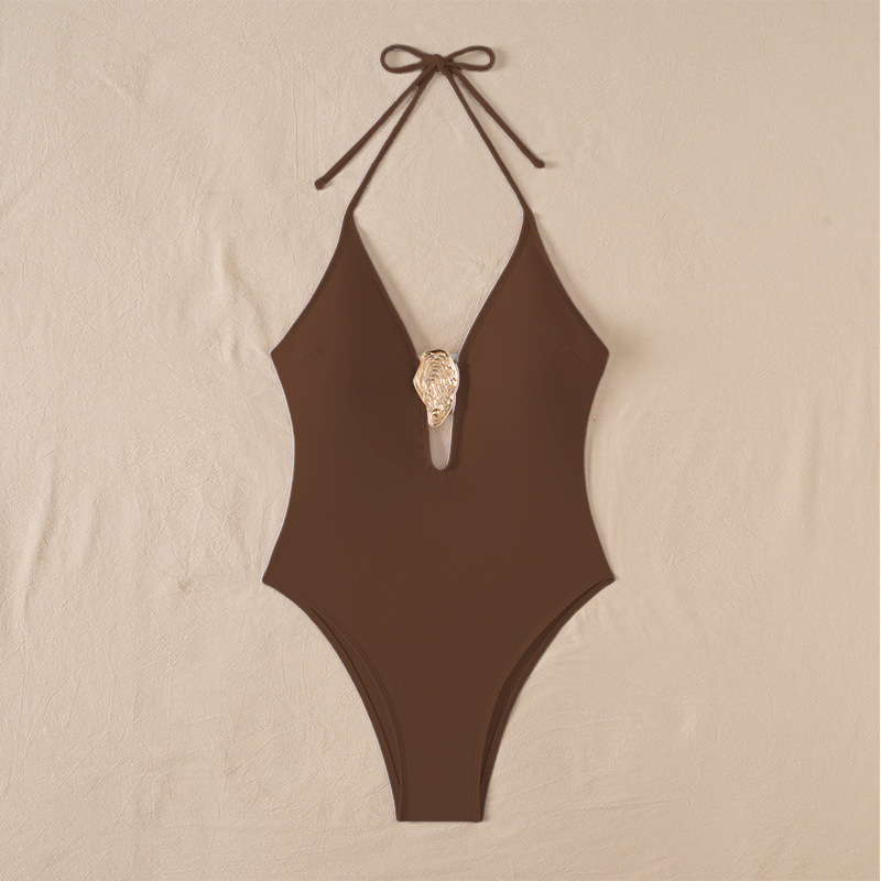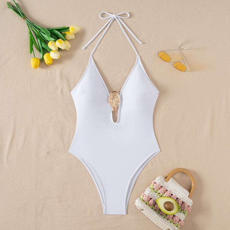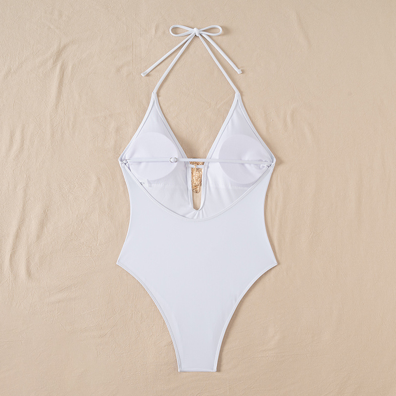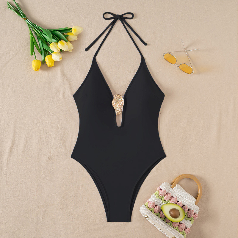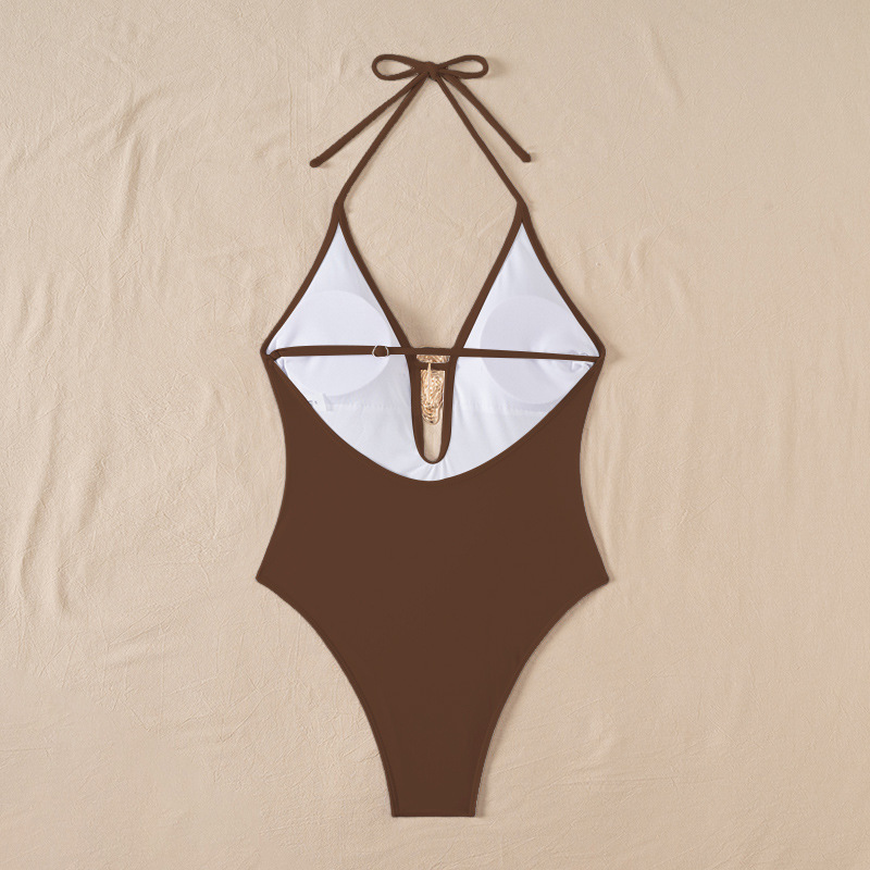 2025 유럽과 미국의 국경 깊은 V 섹시한 비키니는 단색 원피스 수영복 여성 대외 무역 삼각형 속이 빈 수영복을 모았습니다.스토어 가기