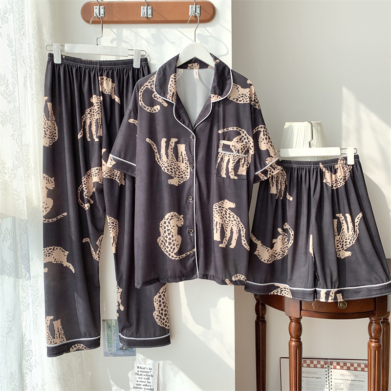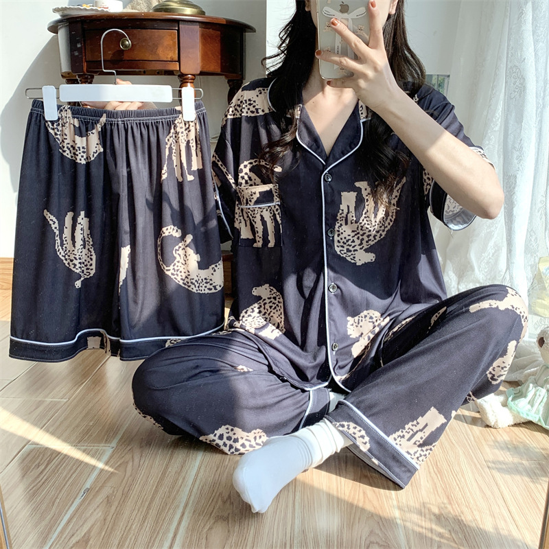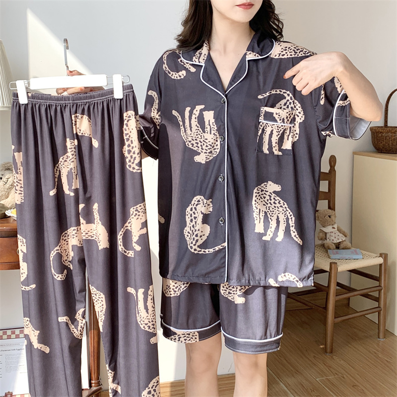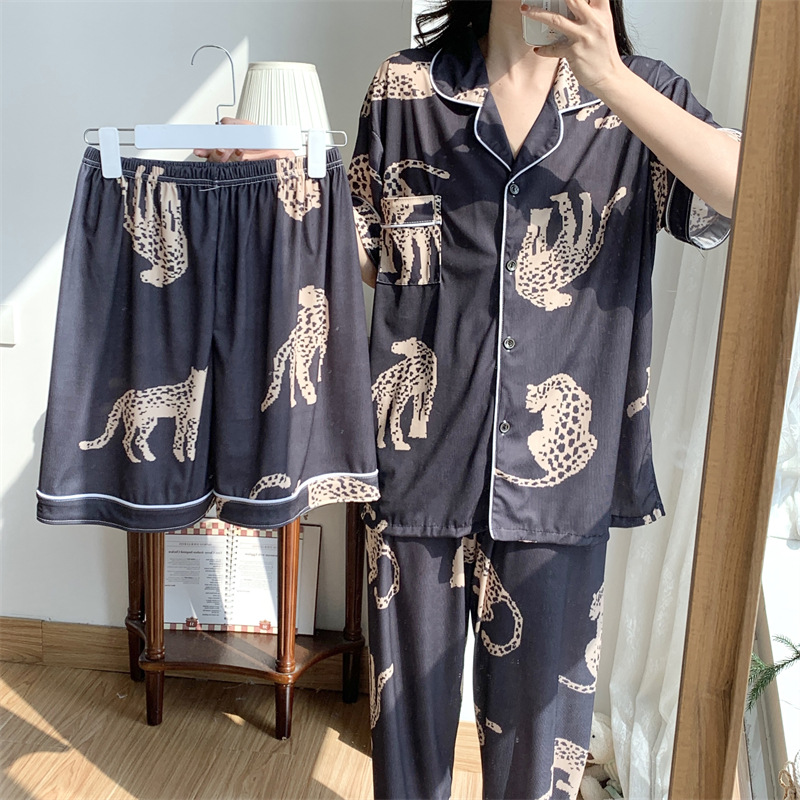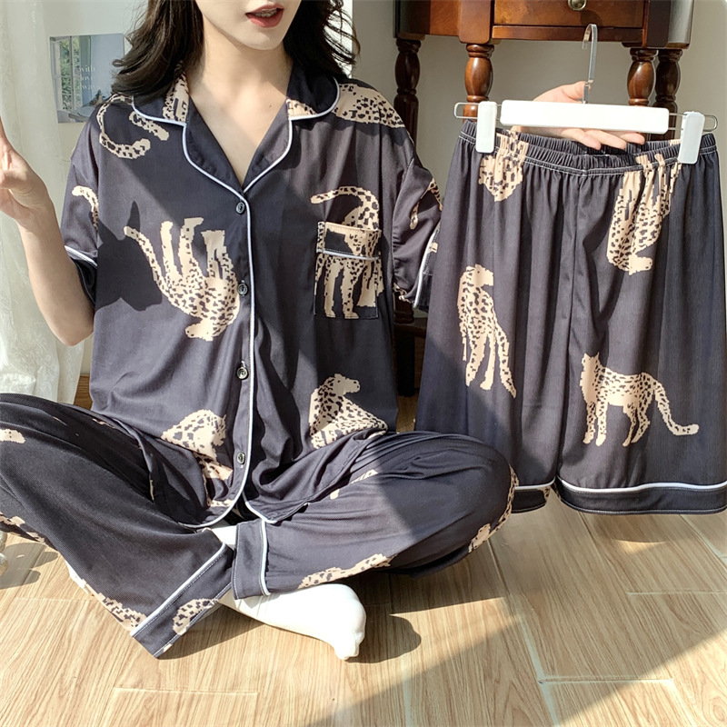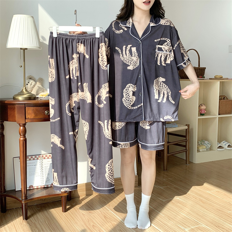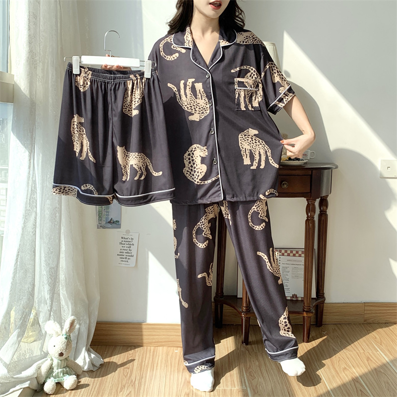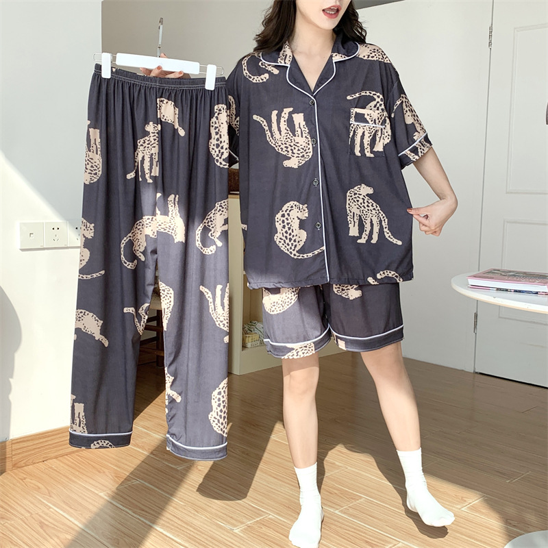 여성용 아이스 실크 반팔 긴바지 3피스 잠옷 세트, 여름용, 큰 사이즈, 뚱뚱한 여성용, 150kg 사이즈, 루즈핏, 만화 캐릭터 홈웨어스토어 가기