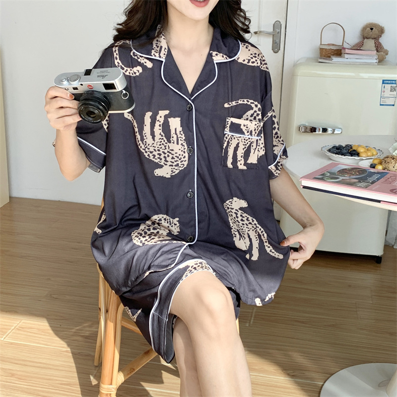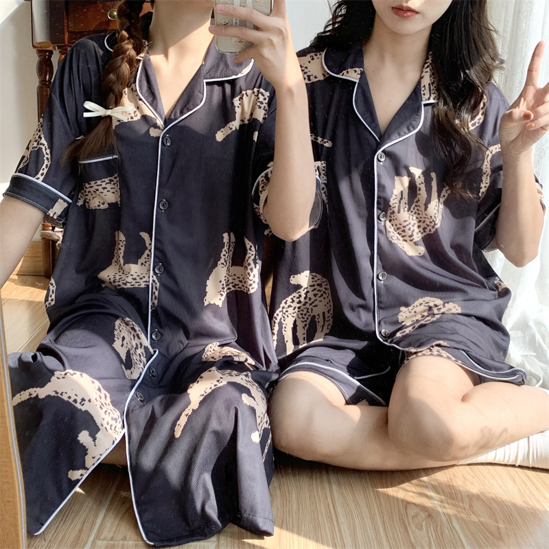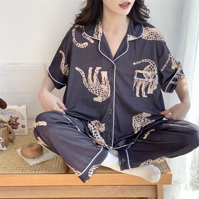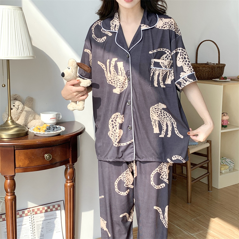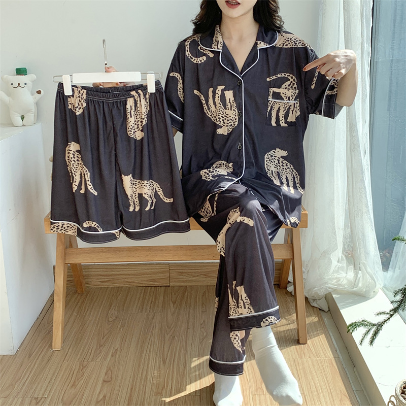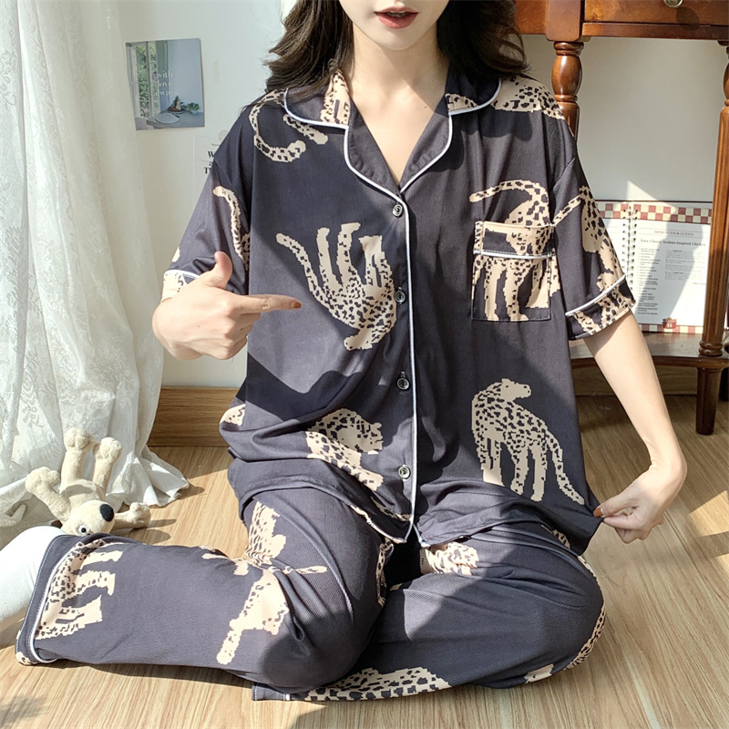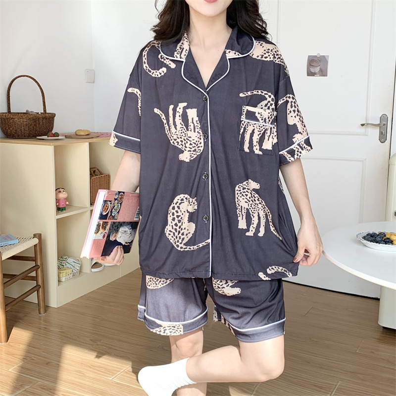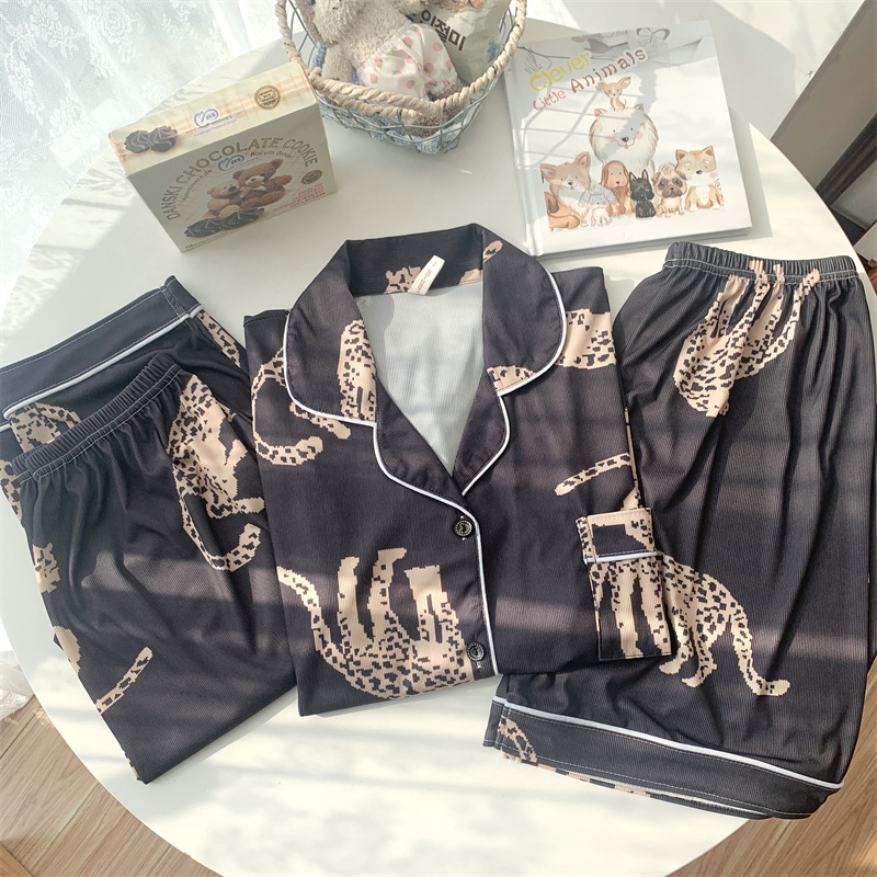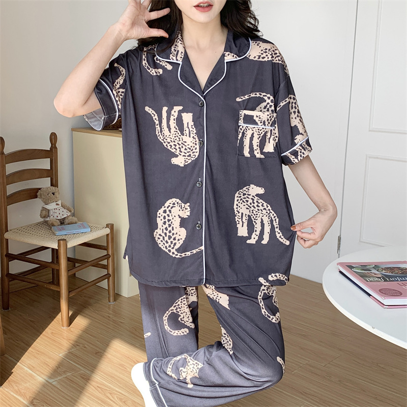여성용 아이스 실크 반팔 긴바지 3피스 잠옷 세트, 여름용, 큰 사이즈, 뚱뚱한 여성용, 150kg 사이즈, 루즈핏, 만화 캐릭터 홈웨어스토어 가기