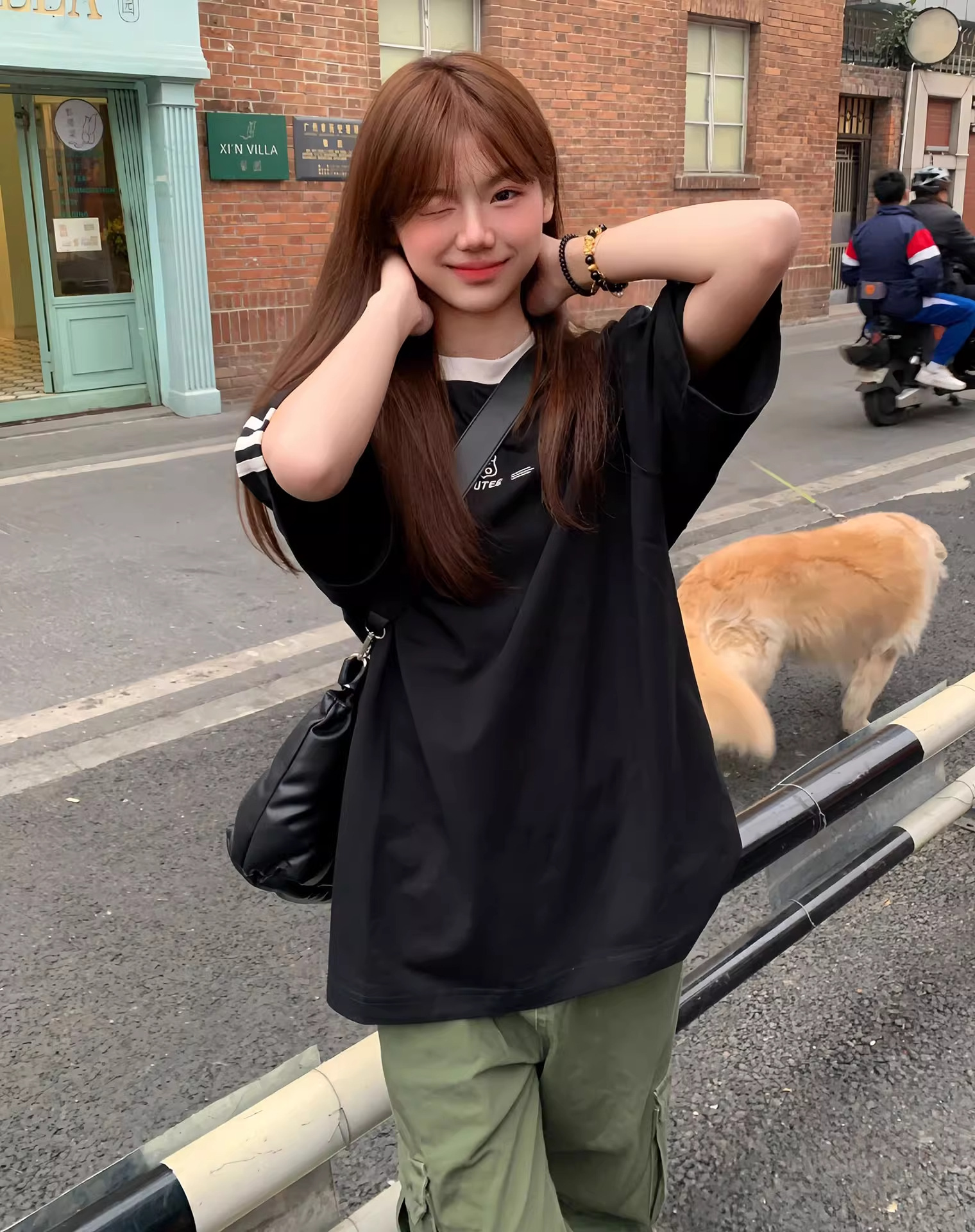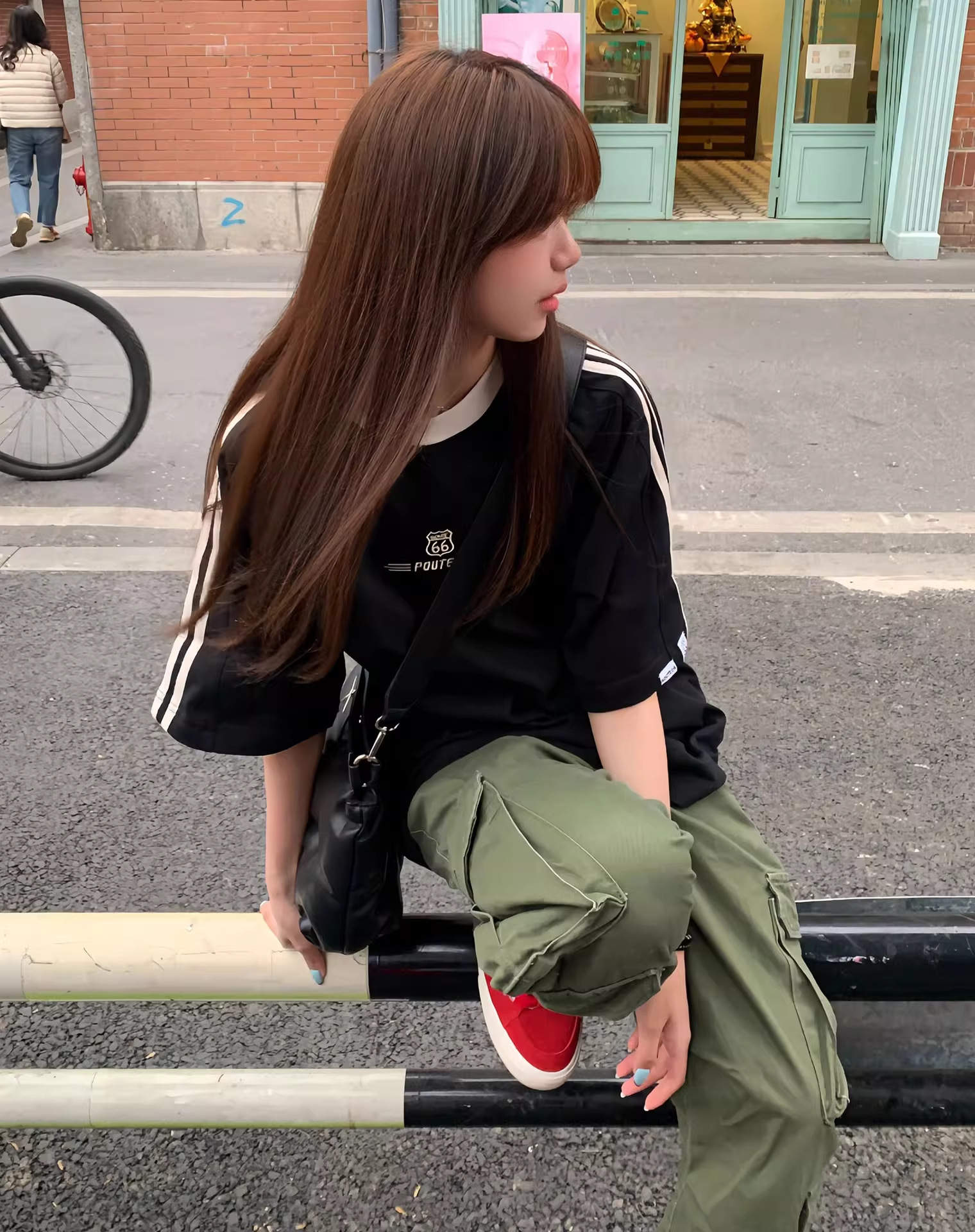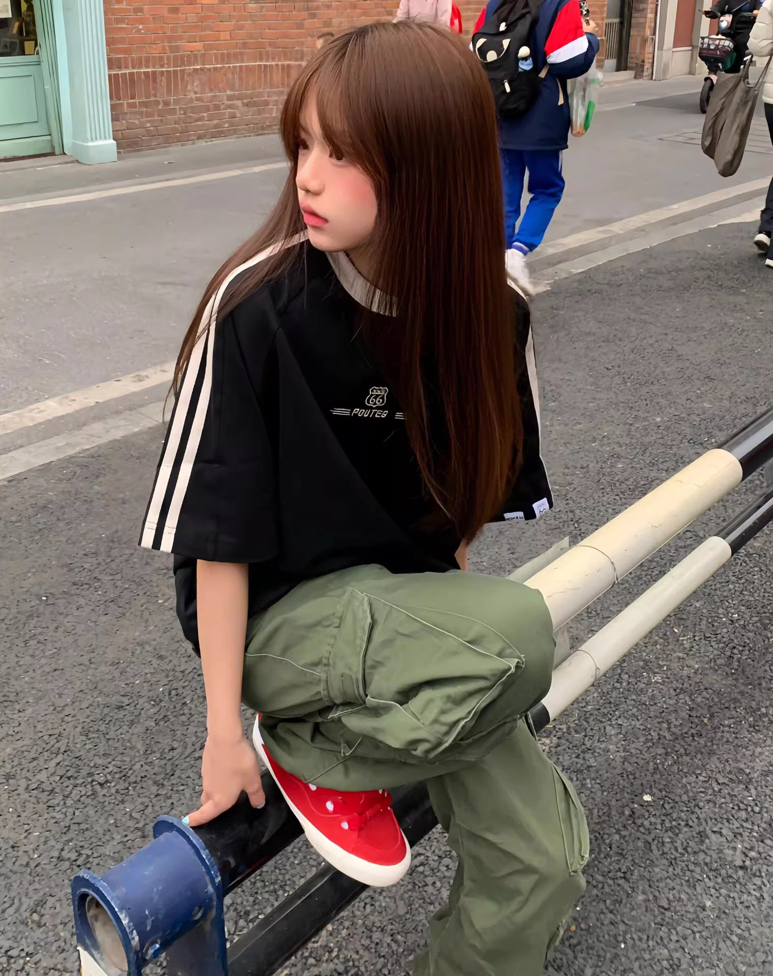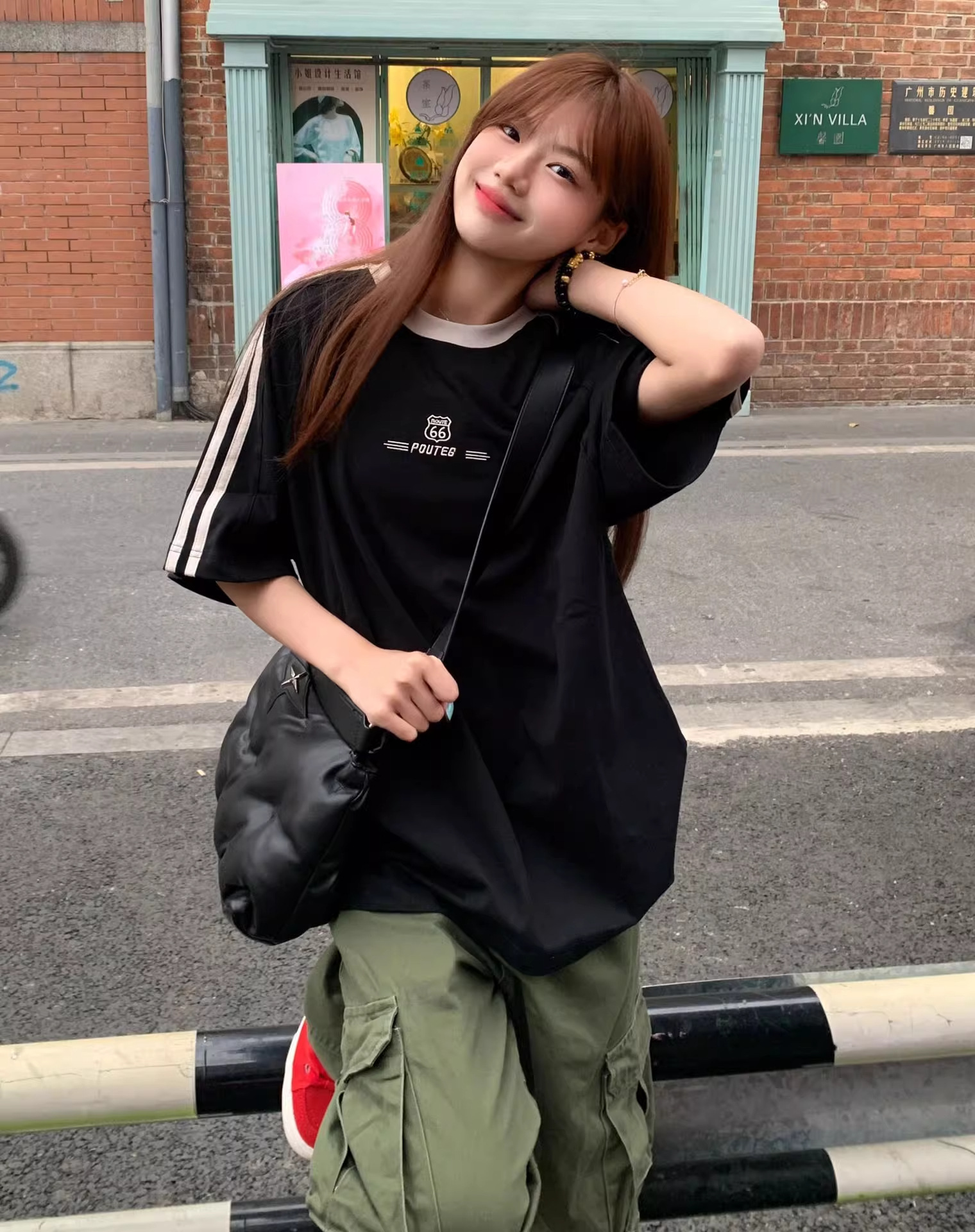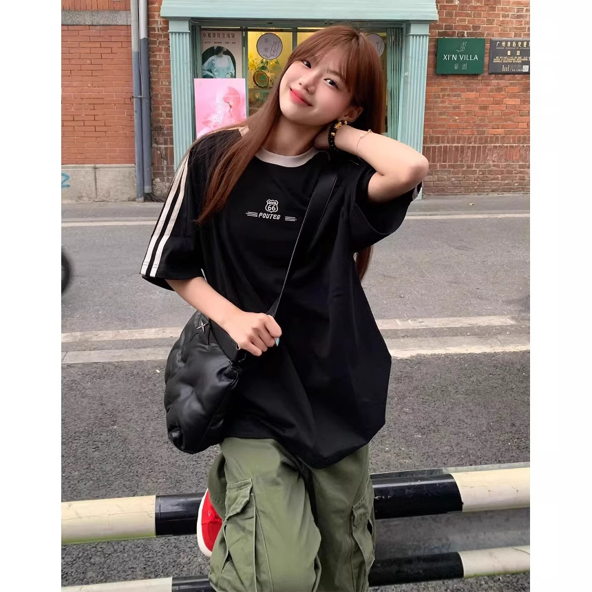 여성, 고등학생 및 대학생을위한 순면 흰색 세 줄무늬 반팔 티셔츠 여름 새 느슨한 반팔 탑스토어 가기