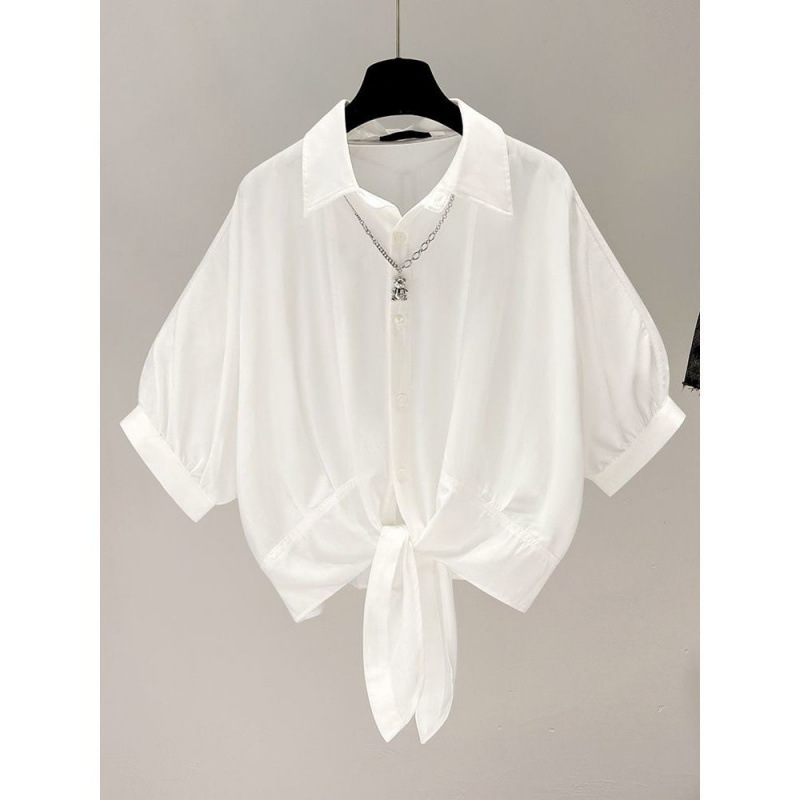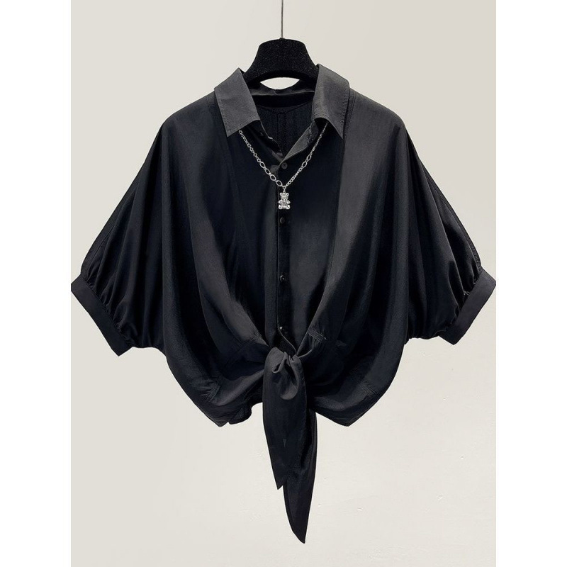 여름 여성용 검은색 반팔 셔츠, 허리가 잘록한 흰색 쉬폰 셔츠, 새로운 스타일의 틈새 배트 슬리브 쇼트 탑