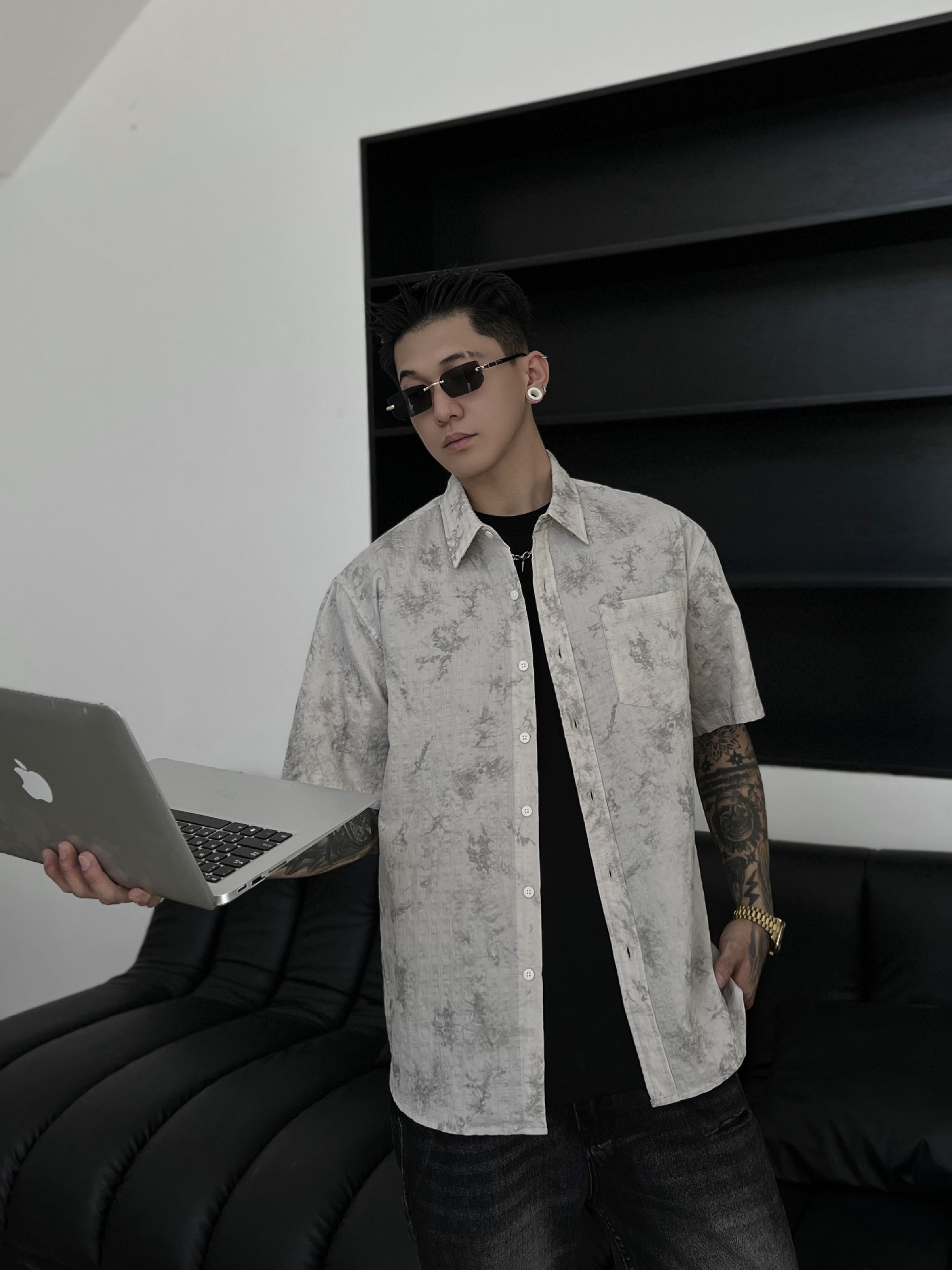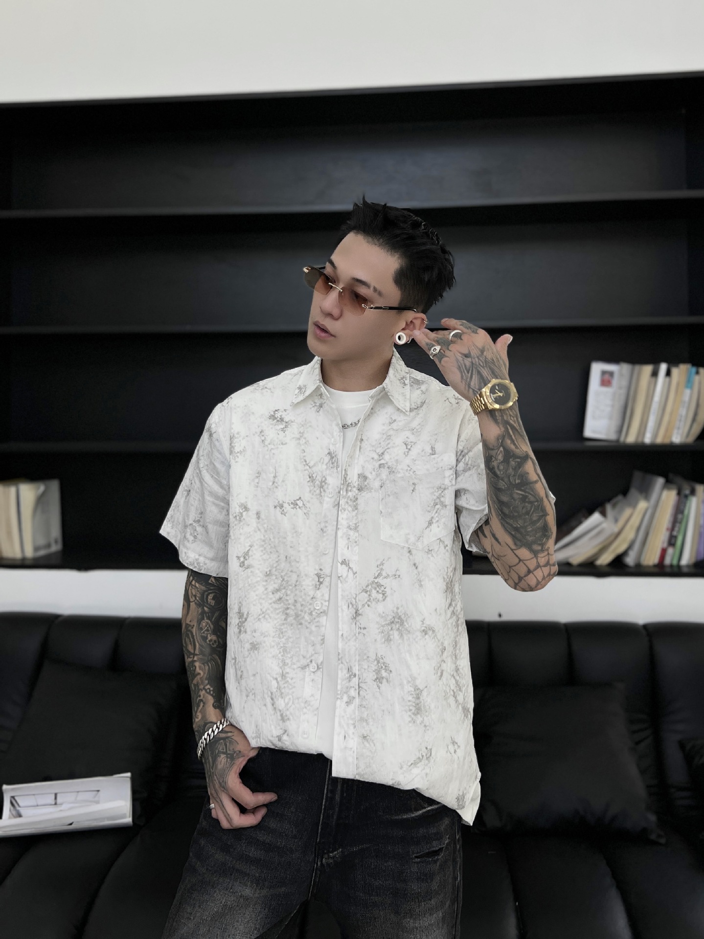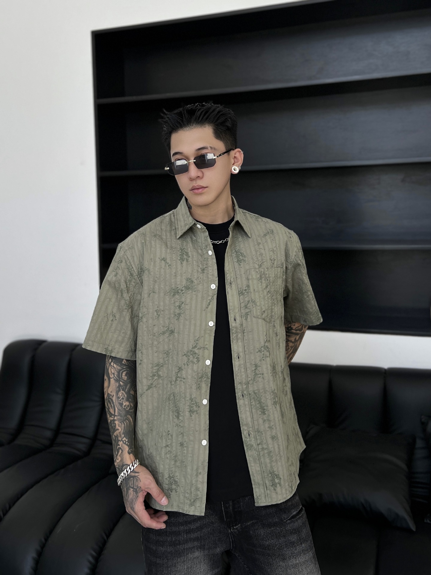 남성 의류 여름 시원한 느낌 Tencel 셔츠 남성 반팔 여름 잉크 인쇄 얼음 실크 셔츠 겉옷 2164스토어 가기