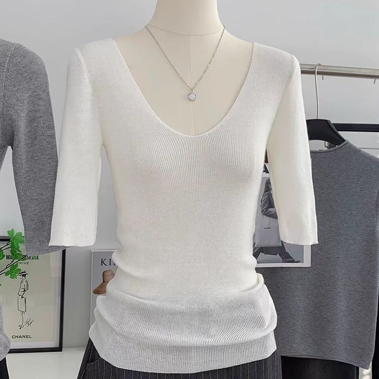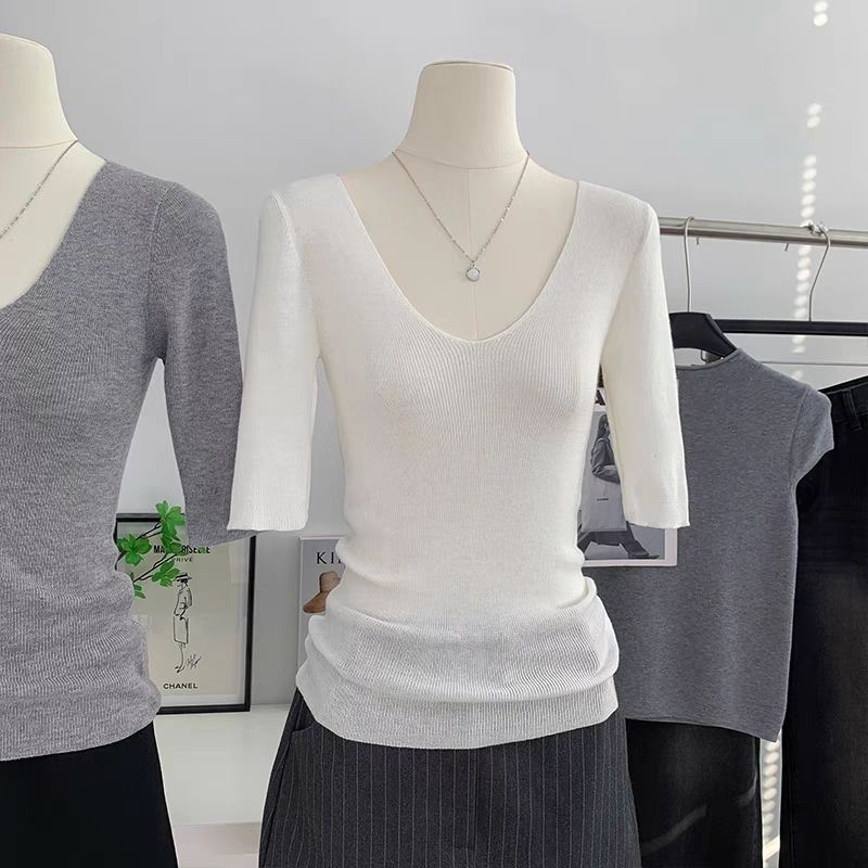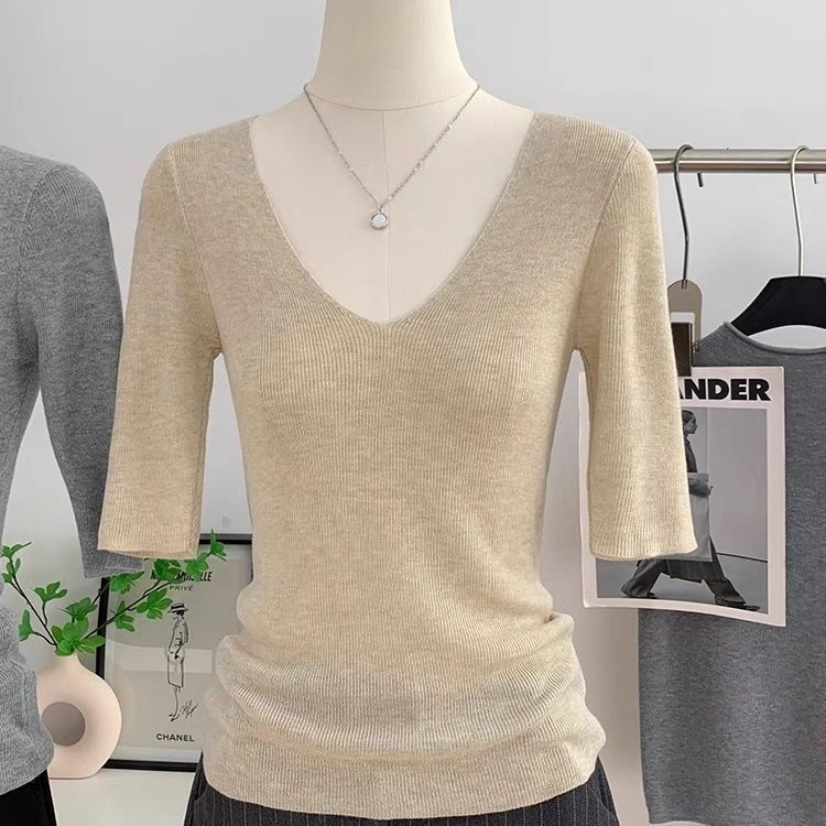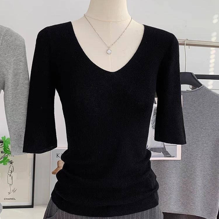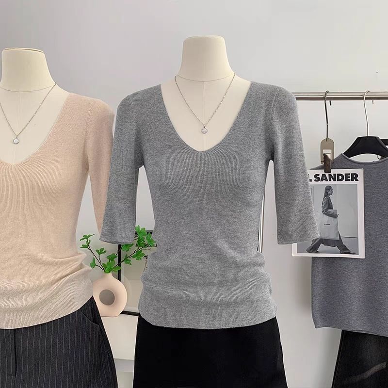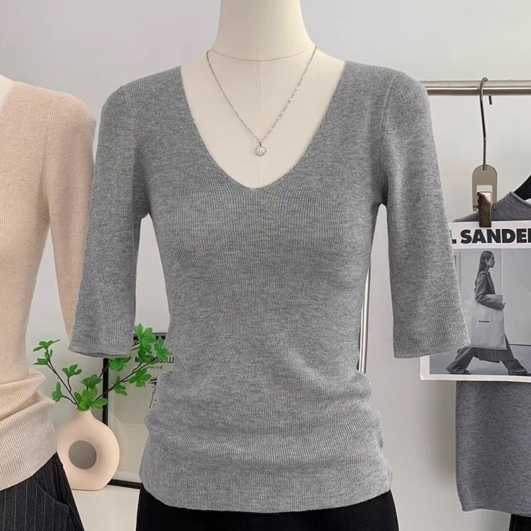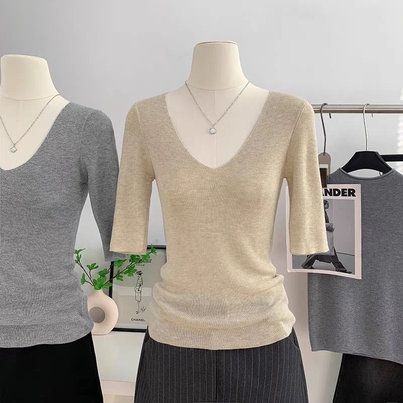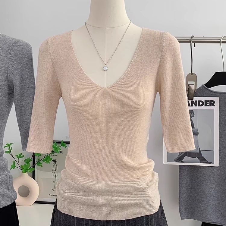 봄 여름 여성용 얇은 V 넥 슬림핏 미드 슬리브 스웨터 독특하고 아름다운 이너 레이어링 탑스토어 가기