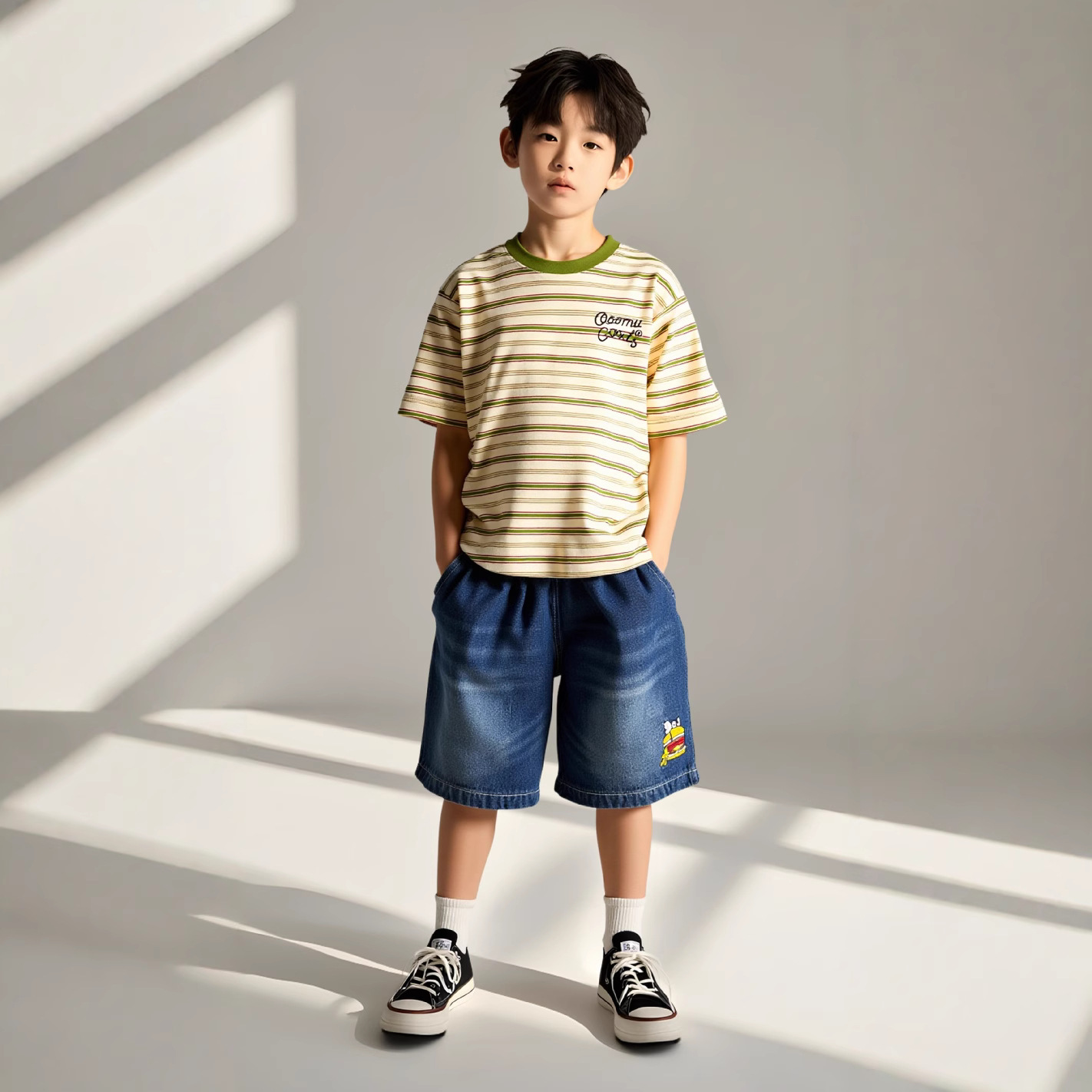 Spot Harada Nozomi 아동 여름 의류 아동용 라운드 넥 반팔 스트라이프 셔츠 새로운 소년 만화 자수 라운드 넥 티셔츠