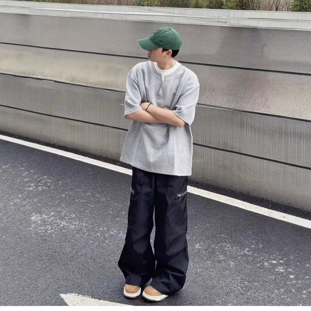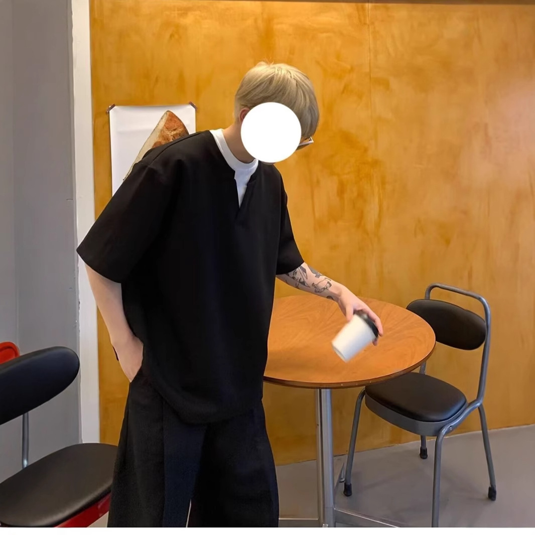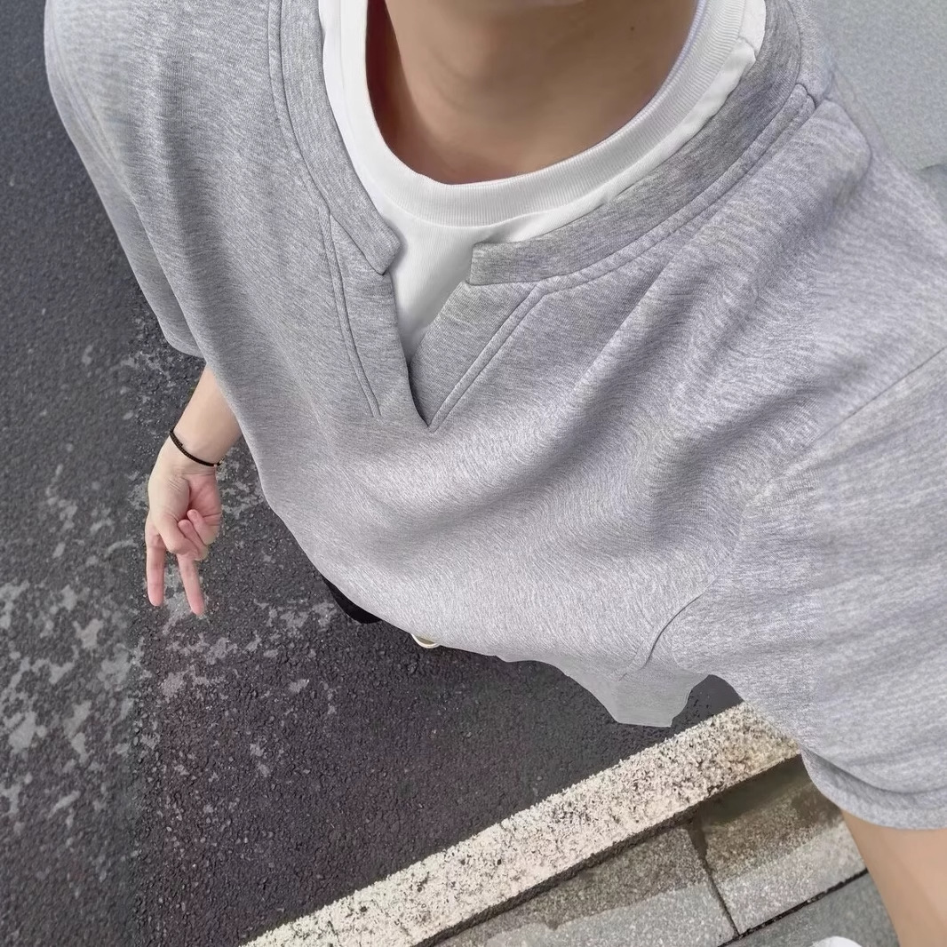 니치 디자인 가짜 투피스 브이넥 반팔 티셔츠 남성 여름 루즈 보텀 셔츠 한국 스타일 심플 다용도 반팔스토어 가기