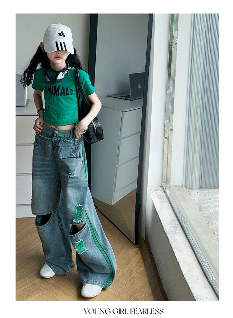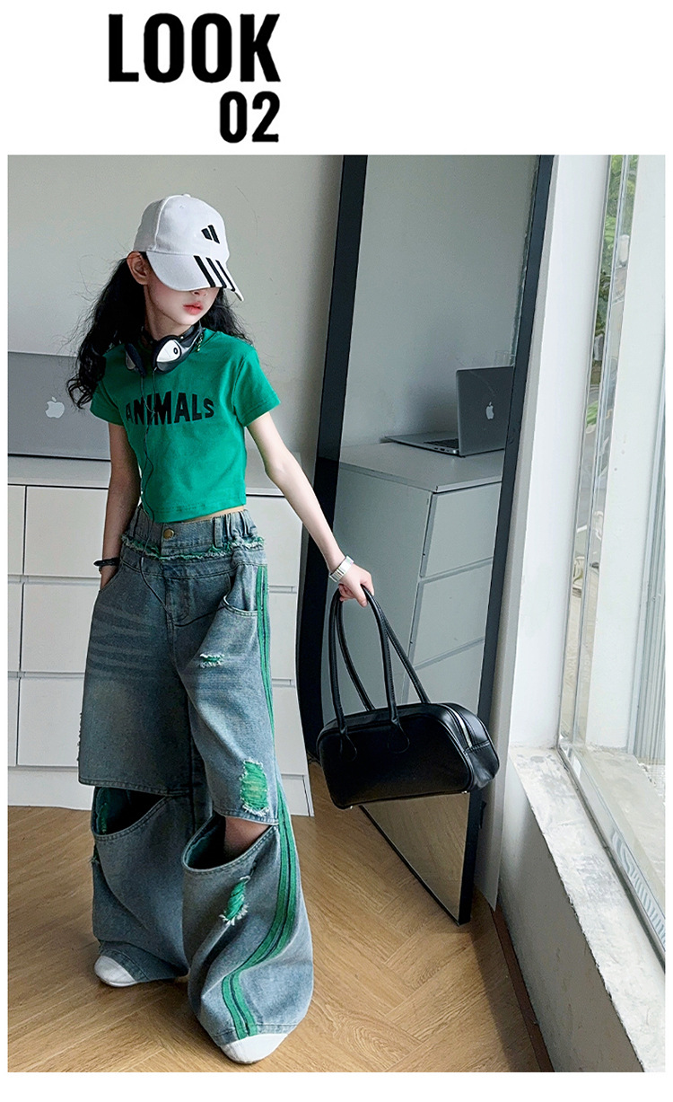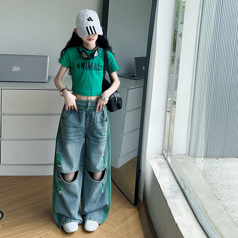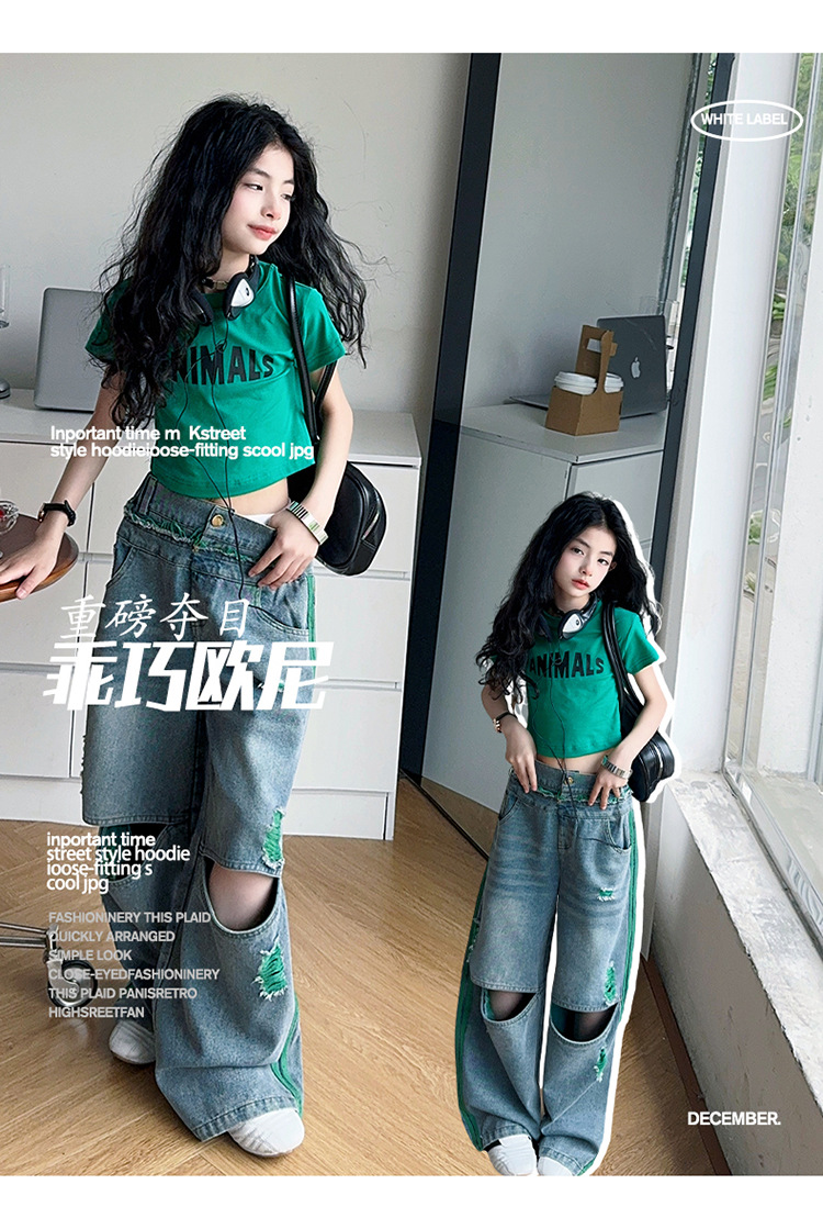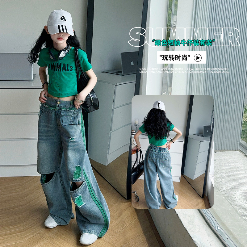 소녀의 큰 소년의 찢어진 청바지 소녀의 폭발 거리 슬림 핏 배꼽 반팔 외국 스타일 핫 소녀 어린이 유행 쿨 투피스 세트스토어 가기