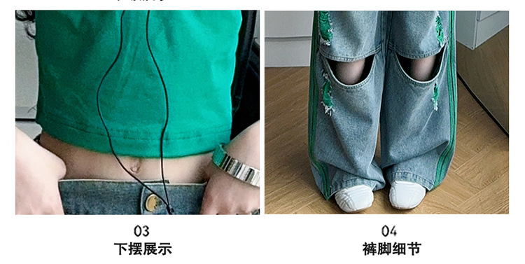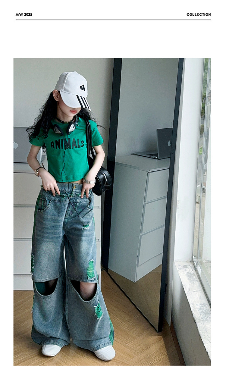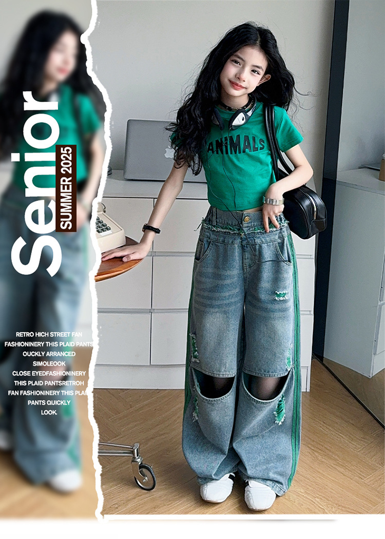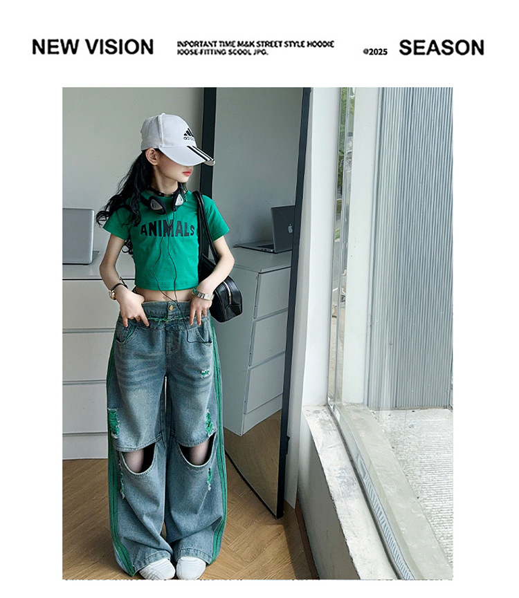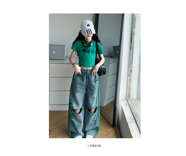소녀의 큰 소년의 찢어진 청바지 소녀의 폭발 거리 슬림 핏 배꼽 반팔 외국 스타일 핫 소녀 어린이 유행 쿨 투피스 세트스토어 가기