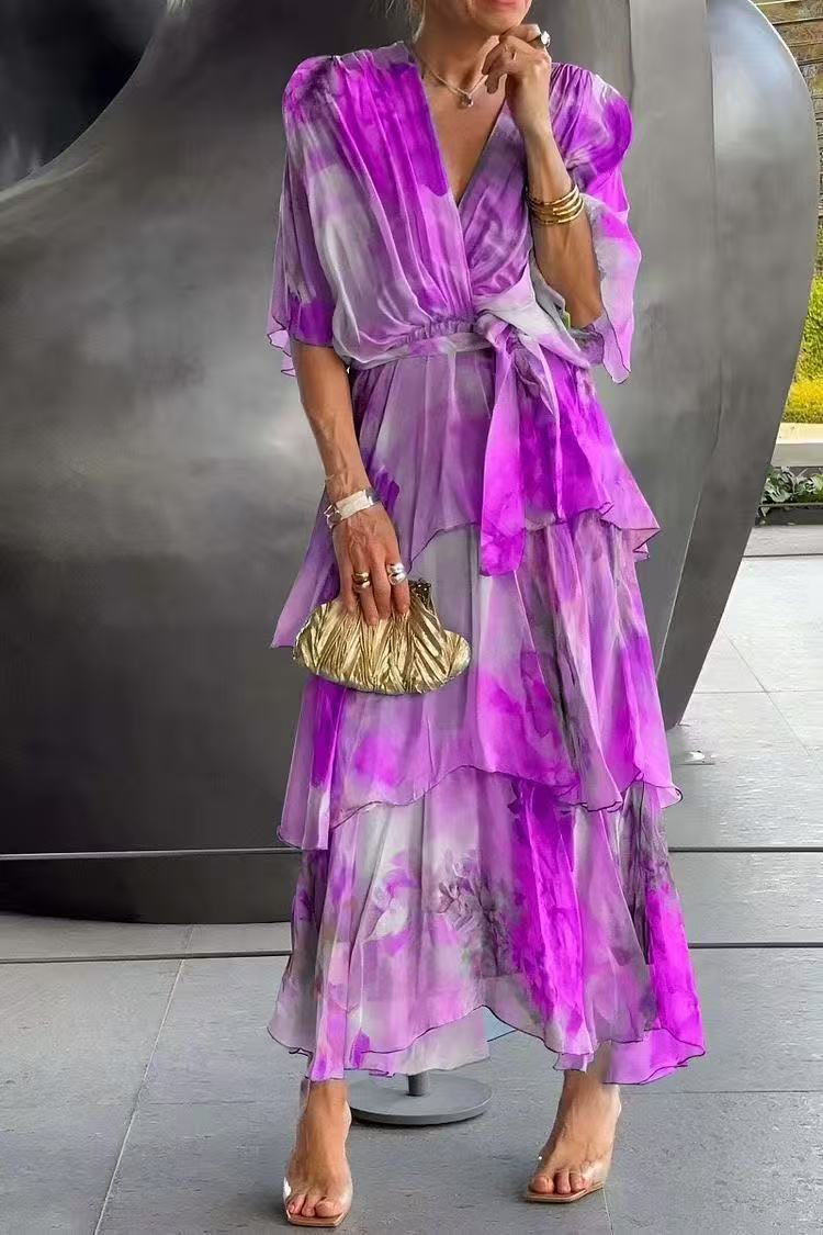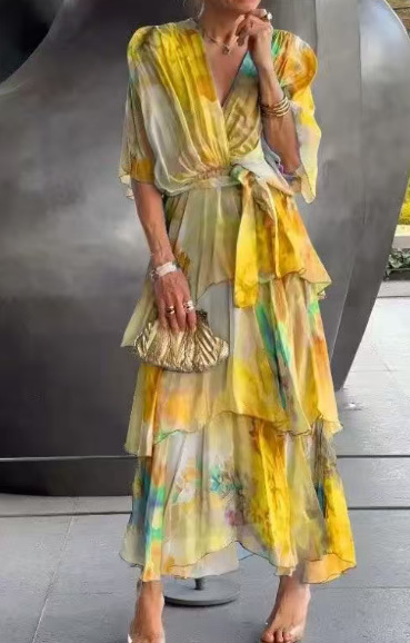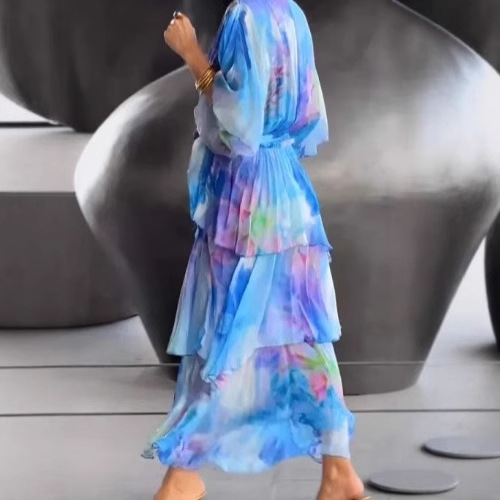 2025년 유럽 및 미국 해외 아마존 독립 홈페이지 신상 봄 여름 그라데이션 프린트 레이어드 패션 여성 원피스