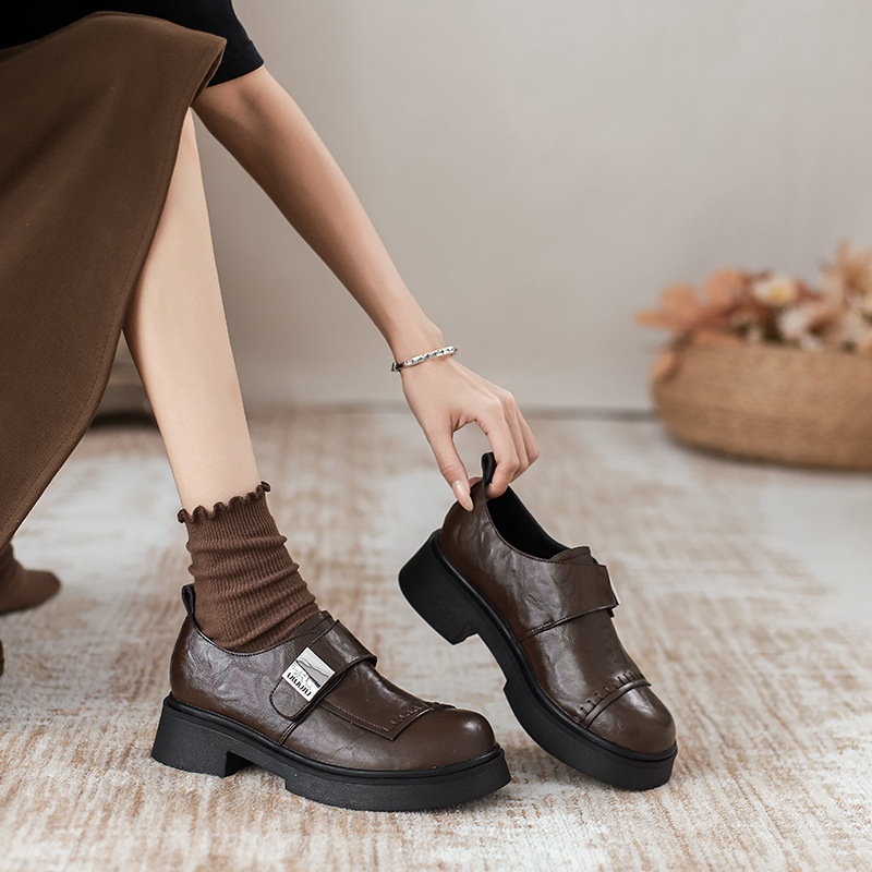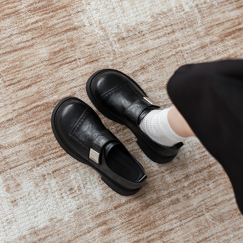 2025 봄 새로운 검은 색 작은 가죽 신발 부드러운 가죽 프랑스 복고풍 대학 스타일 jk 벨크로 여성을위한 두꺼운 밑창 로퍼