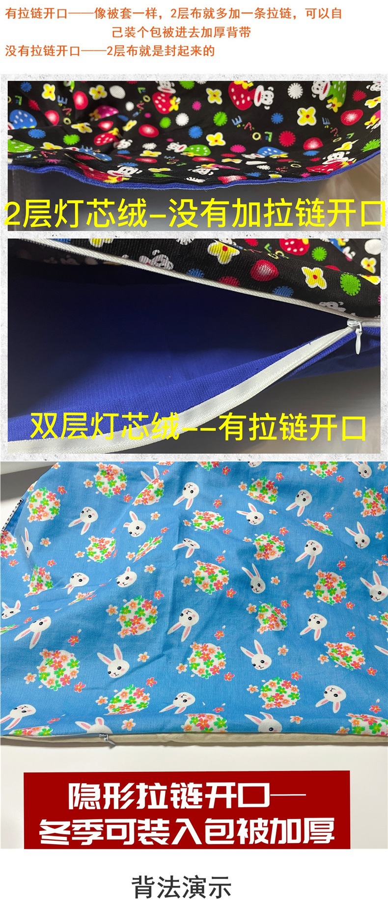 • 지퍼가 달린 입구가 있어 겨울에는 두꺼운 이중 코듀로이로 이불을 넣을 수 있습니다.