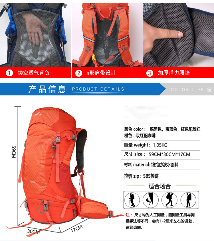 대용량 전문 등산 가방 야외 하이킹 배낭 방수 및 내마모성 경량 등산 장비 배낭