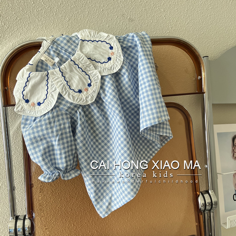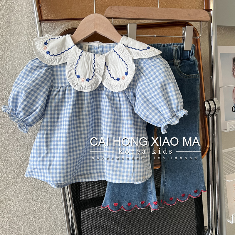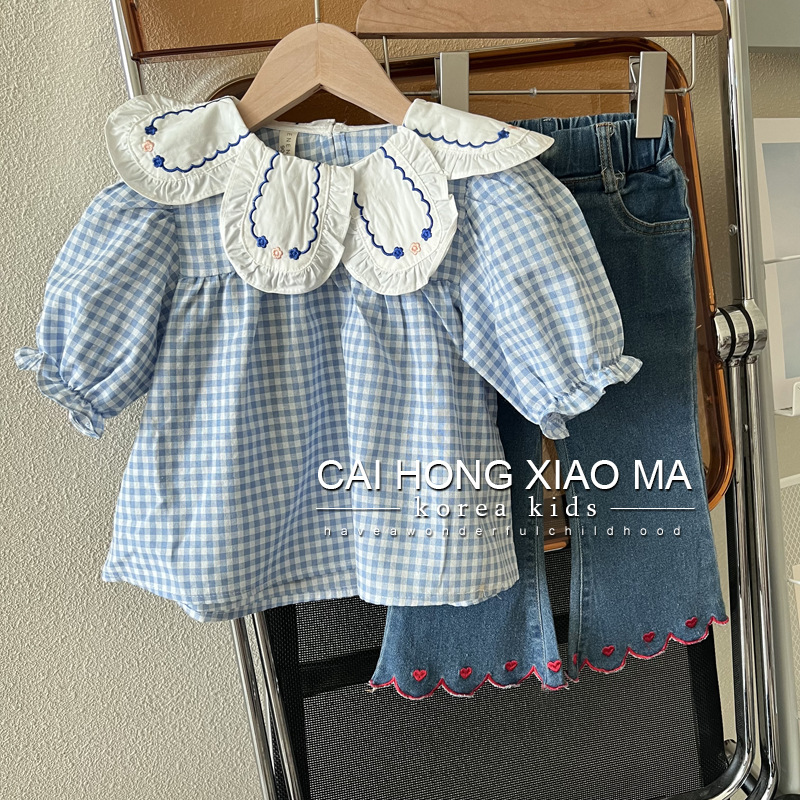 【세븐세븐】가을 아동복 여아 퍼프 소매 셔츠 어린이 스타일리시한 블루 체크무늬 롱 슬리브 셔츠스토어 가기