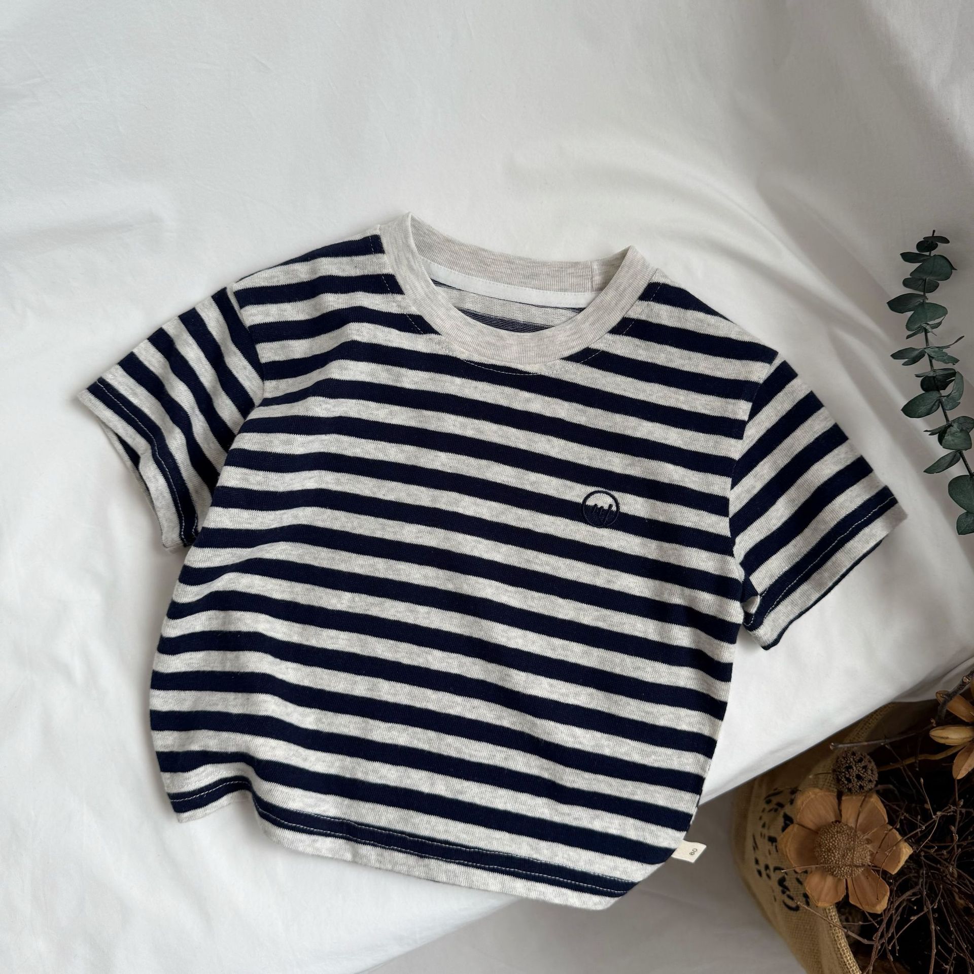 GL-kids 한국 여름 신작 어린이 줄무늬 자수 반팔 티셔츠 소년 소녀용 통기성 바닥 셔츠 T스토어 가기