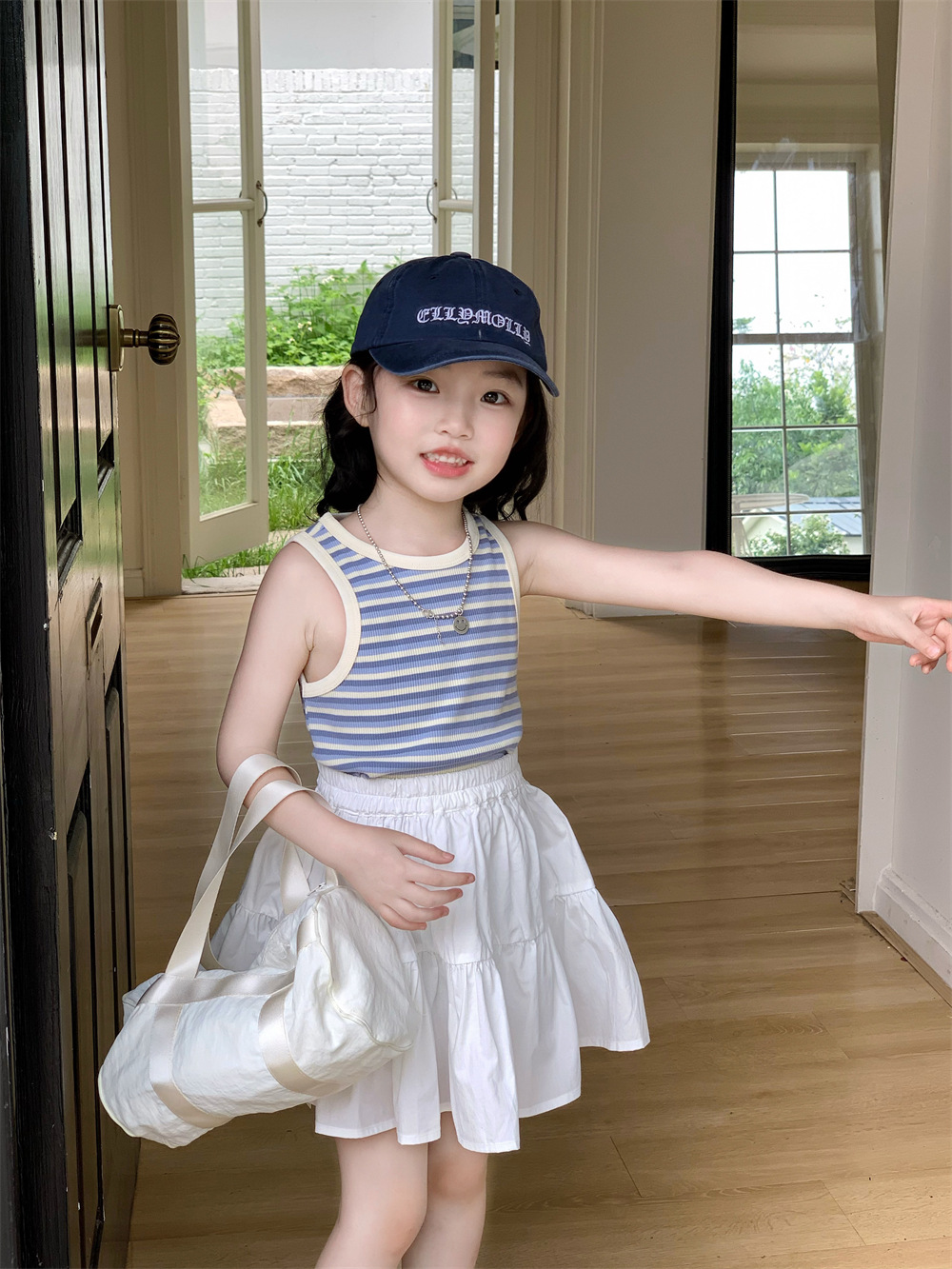 반품 불가~ 여아용 스트라이프 민소매 여름 스타일 아동용 흰색 스커트 유아복 세트 어린이용 짧은 치마 상의스토어 가기
