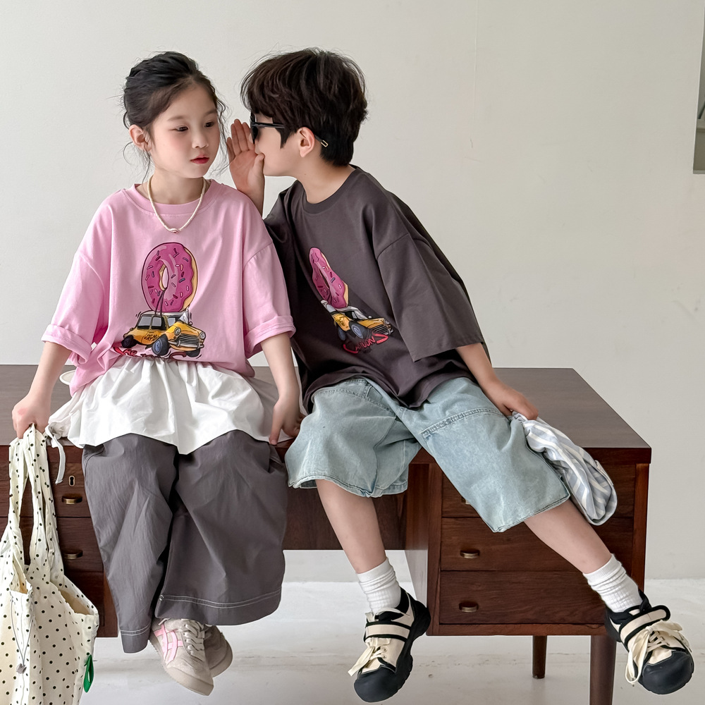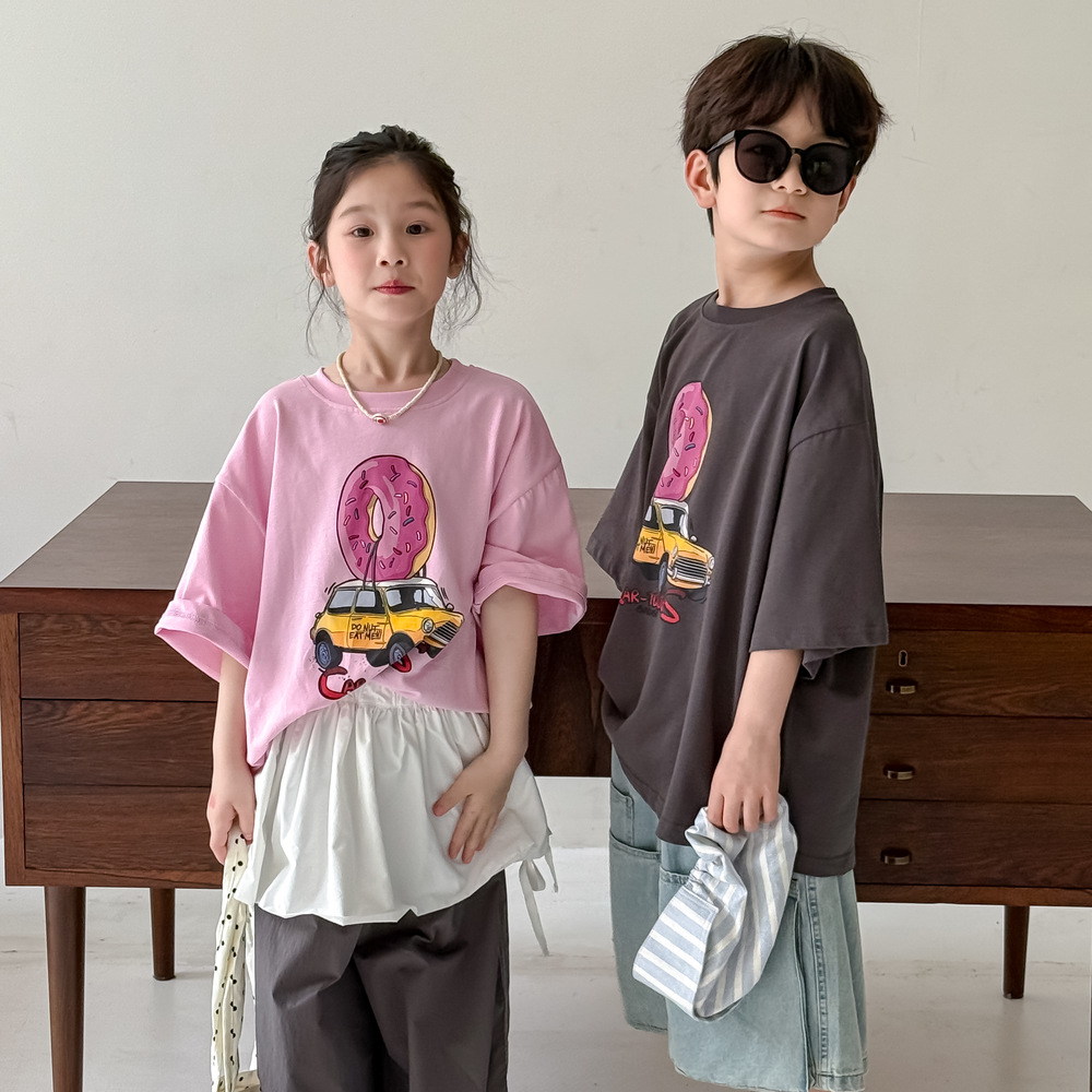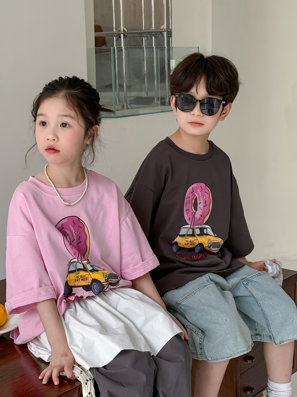 아동용 티셔츠 2026 여름 한국판 만화 자동차 프린트 반팔 아동용 라운드넥 캐주얼 루즈핏 상의