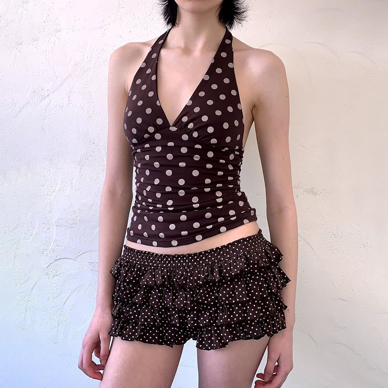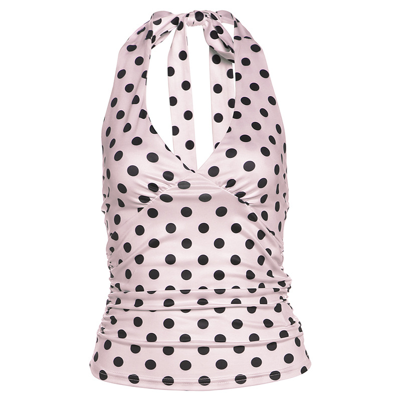 2025 여름 여성의 새로운 스타일 섹시한 검은색 폴카 도트 프린트 다목적 백리스 V 넥 홀터넥 타이트 조끼