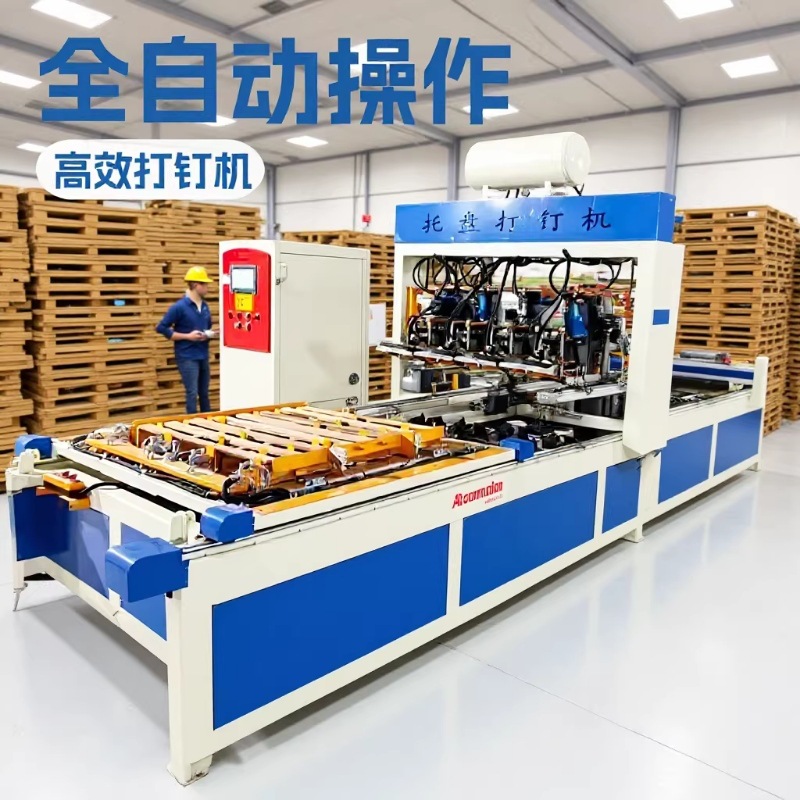 • 美式托盘打钉机是专门为生产标准托盘研发设计的一种托盘生产设备,本机采用全自动程序,操作系统采用进口PLC控制,触摸屏操作简单,控制方便,钉钉位置准确。