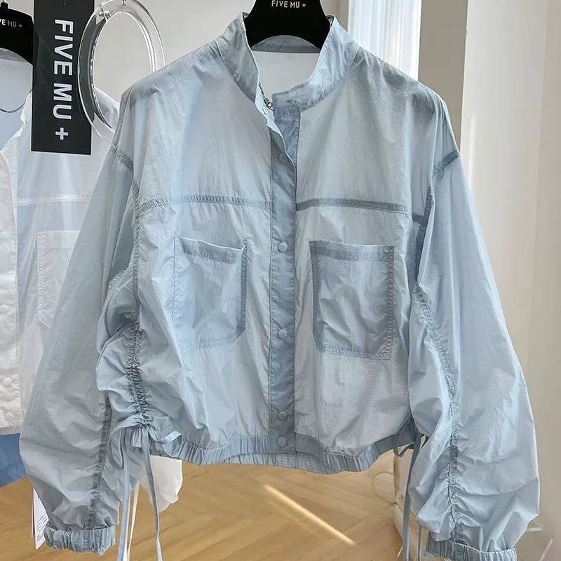 디자인 틈새 고급 주름진 얇은 스탠드 칼라 자외선 차단 의류 여성 유럽 여름 느슨한 짧은 재킷