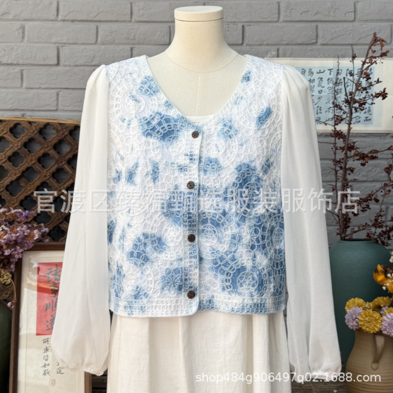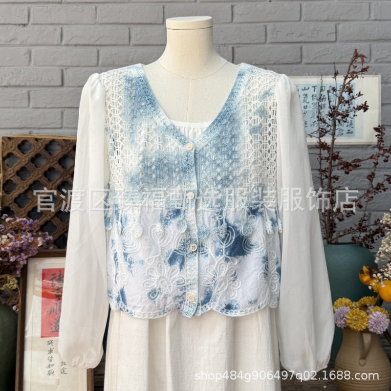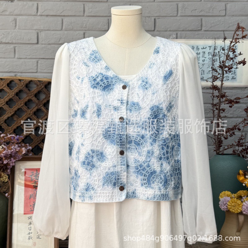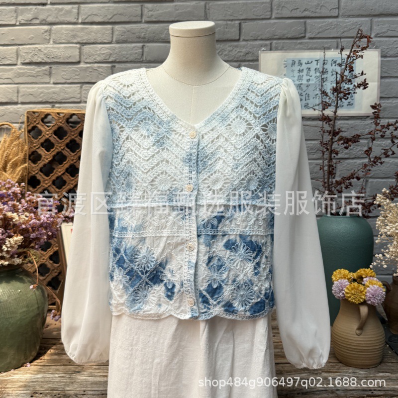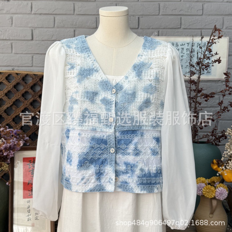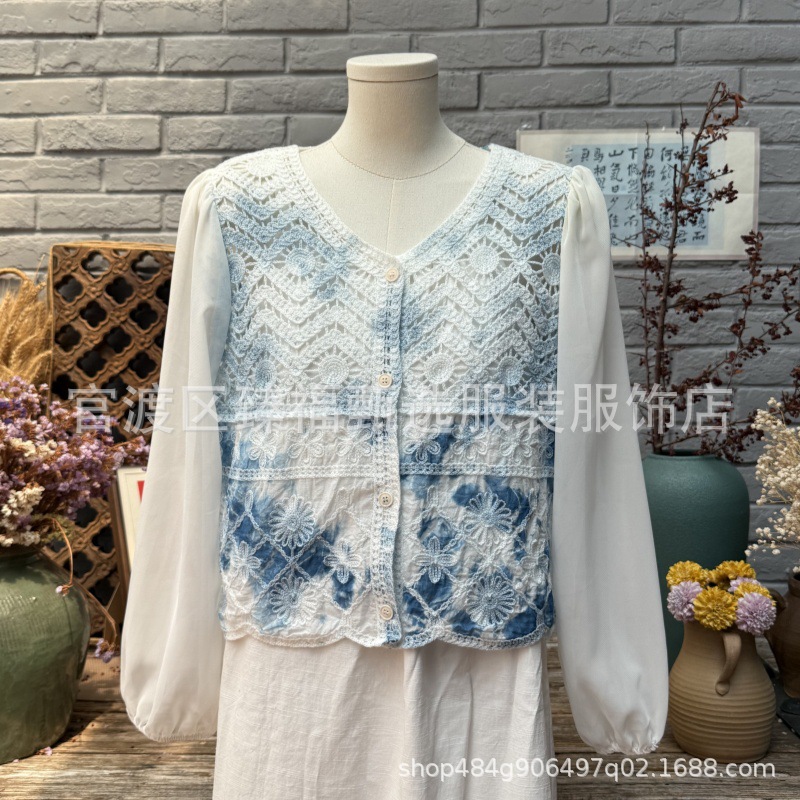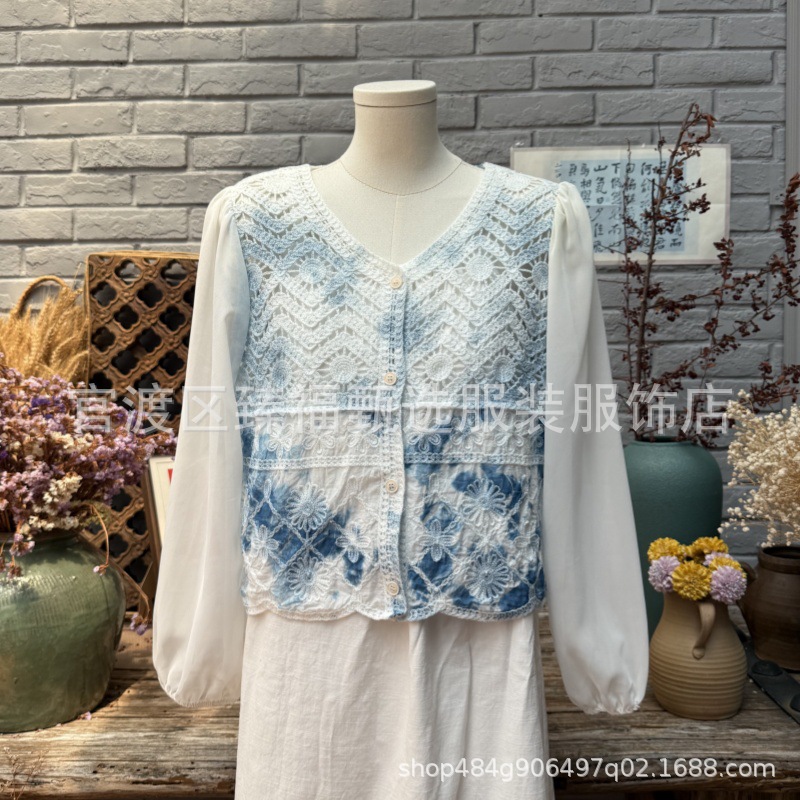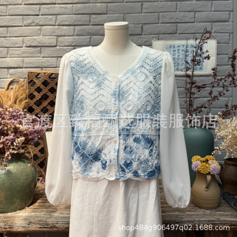 문학적이고 절묘한 부드러운 짧은 쉬폰 소매 니트 자수 크로셰 빈티지 V 넥 재킷 탑 카디건 컬렉션
