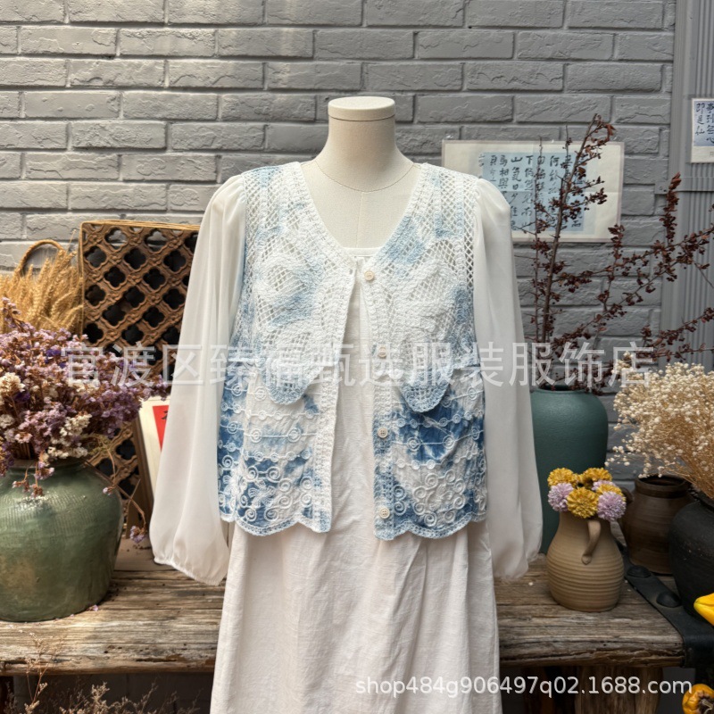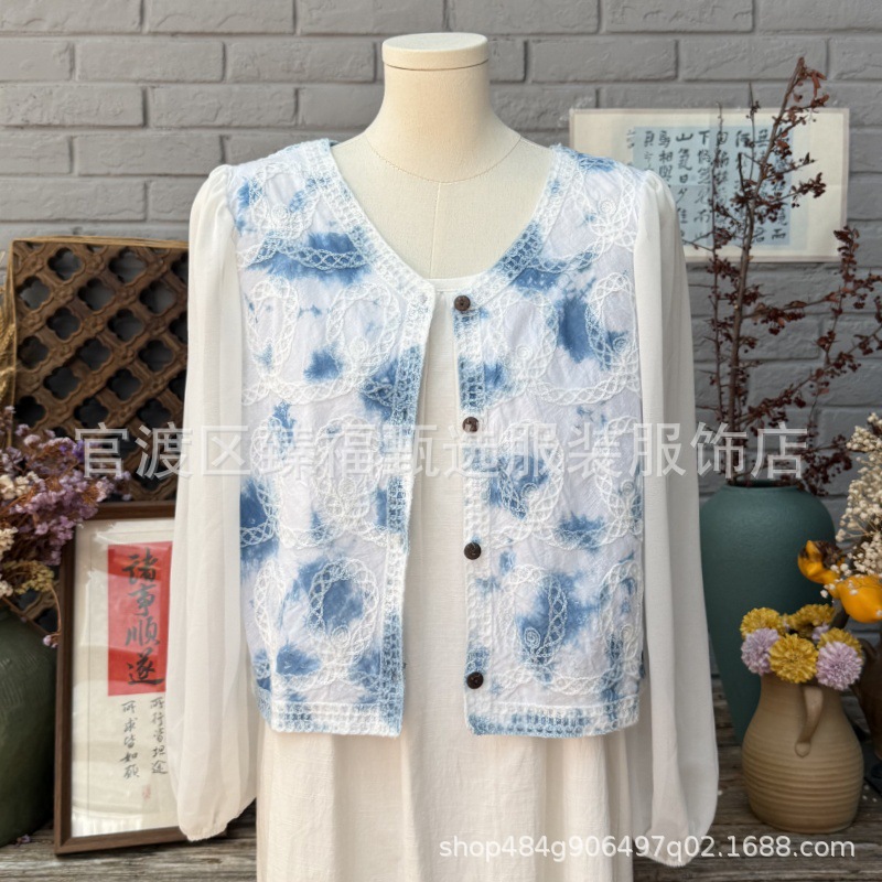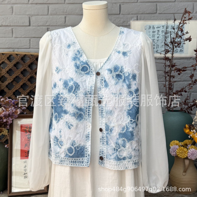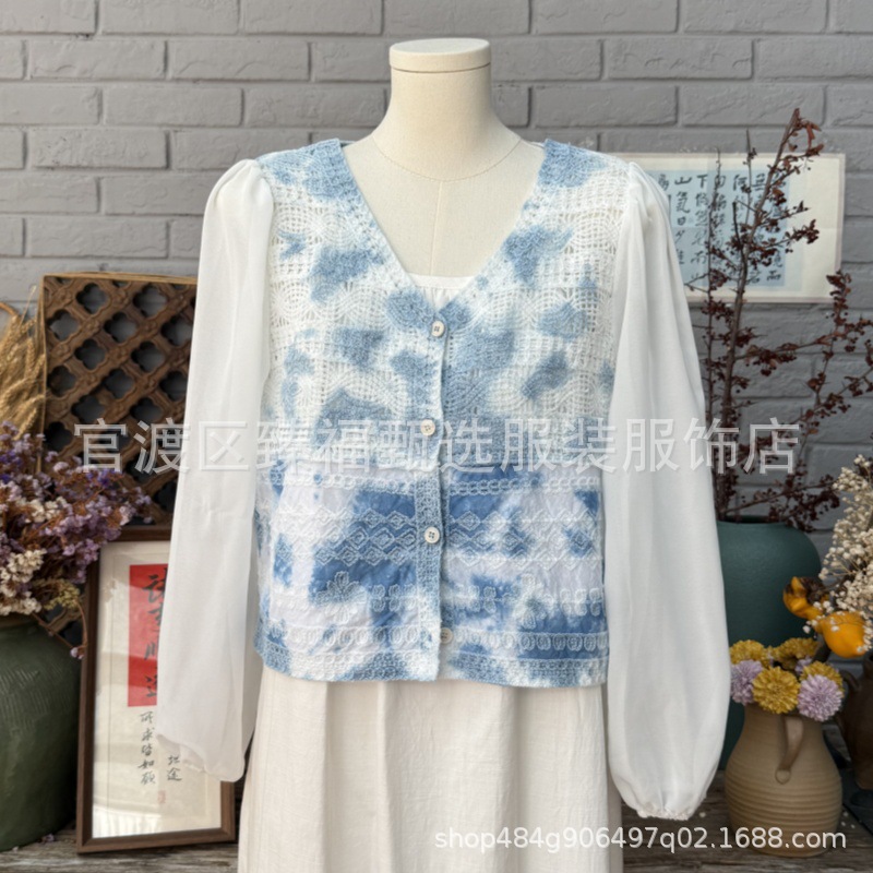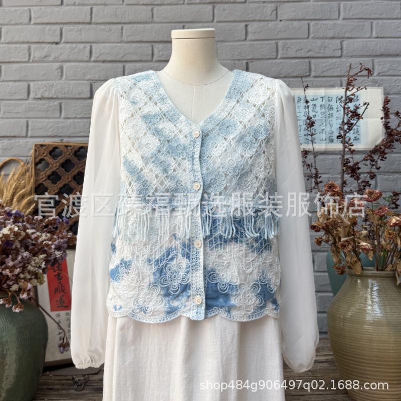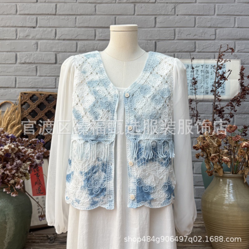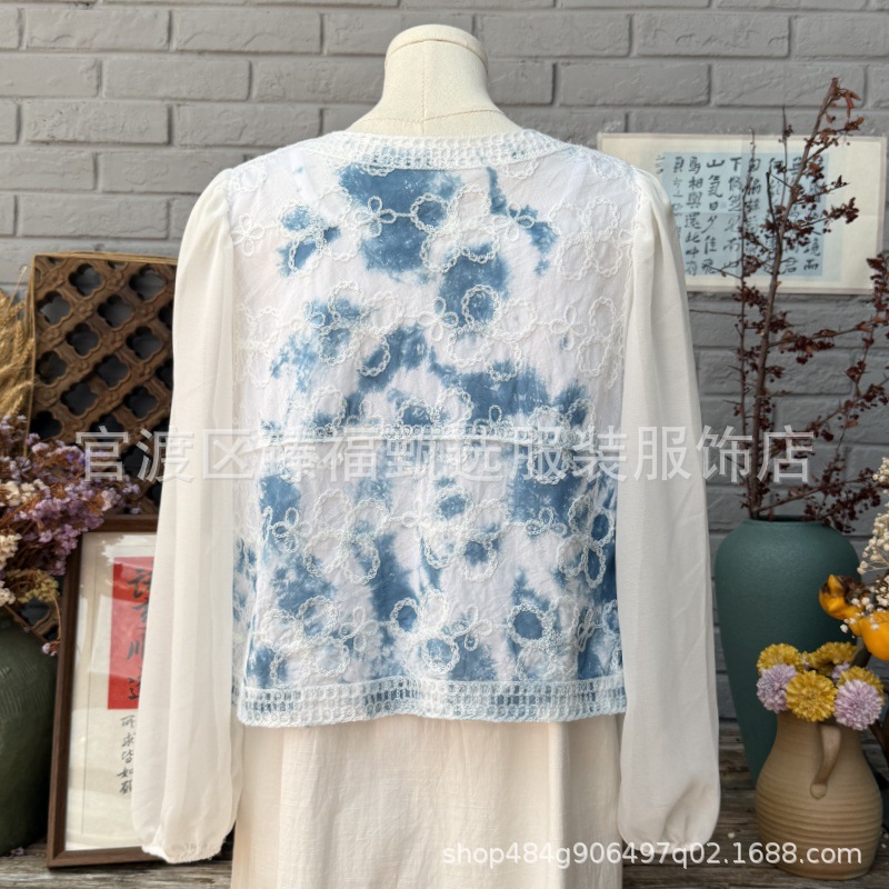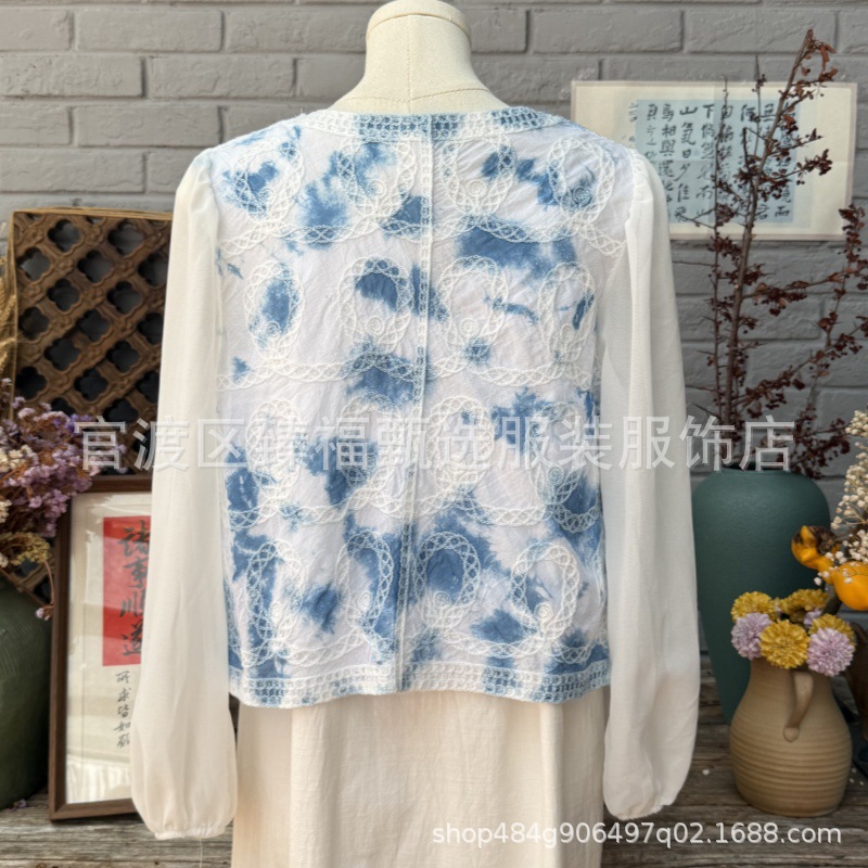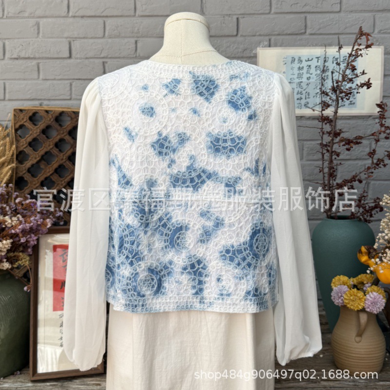 문학적이고 절묘한 부드러운 짧은 쉬폰 소매 니트 자수 크로셰 빈티지 V 넥 재킷 탑 카디건 컬렉션