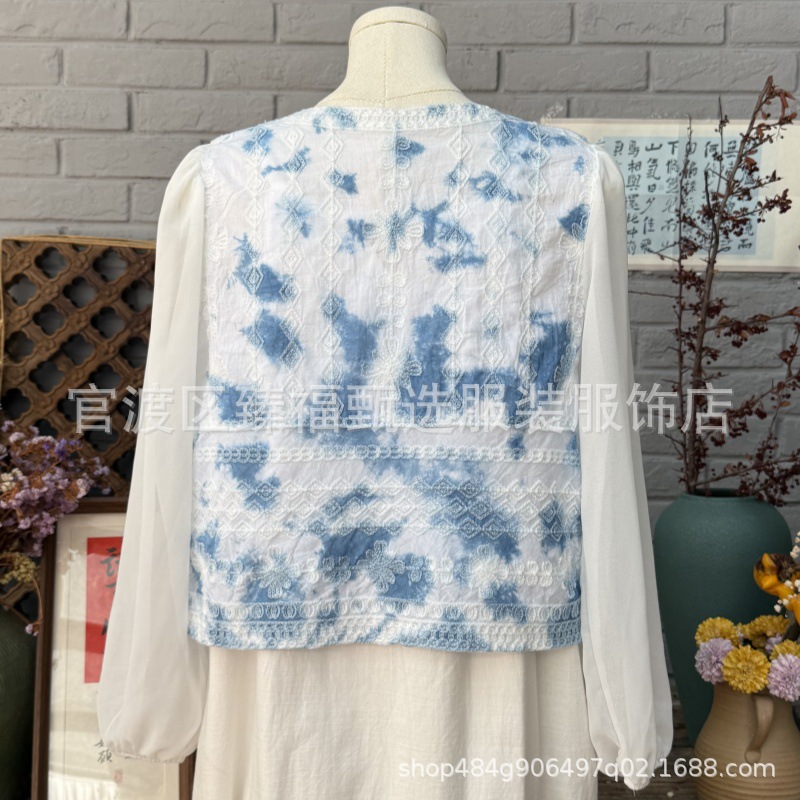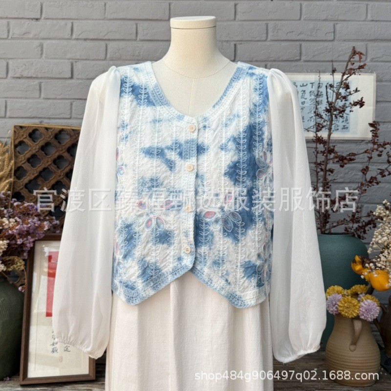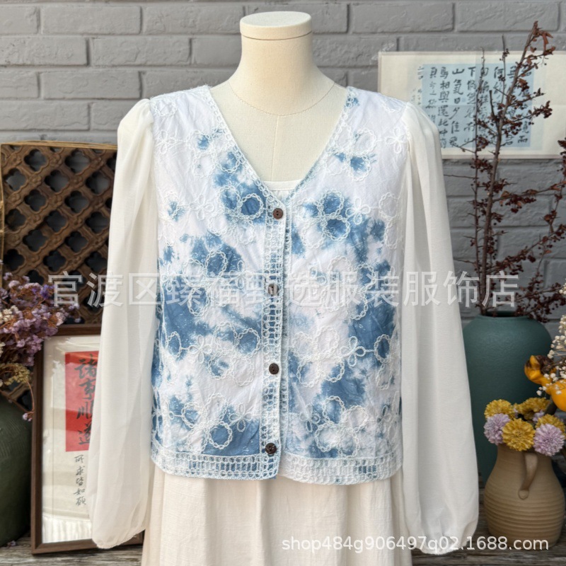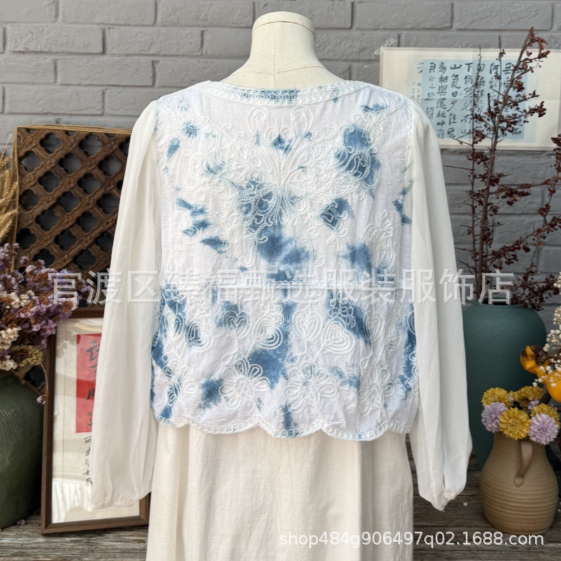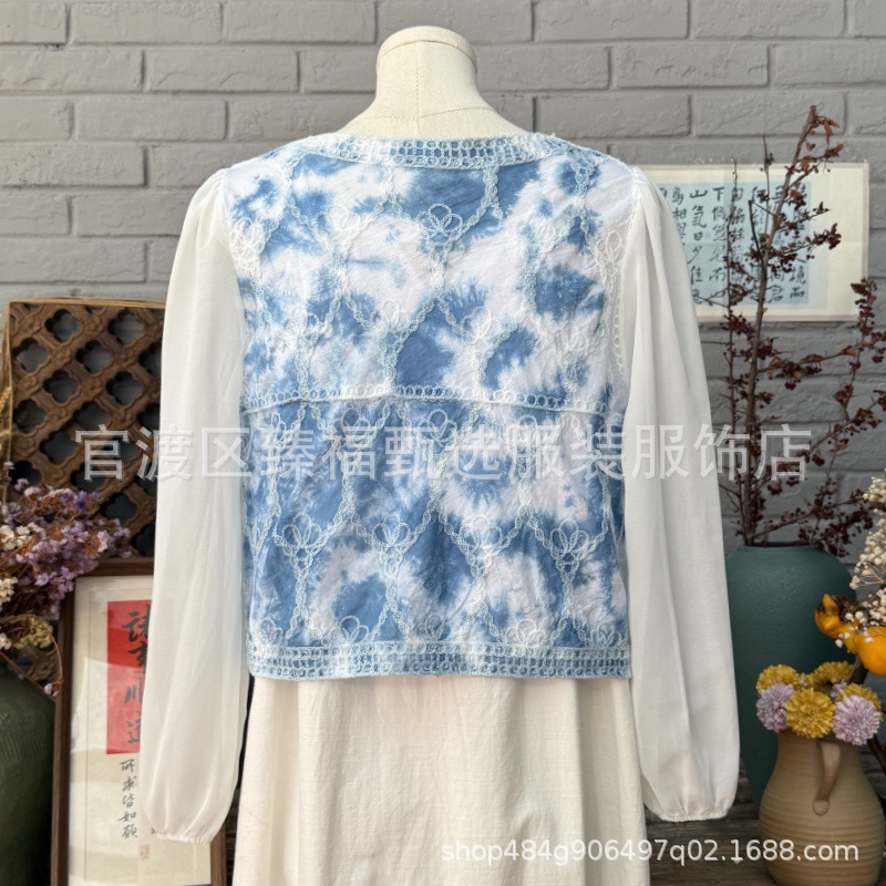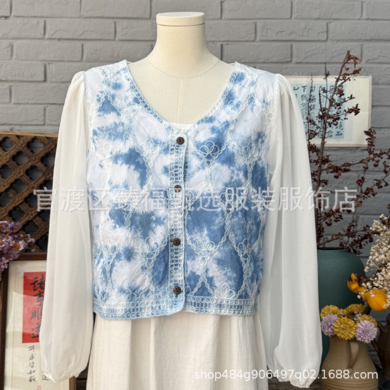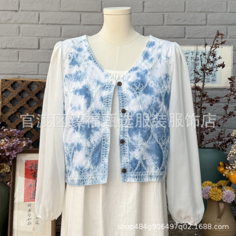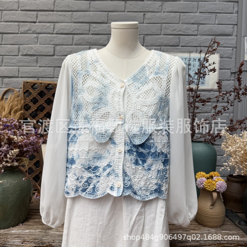 문학적이고 절묘한 부드러운 짧은 쉬폰 소매 니트 자수 크로셰 빈티지 V 넥 재킷 탑 카디건 컬렉션