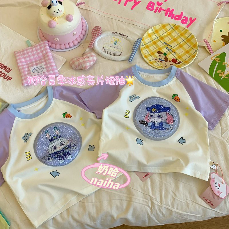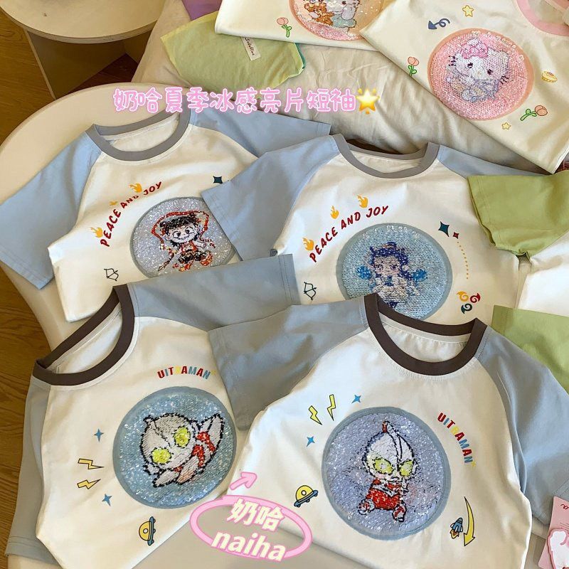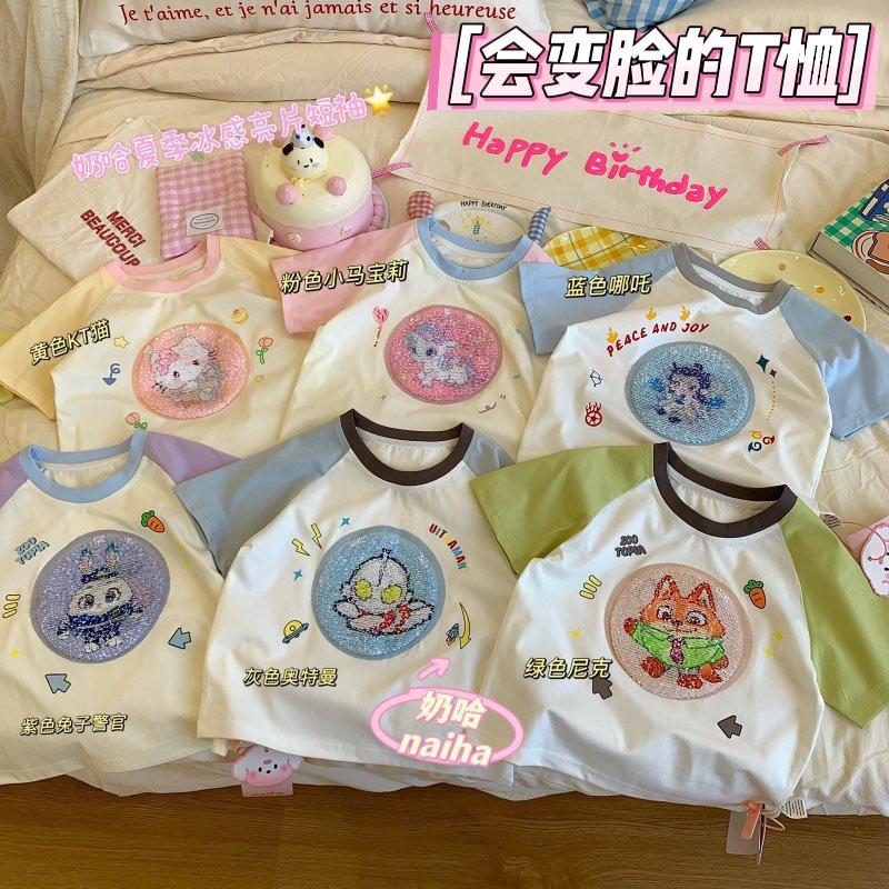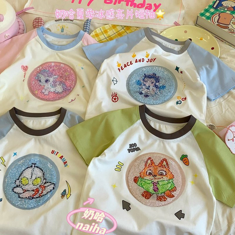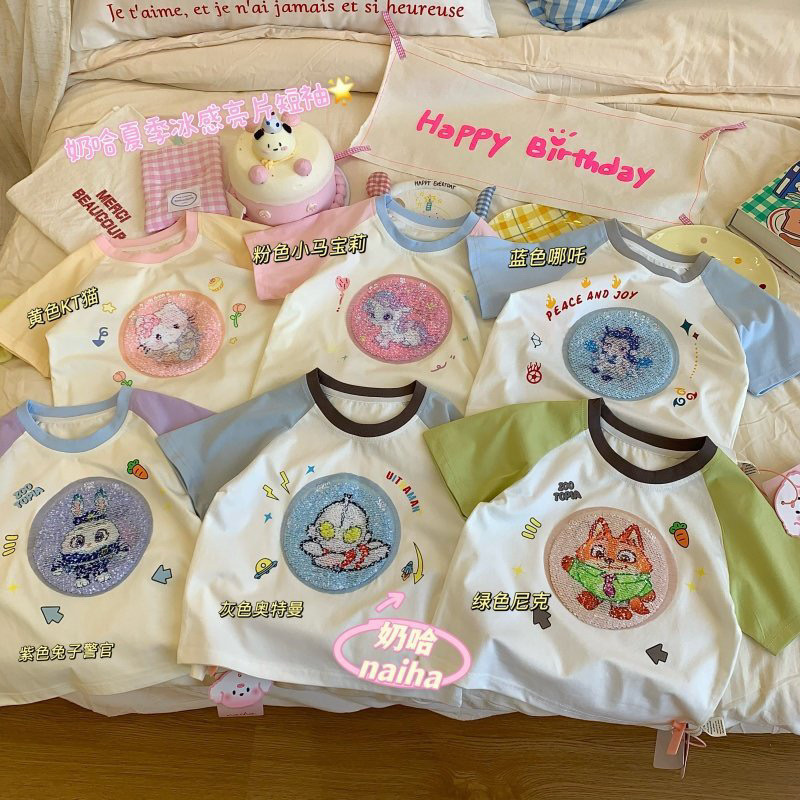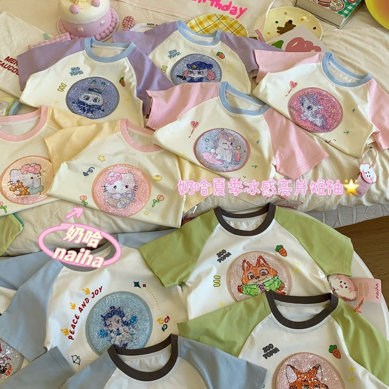 여름 새로운 만화 스타일 소년과 소녀 아기 귀여운 대비 색상 반팔 티셔츠 탑스토어 가기