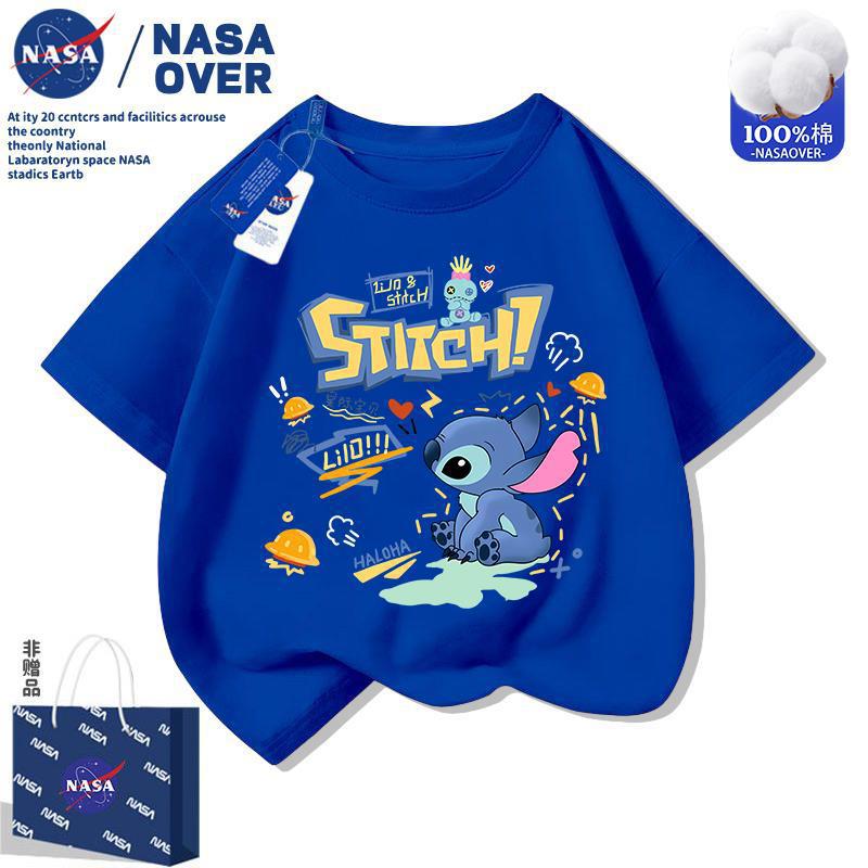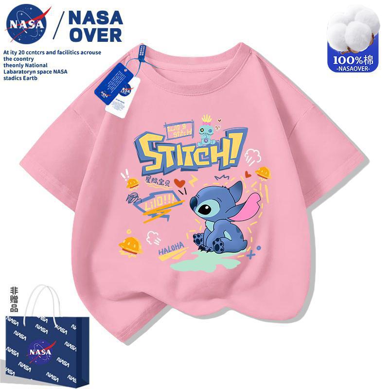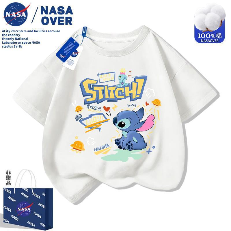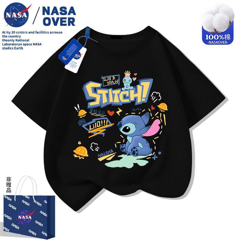 NASA 스티치 어린이 순면 반팔 티셔츠 2025 여름 새 스타일 만화 귀여운 소년과 소녀 라운드 넥 탑스토어 가기