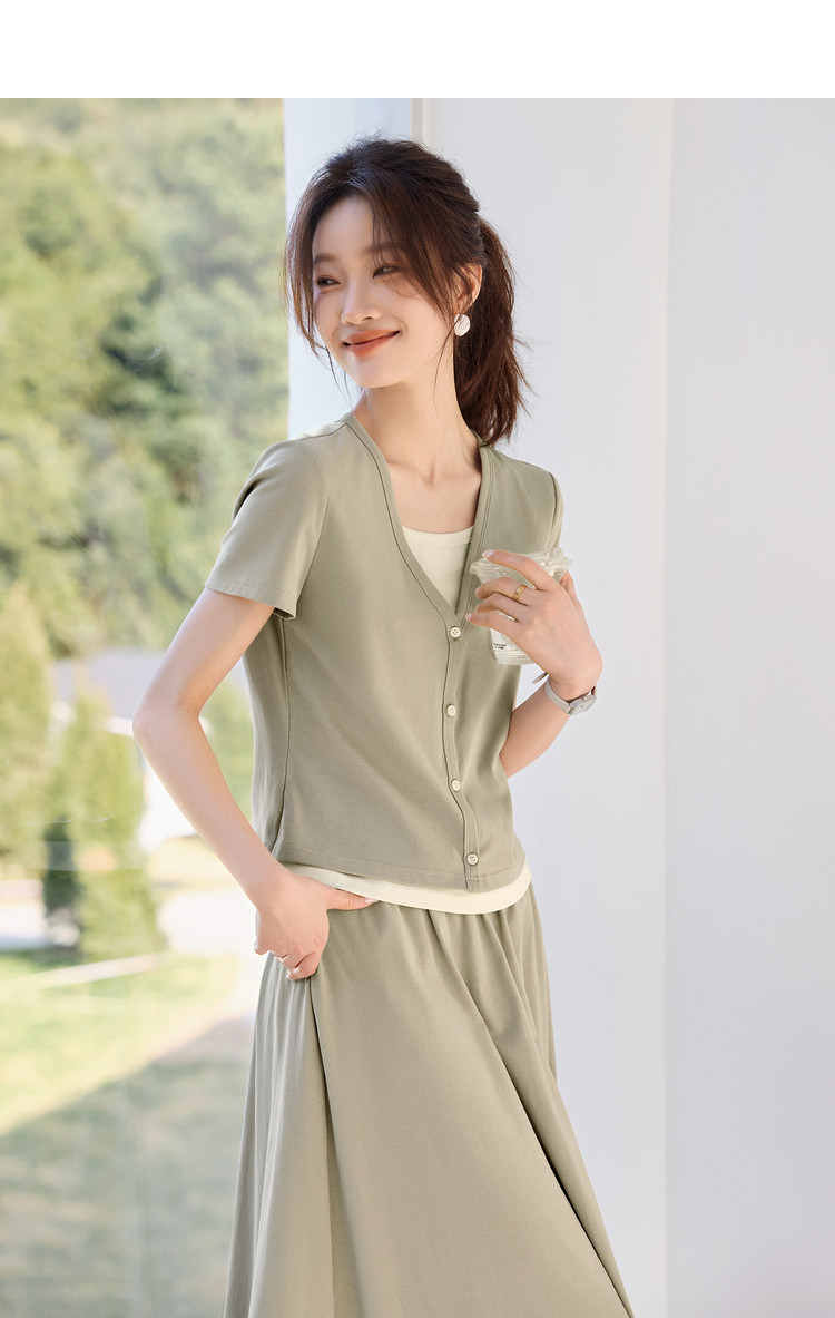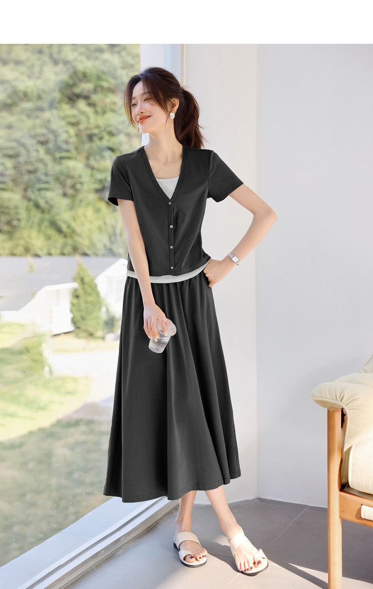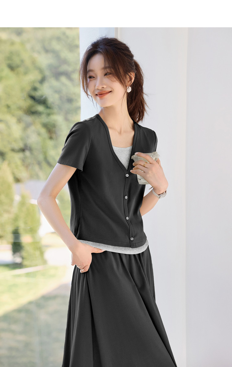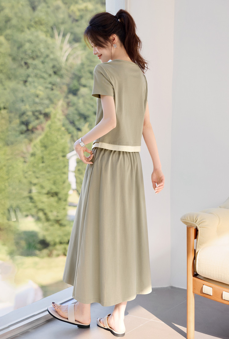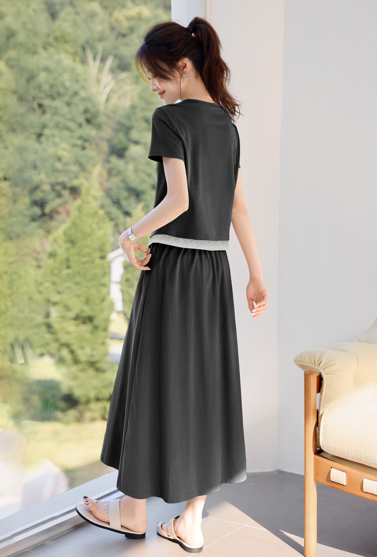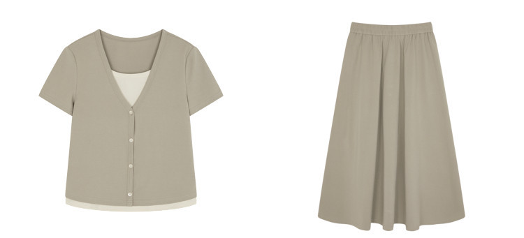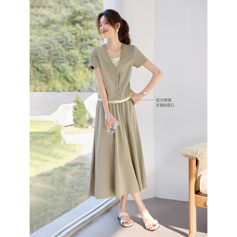 대비 컬러 가짜 투피스 캐주얼 티셔츠 스커트 세트 2025 여름 디자인 센스 여성 세트